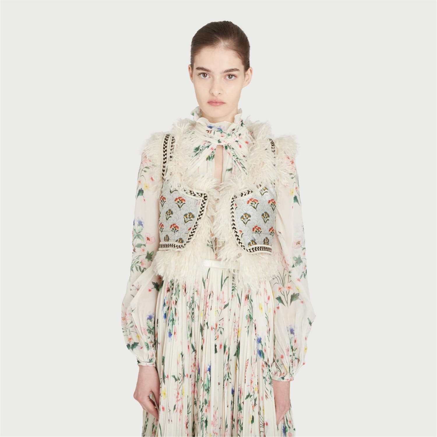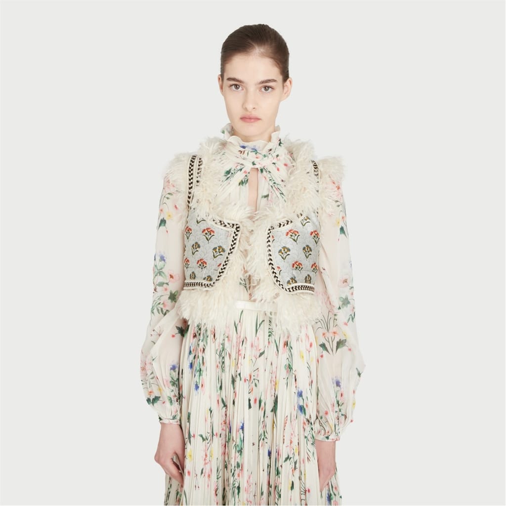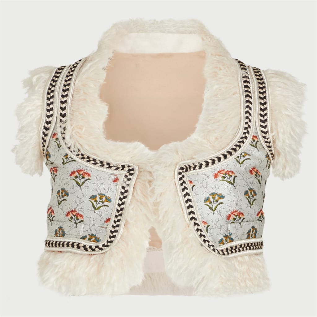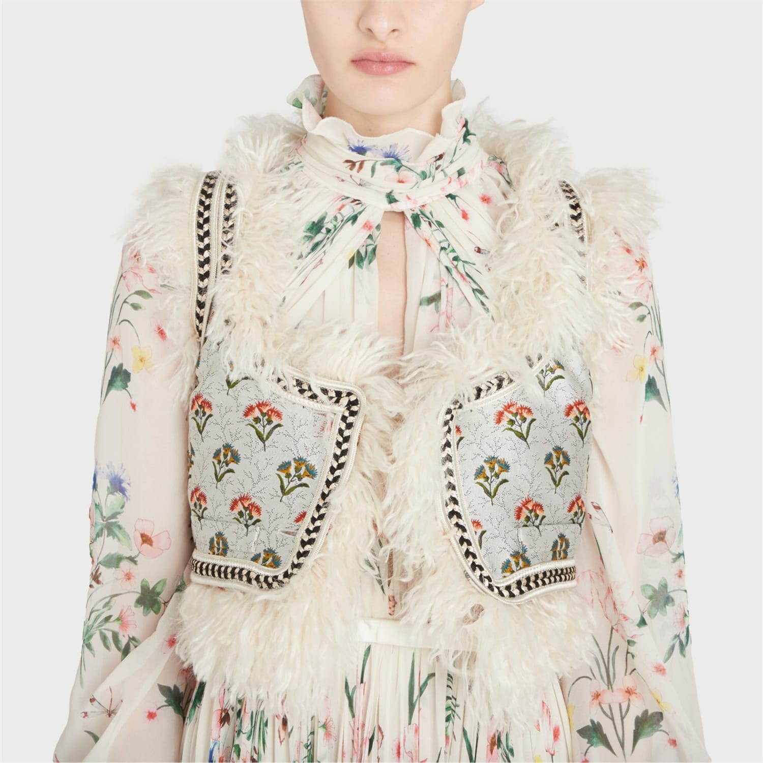 - Multicolored jacquard with ivory faux shearling for comfort and style