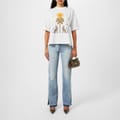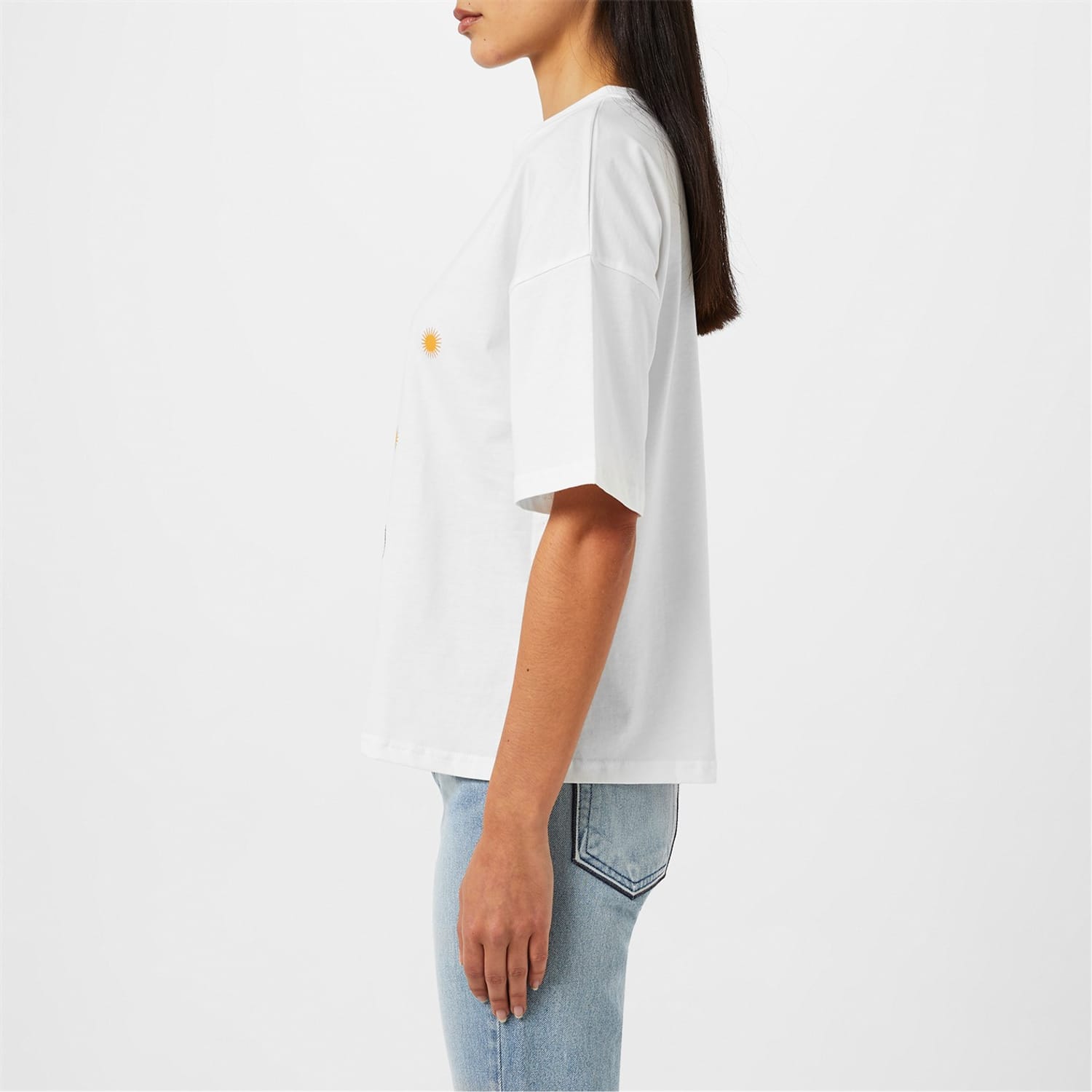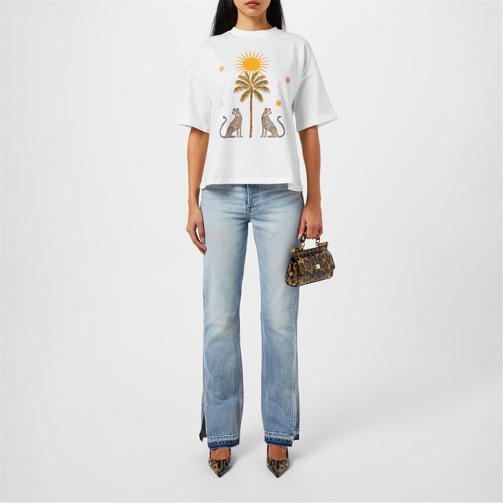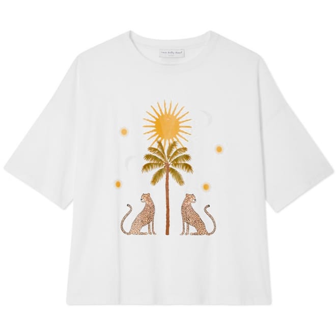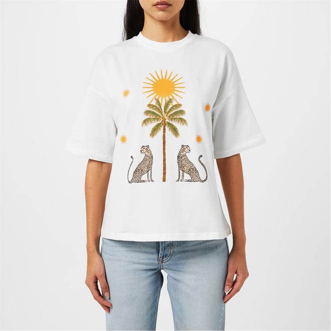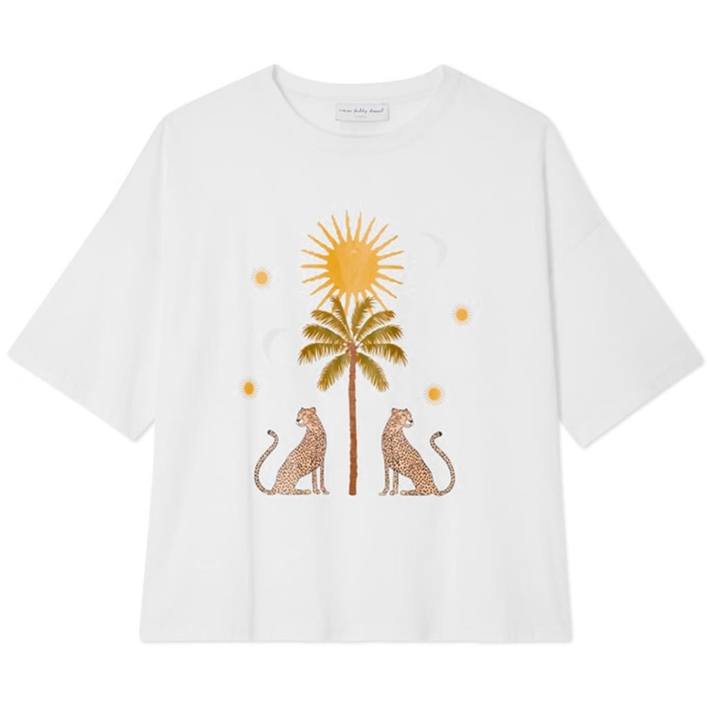 - This t-shirt also embraces your curves with a bump-friendly design, ensuring a comfortable and stylish experience. Adorned with bohemian-inspired leopard motifs, palms, and sunshine, this t-shirt exudes a sense of adventure and playful elegance. The relaxed fit and dropped shoulder seams offer a casual yet chic silhouette, versatile for various occasions. Whether you opt to casually tuck it into your favourite pair of jeans or dress it up with leather pants and heels, this piece is your go-to for effortless day-to-night transitions.