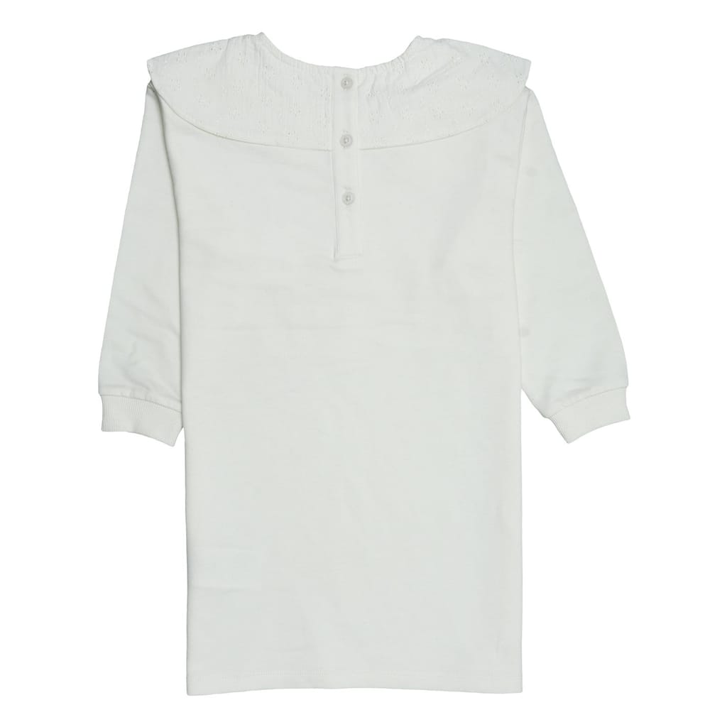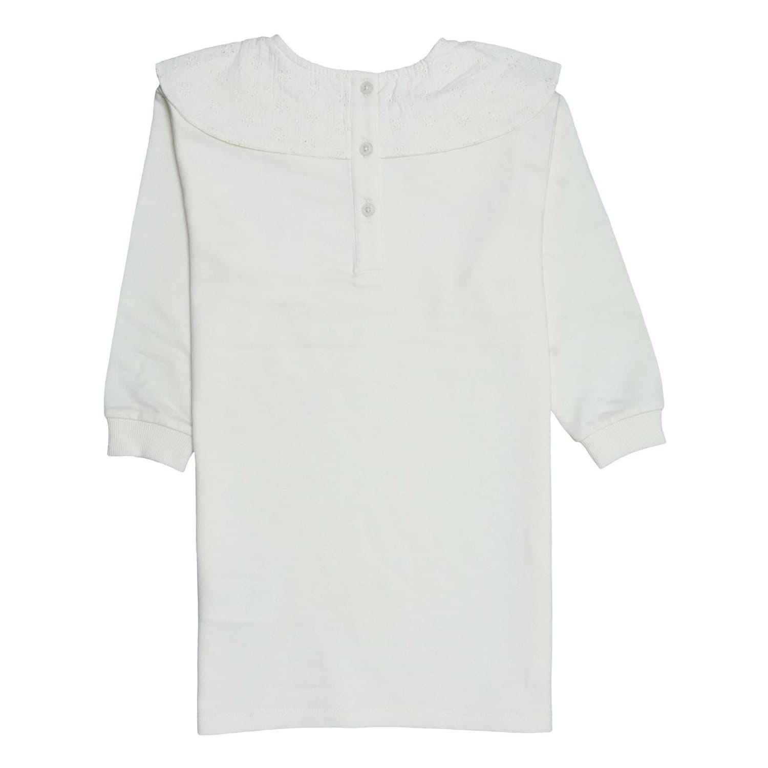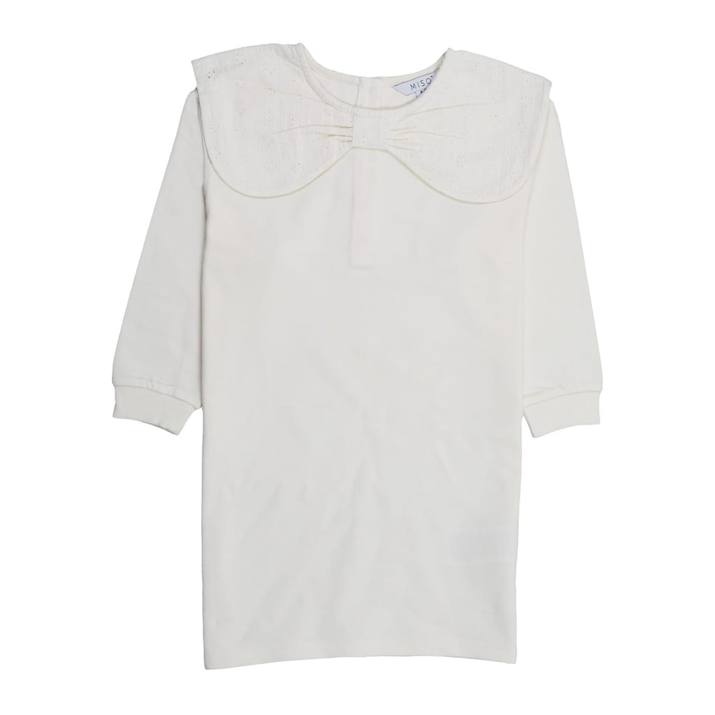 This Miso dress features a knee-length design with a crew neck and three-quarter sleeves. The solid pattern and regular fit offer a classic look, while the straight hem adds a touch of elegance. A bow embellishment completes the design, making it a versatile addition to any wardrobe. -