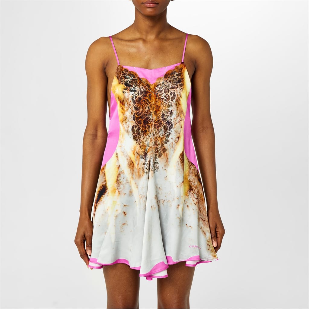 Epitomising Y/project's innovative approach to fashion, the Lace Print Satin Slip Dress is a wearable work of art that celebrates style individuality. Crafted from exquisite premium polyester satin, this satin dress indulges the senses with its sumptuous touch and luxurious drape. The square neckline graciously frames the décolletage, while the adjustable spaghetti straps offer a custom fit, ensuring comfort and confidence with every wear.