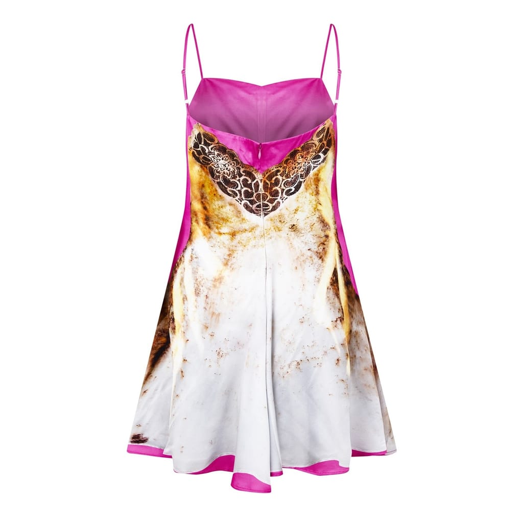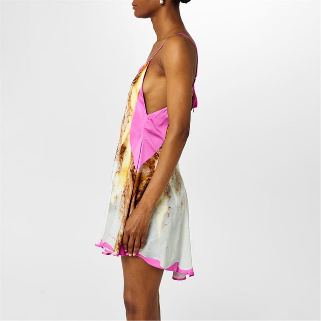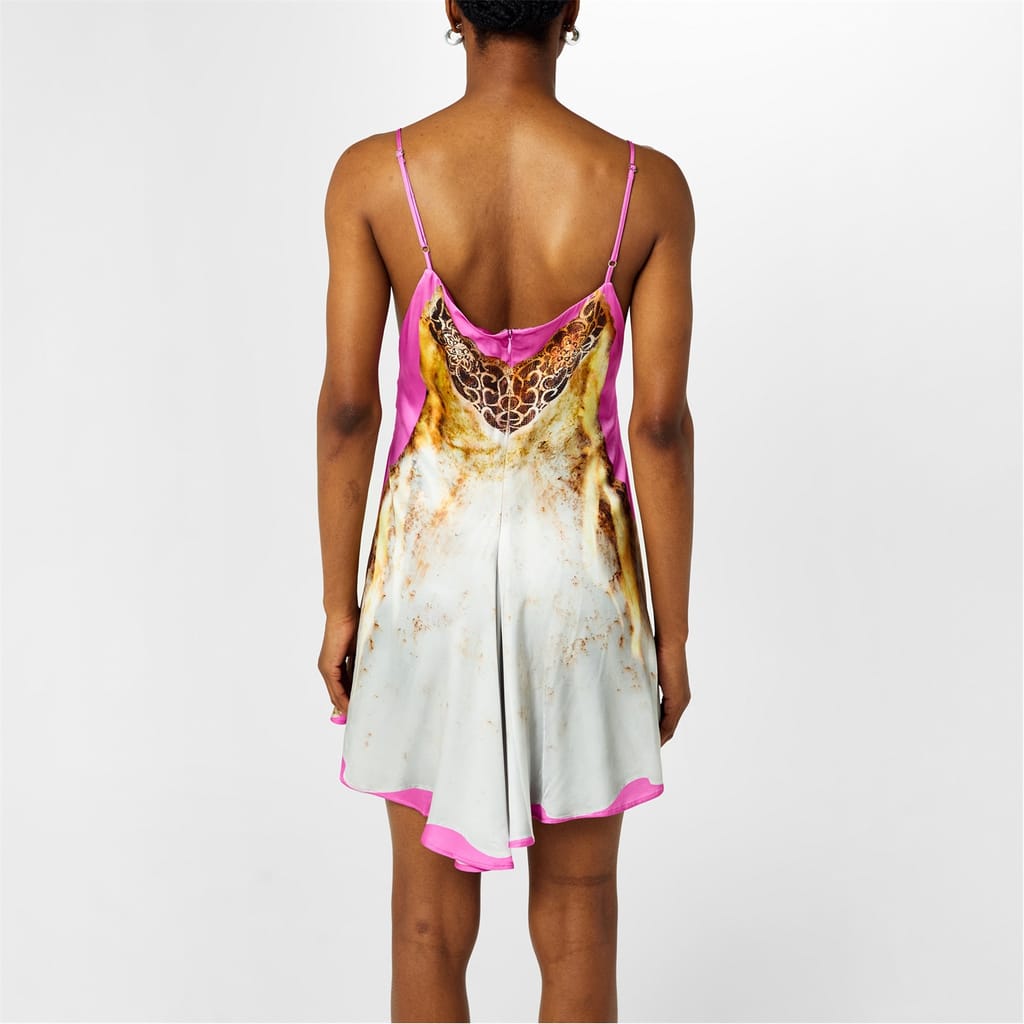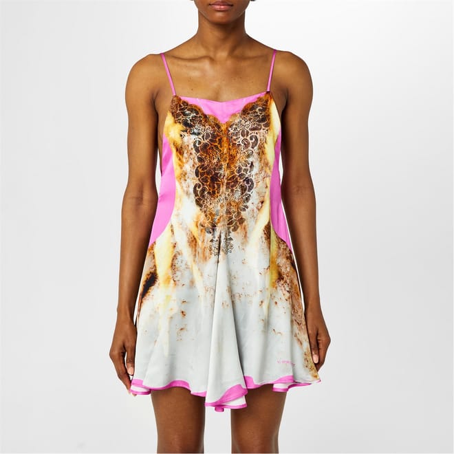 - Designed with a flared skirt, beautiful movement is created with every step. Complemented by a concealed rear zip fastening, the mini dress' clean silhouette is maintained, guaranteeing nothing disrupts the exquisite detailing and shape. Highlighting the label's supervision of traditional femininity, this dress features a graphic print on the front and back, meticulously curated to mirror the intricate lace detailing and captivating shape of a slip dress. With its mini length, this printed dress is designed to captivate on any occasio -
