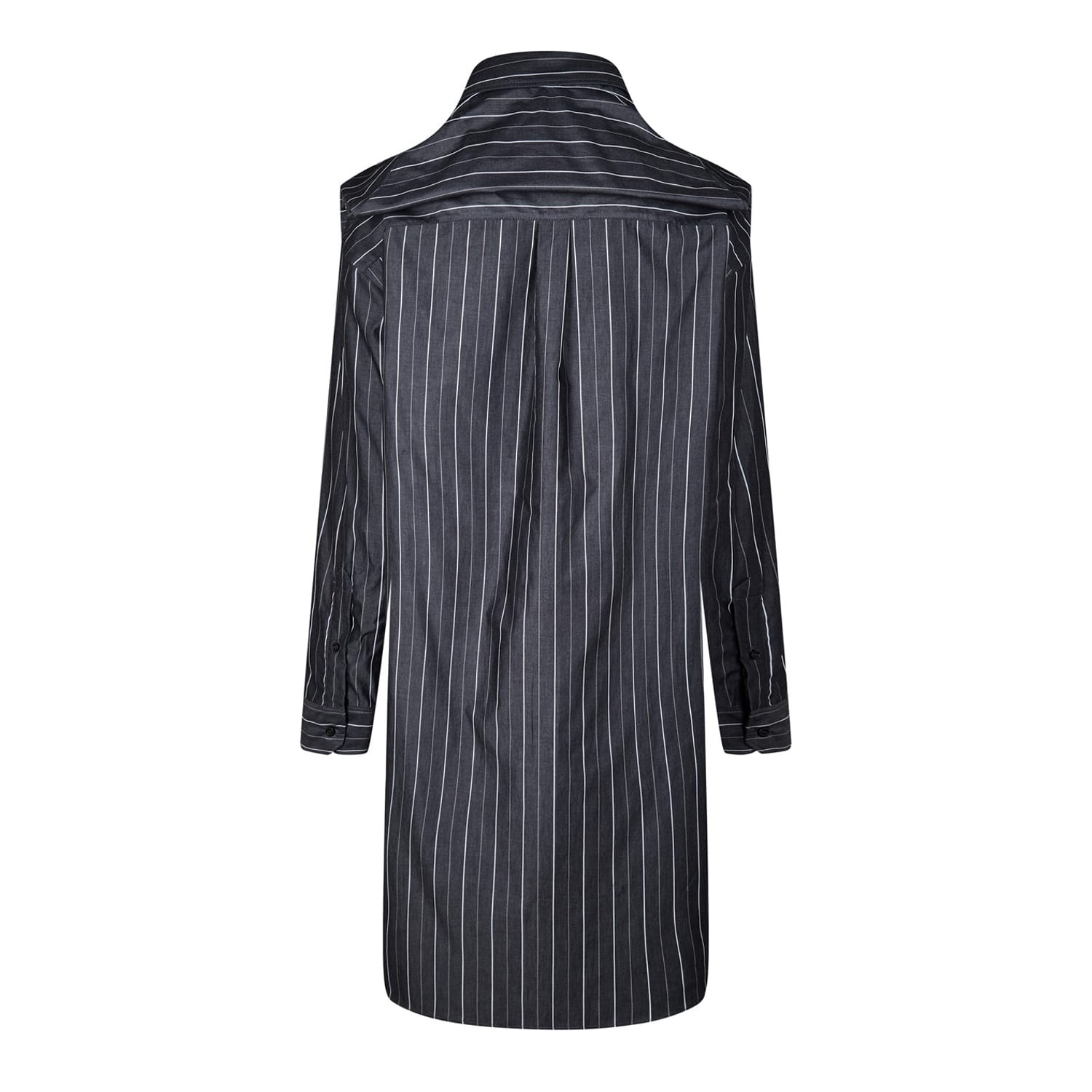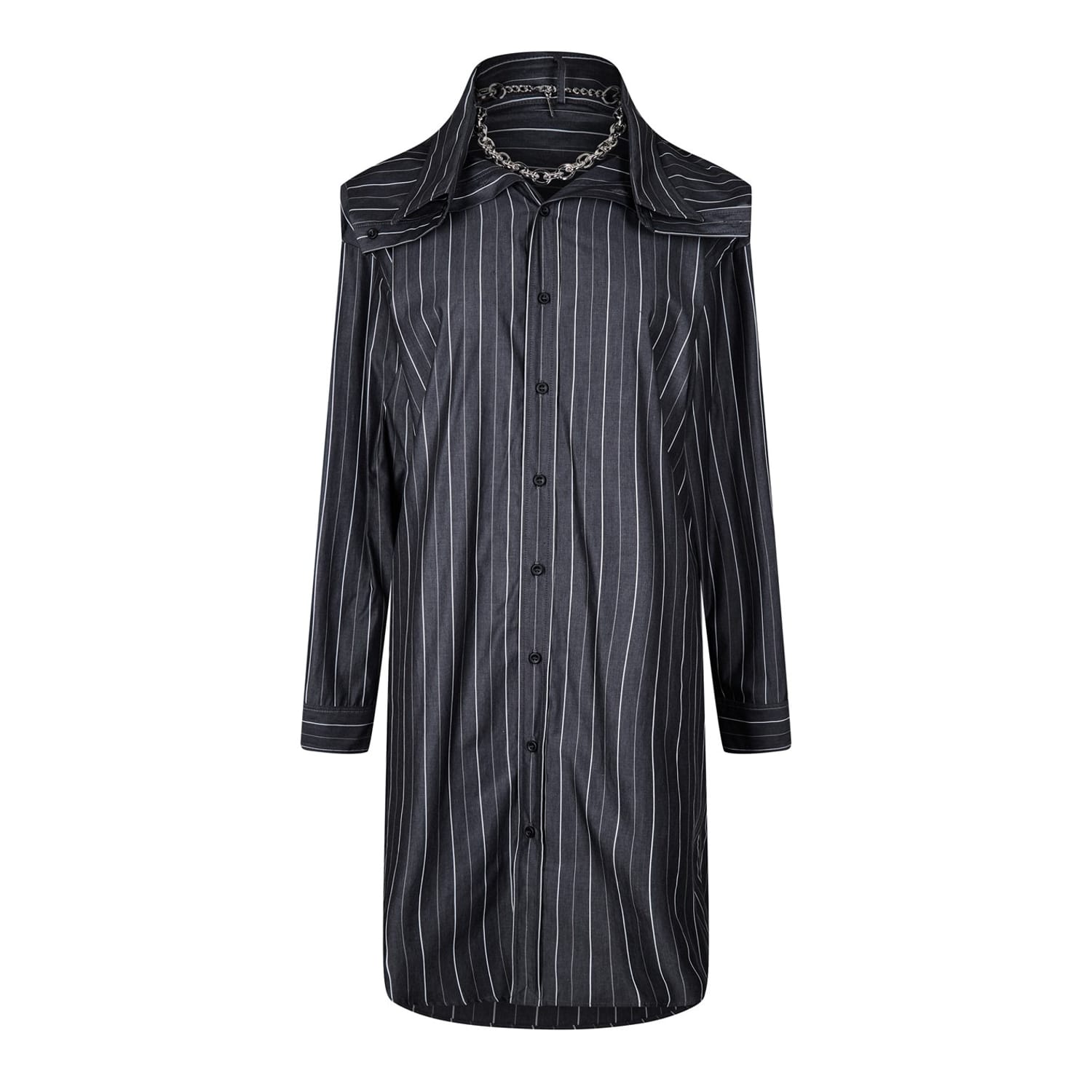 This Y/Project shirtdress is a sophisticated addition to your wardrobe. Featuring a knee-length design with a shirt collar and a collared neckline, it offers a classic look. The dress is adorned with a chain embellishment and showcases a vertical stripe pattern. It has long sleeves and a straight hem, with a button closure for a refined finish. -