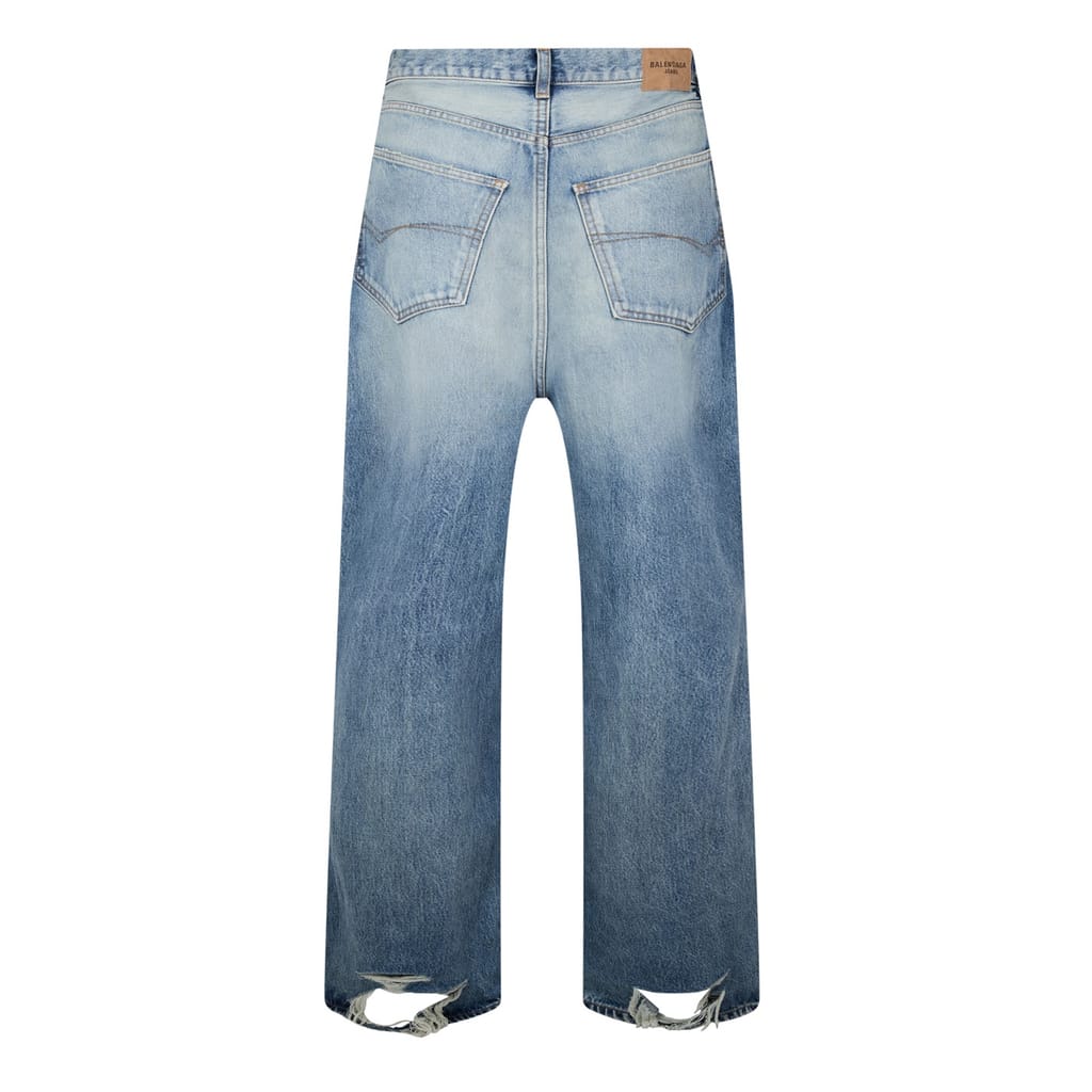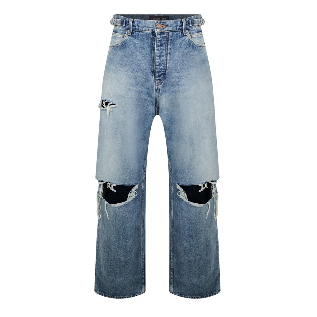 Discover Balenciaga's distressed wide-leg jeans, featuring a button and zip fly closure. These jeans are designed with a wide leg cut and include practical pockets, offering both style and functionality. Perfect for those seeking a contemporary and edgy look. -