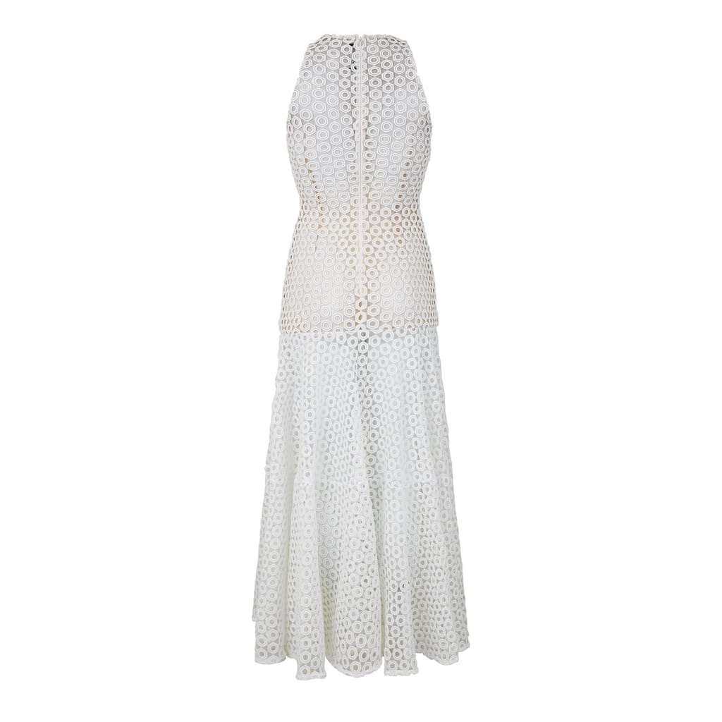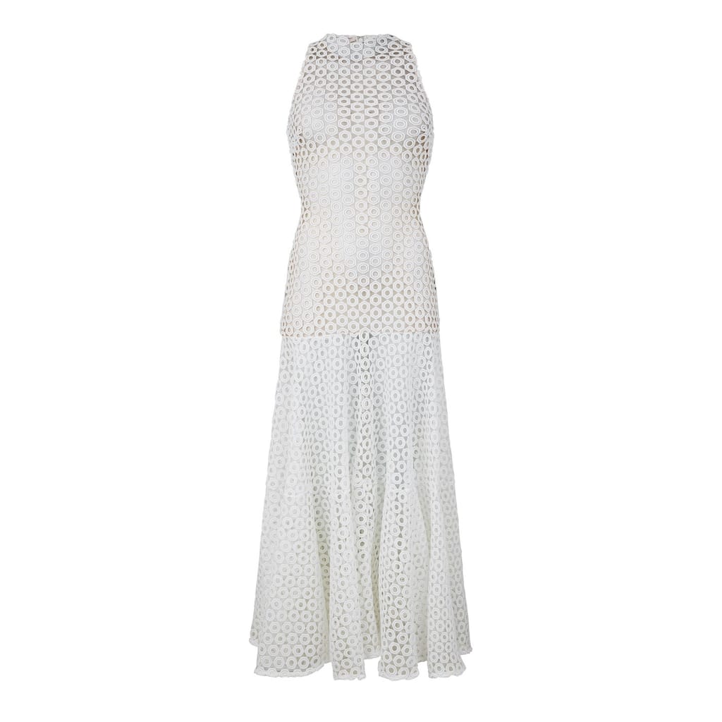 This David Koma maxi dress features a striking geometric pattern and a sophisticated high neck. The sleeveless design adds a touch of elegance, making it a perfect choice for various occasions. Crafted with attention to detail, this dress embodies a modern aesthetic while maintaining a timeless appeal. -