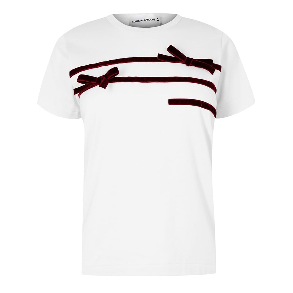 Discover the Comme des Garçons t-shirt, part of the casual collection. This regular fit top features a charming bow embellishment, short sleeves, and a classic crew neck. The ribbed collar adds a subtle touch, perfect for everyday wear. Crafted for those who appreciate understated design and quality. -