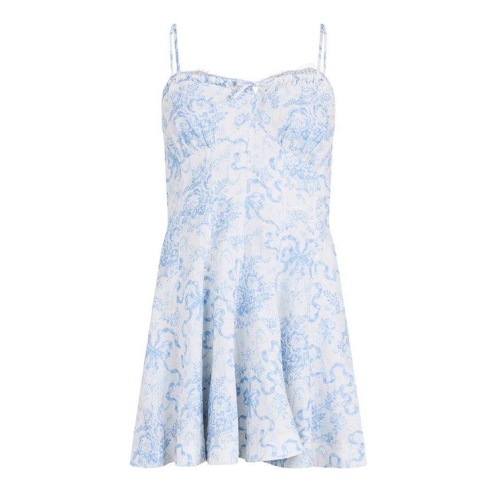 This Love Shack Fancy mini dress features a charming sweetheart neckline and a delicate spaghetti strap design. The A-line silhouette is adorned with a floral pattern, offering a timeless appeal. Perfect for those seeking a blend of elegance and style. -