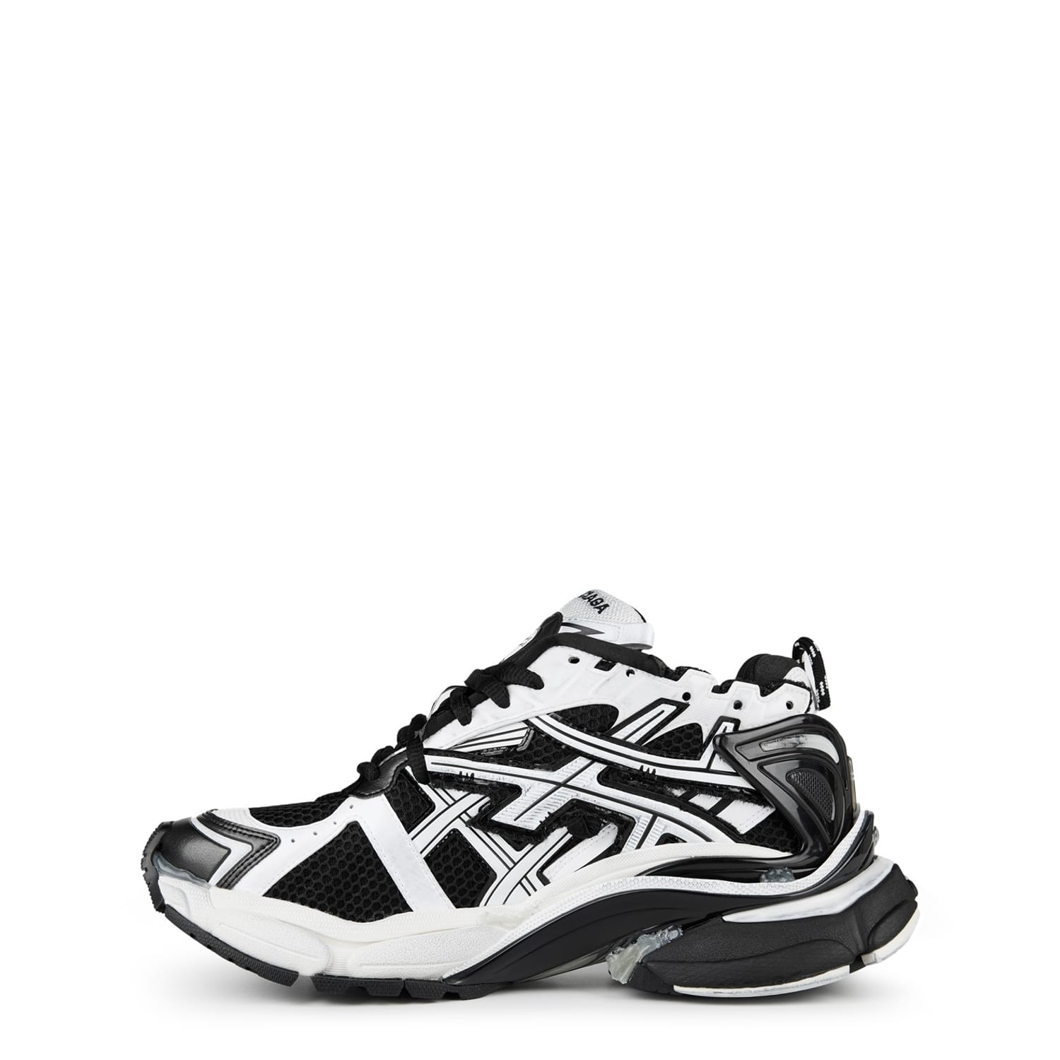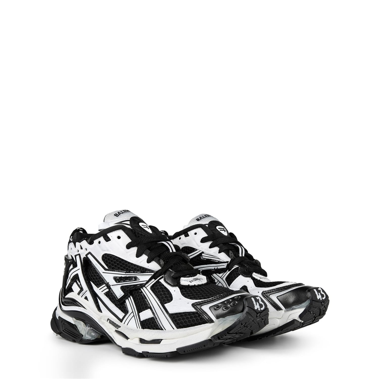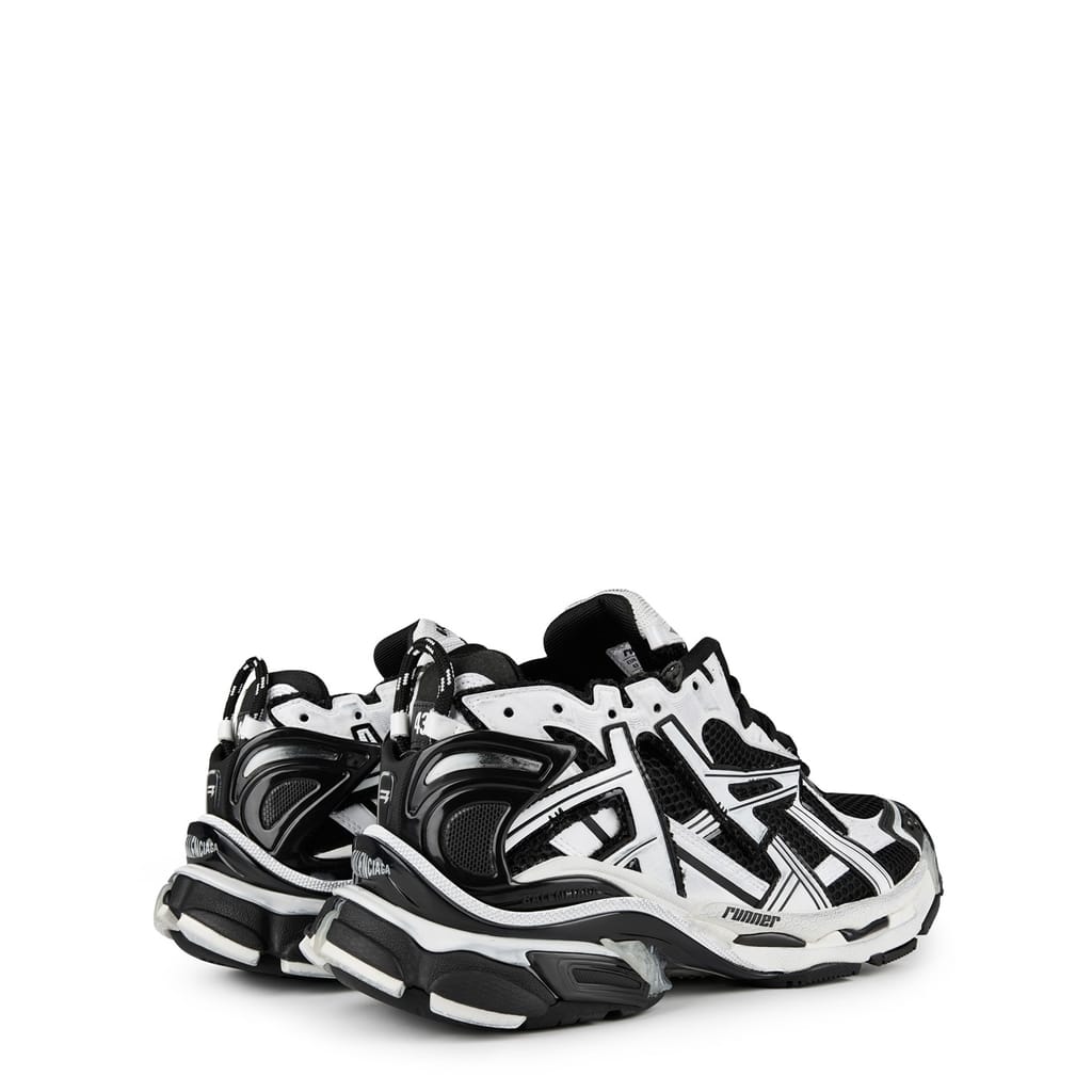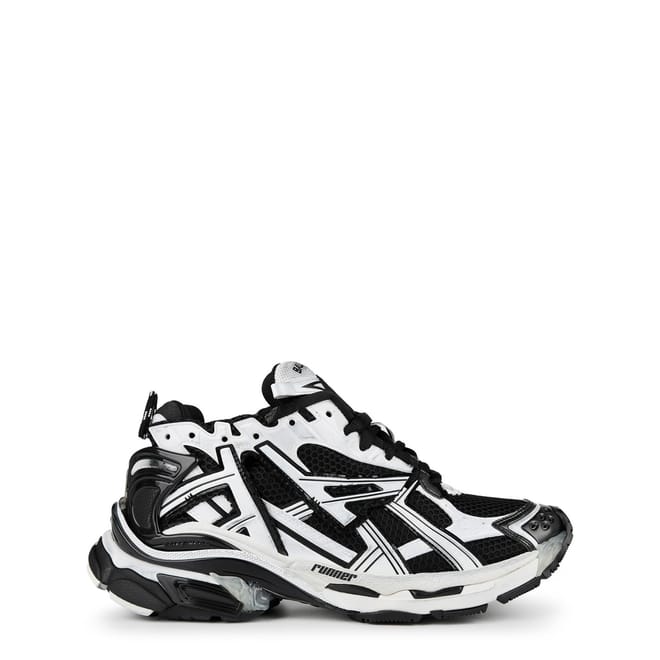 Elevate your casual weekend ensemble selection with these Balenciaga Runner Sneakers. These runners have been crafted with a distressed effect finish, front lace closure, a heel pull tab and a padded ankle collar for comfort. Designed with a mesh upper for breathability, the piece is complimented with panelling overlays across the front and back. The outsole has a chunky moulded design for grip with a distinct look for a layered effect, whilst the iconic Balenciaga branding throughout completes the aesthetic for true brand appreciation. Complete with luxury branded packaging. -