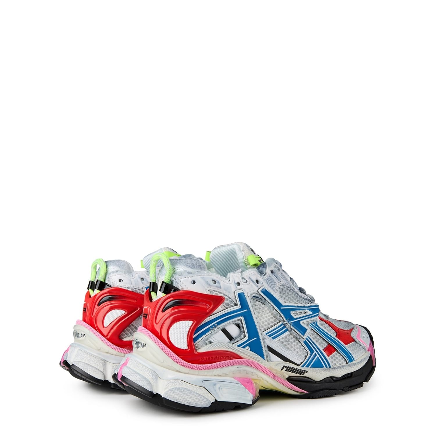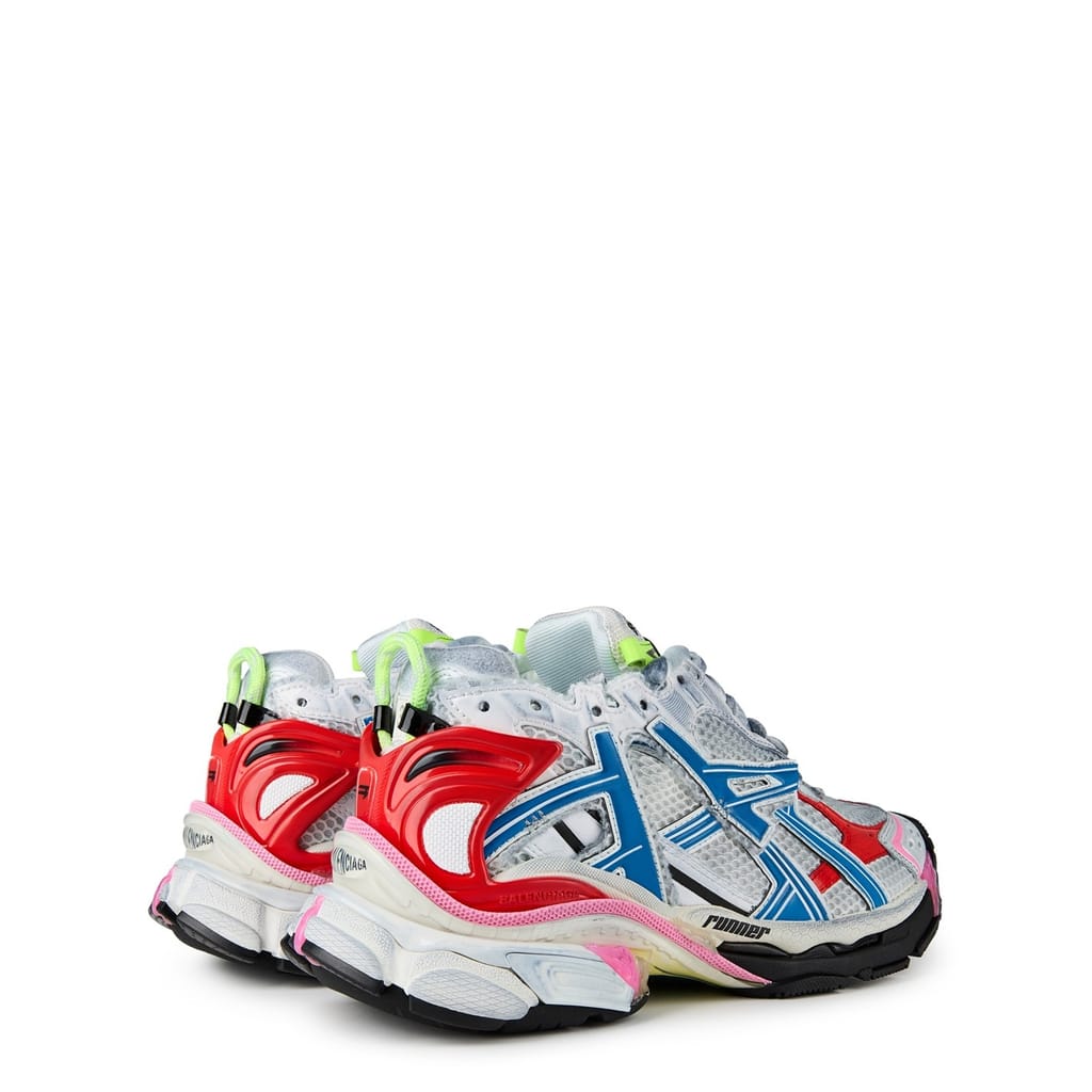 Elevate your casual weekend ensemble selection with these Balenciaga Runner Sneakers. These runners have been crafted with a distressed effect finish, front lace closure, a heel pull tab and a padded ankle collar for comfort. Designed with a mesh upper for breathability, the piece is complimented with panelling overlays across the front and back. The outsole has a chunky moulded design for grip with a distinct look for a layered effect, whilst the iconic Balenciaga branding throughout completes the aesthetic for true brand appreciation. Complete with luxury branded packaging. -
