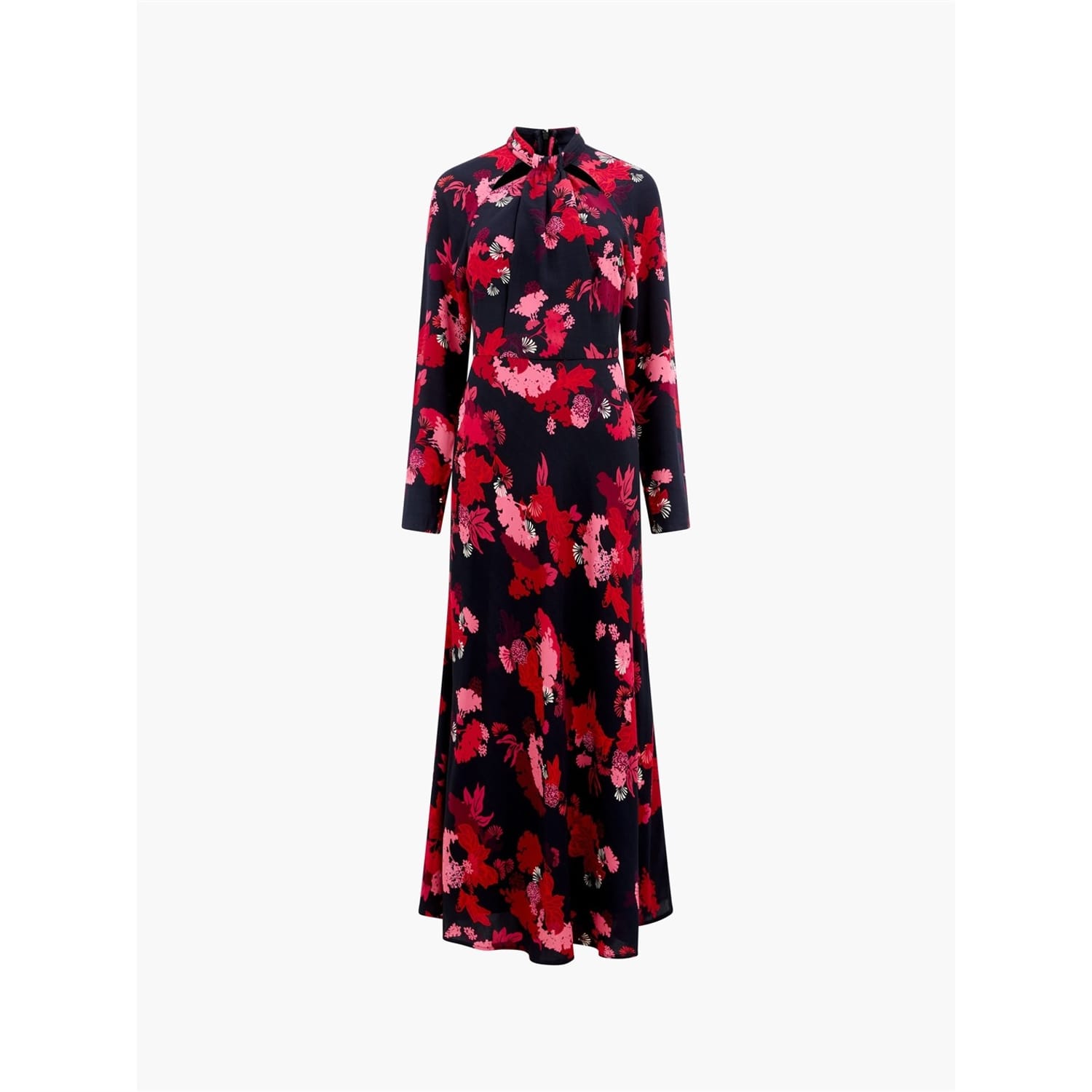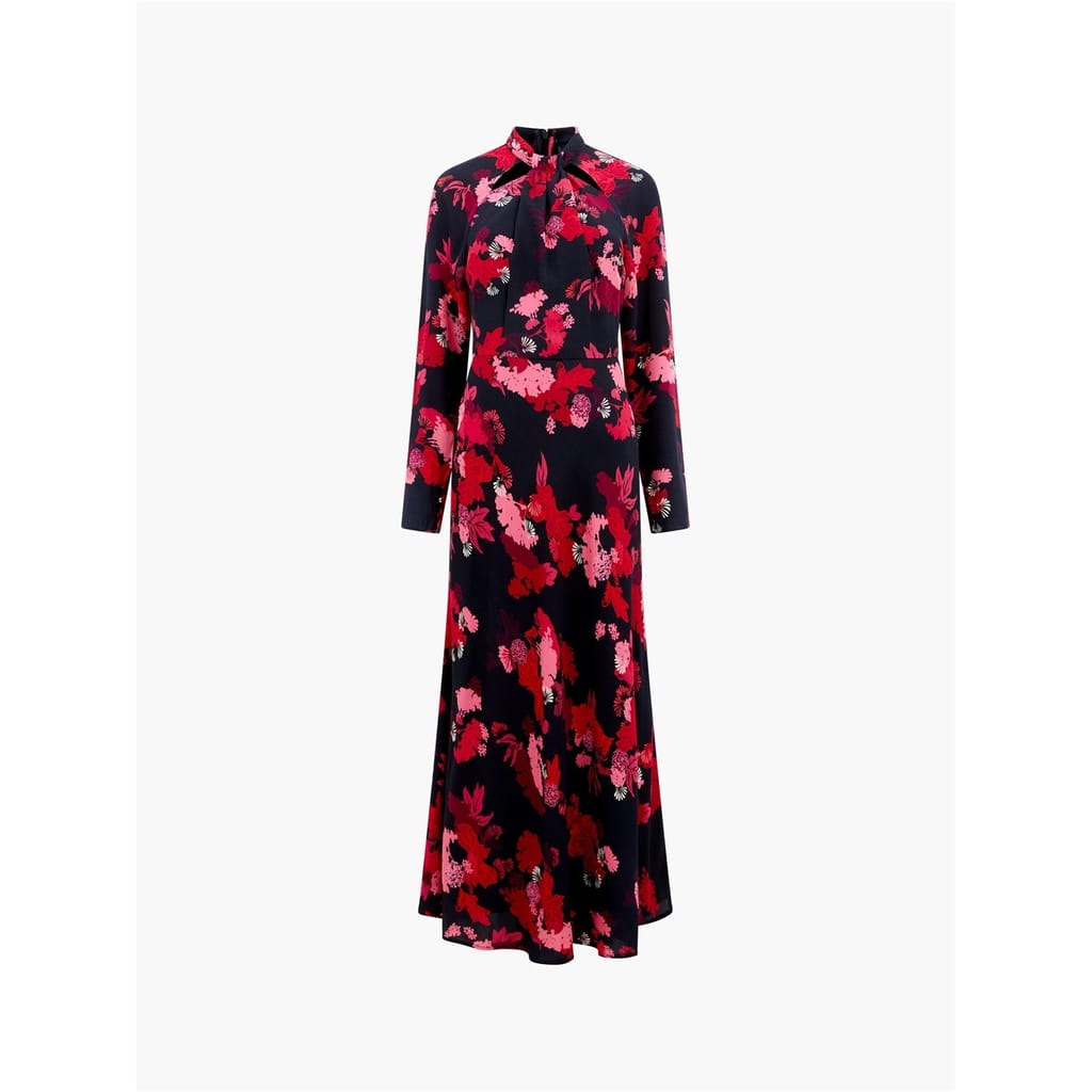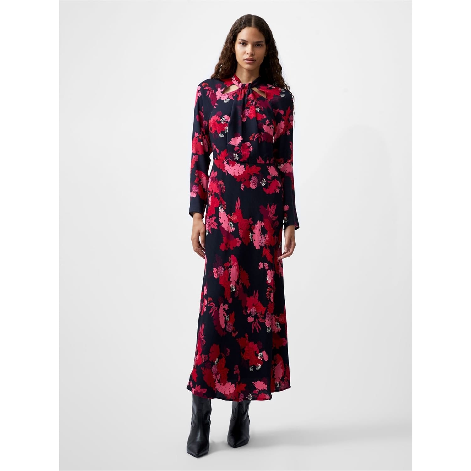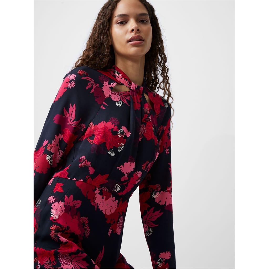 This French Connection maxi dress features a charming floral pattern, perfect for adding a touch of elegance to your wardrobe. The dress is designed with a tie neck and long sleeves, offering a sophisticated look. With its regular fit, it ensures comfort and style for any occasion. -