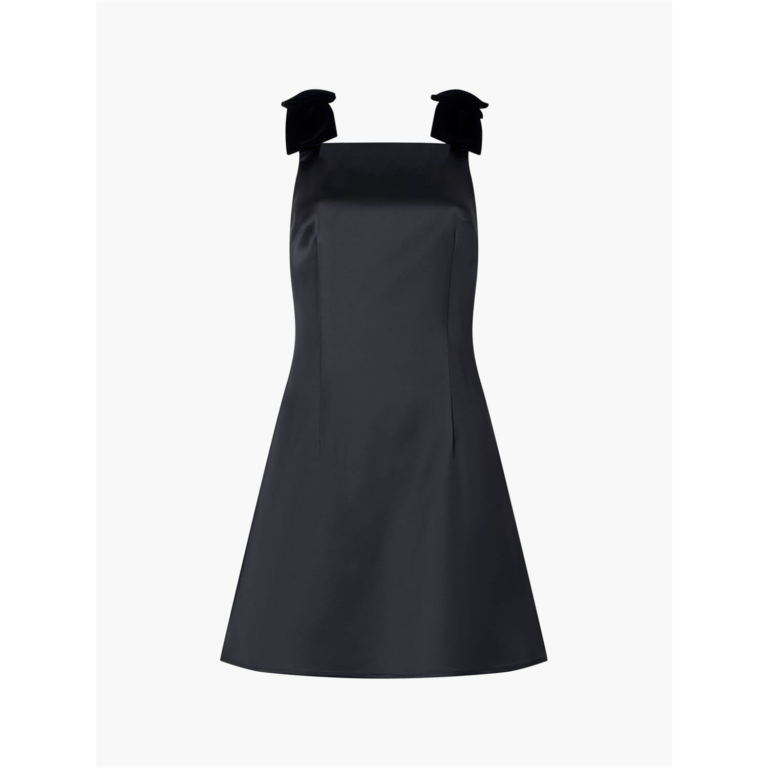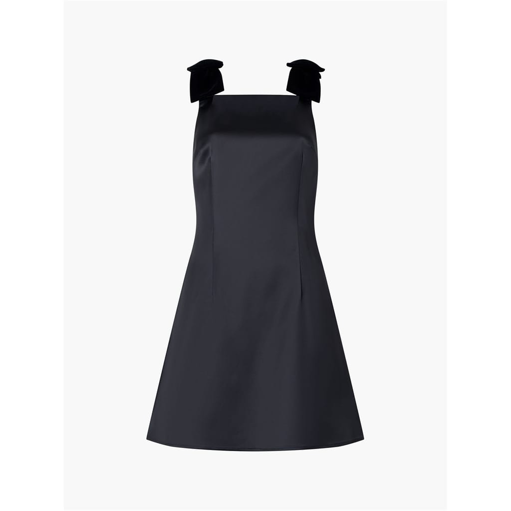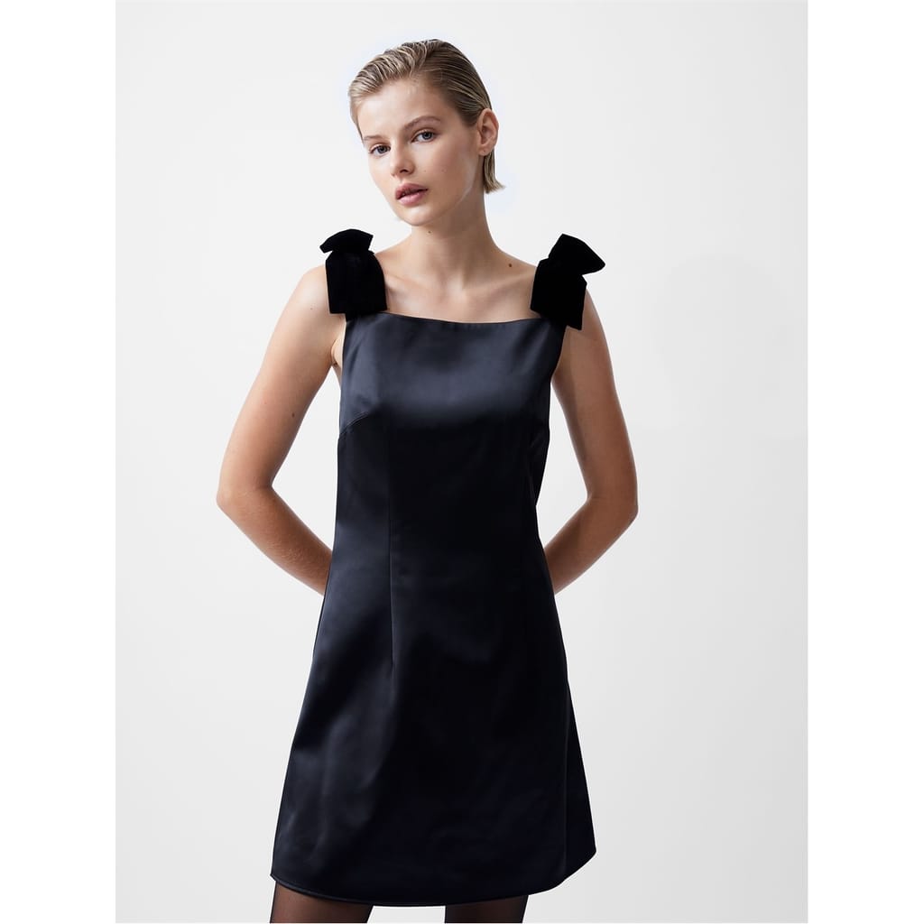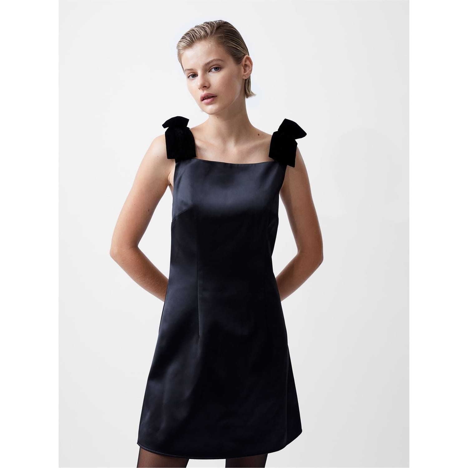 This French Connection mini dress features a square neck and a stylish tie shoulder design. Crafted in an A-line silhouette, it offers a regular fit for comfortable wear. The solid pattern is elegantly accented with a bow embellishment. A back zipper ensures easy closure, making it a chic choice for any occasion. -