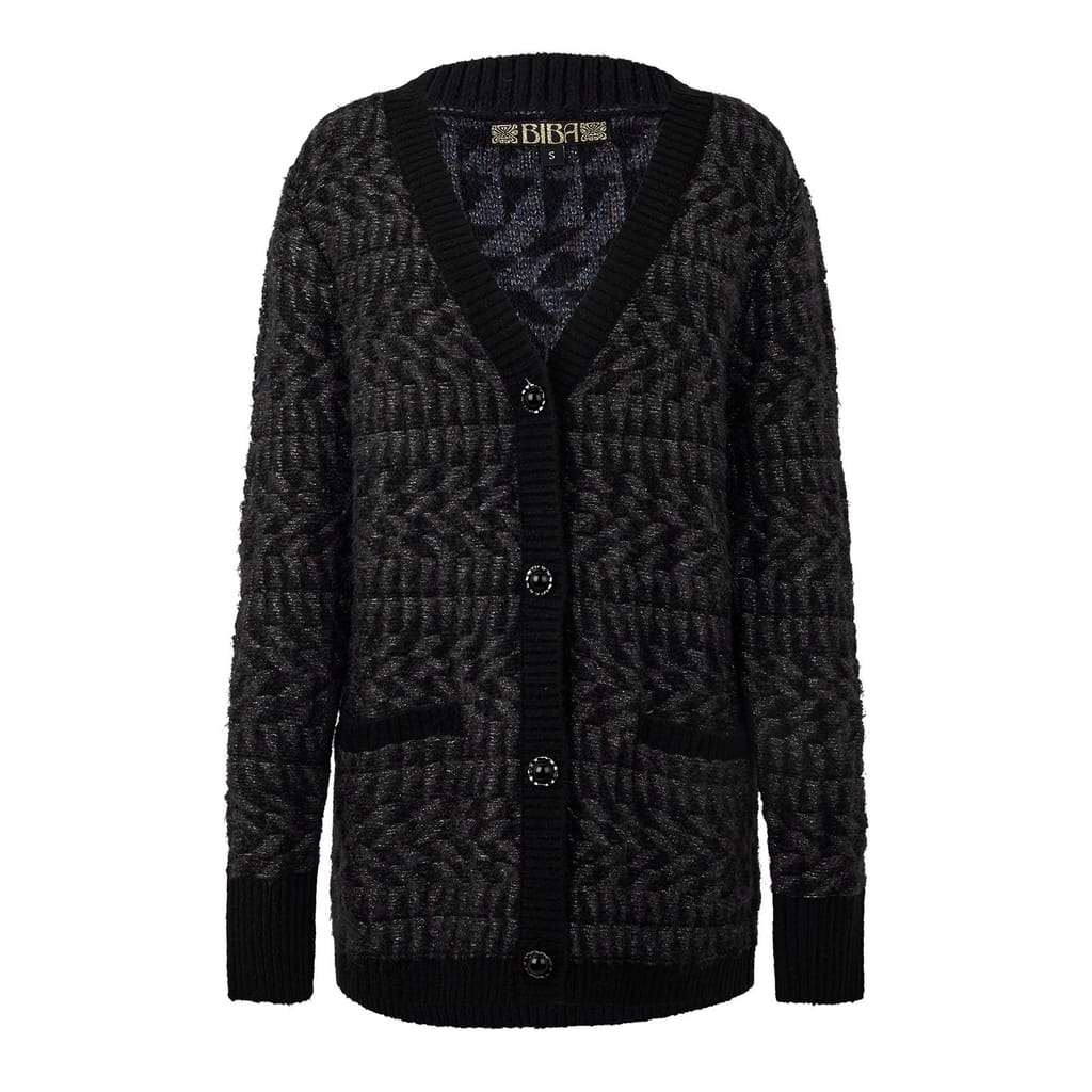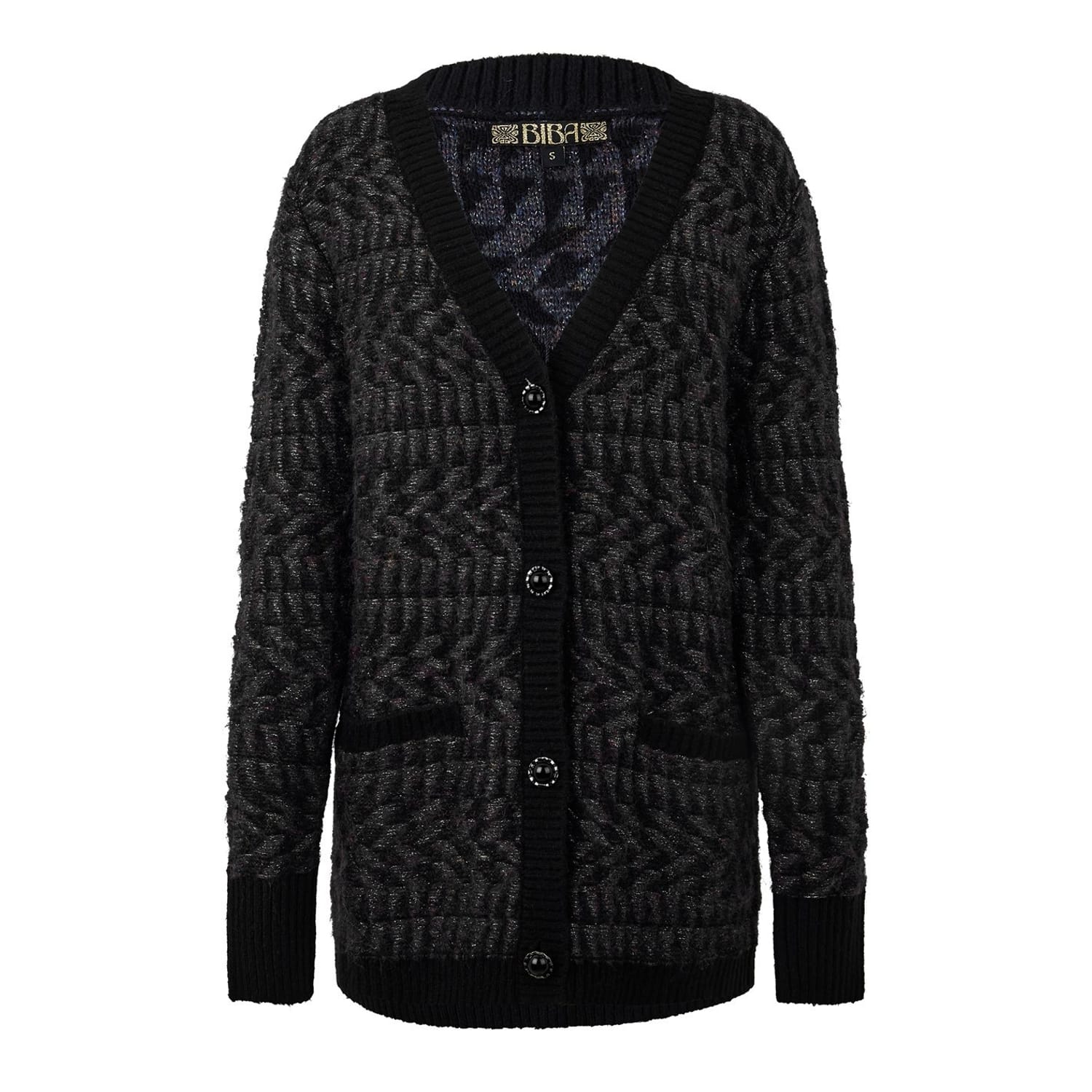 Elevate your wardrobe with the Biba Geo Knitted Cardigan, a stylish and versatile piece that combines metallic geo knit with chic details. This chunky knit cardigan features statement buttons and two practical pockets, offering both style and functionality. Provides warmth and comfort, ideal for layering during cooler seasons.