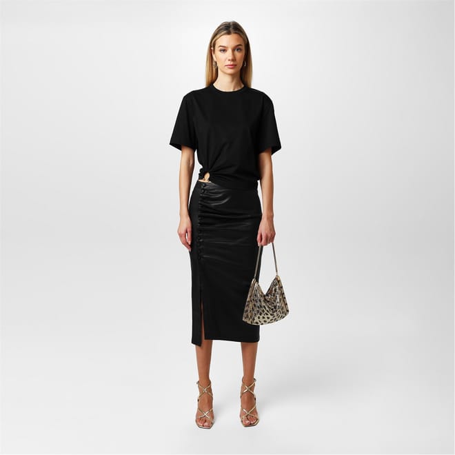 - Asymmetrical gathered hem with gold tone embellishment creates an eye-catching visual appeal.