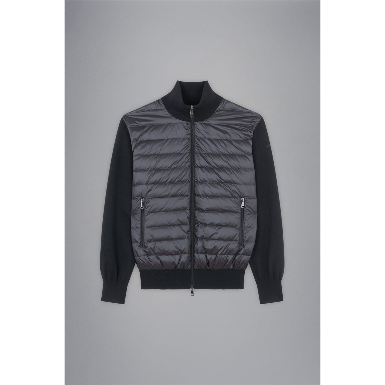 This Paul & Shark hybrid jacket features a zip neck and a regular fit, offering a sleek and functional design. The jacket is equipped with a zipper closure and includes practical side zip pockets. It is finished with ribbed cuffs and a ribbed hem, providing a comfortable and secure fit. The solid pattern adds a classic touch to this versatile piece. -