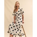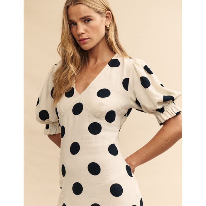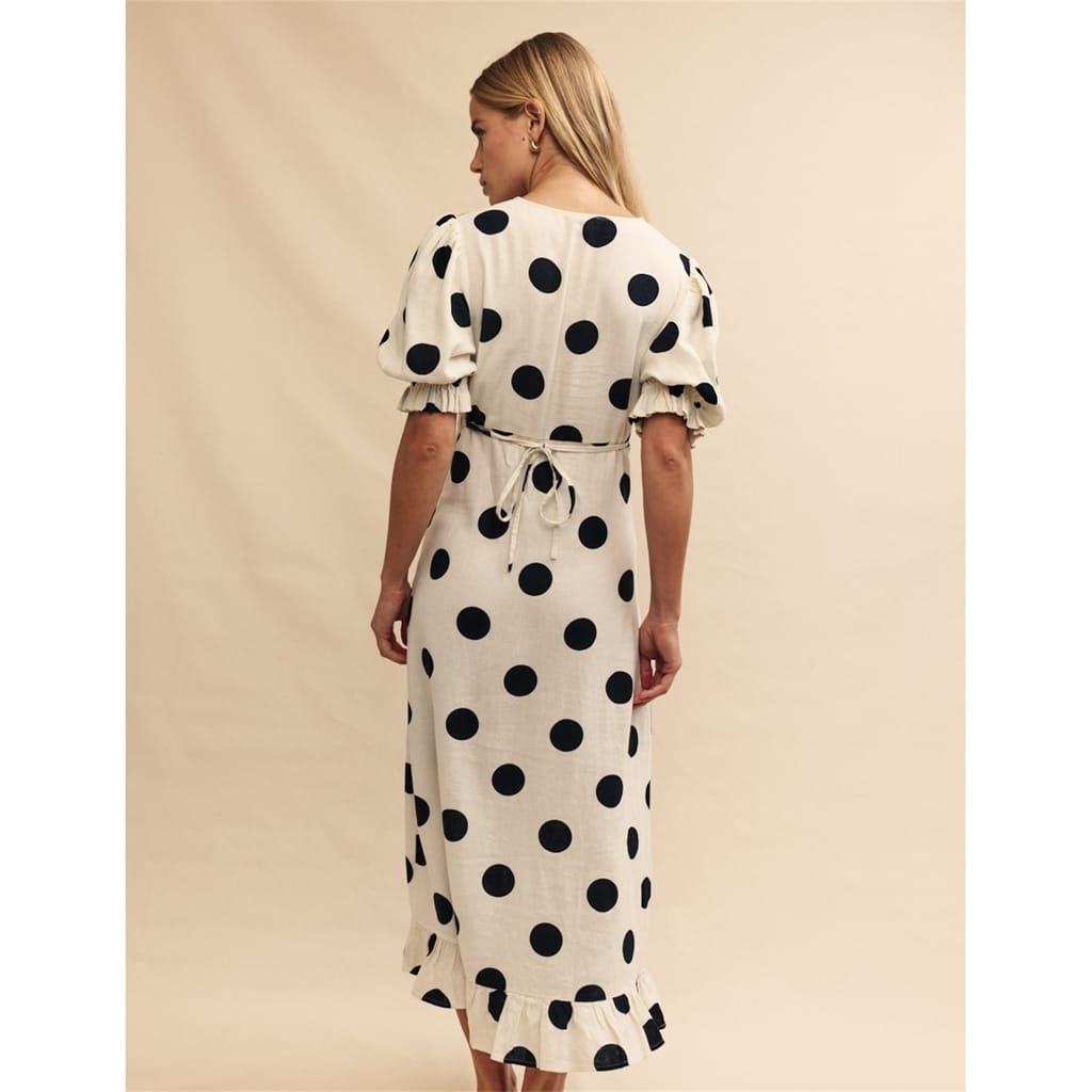 This charming midi dress by Nobody Child is perfect for children. Designed with a v-neckline and three-quarter puff sleeves, it features a delightful polka dot pattern. The dress is tailored in a regular fit and finished with a ruffle hem. A tie-back closure adds a stylish touch, making it a lovely addition to any young wardrobe. -