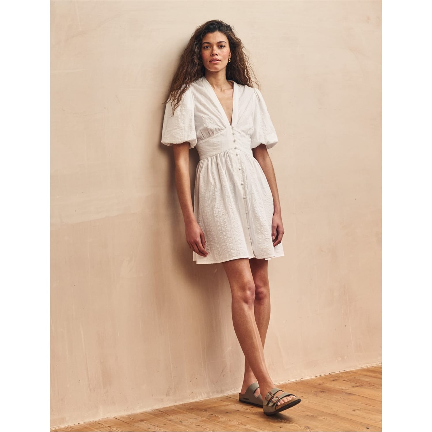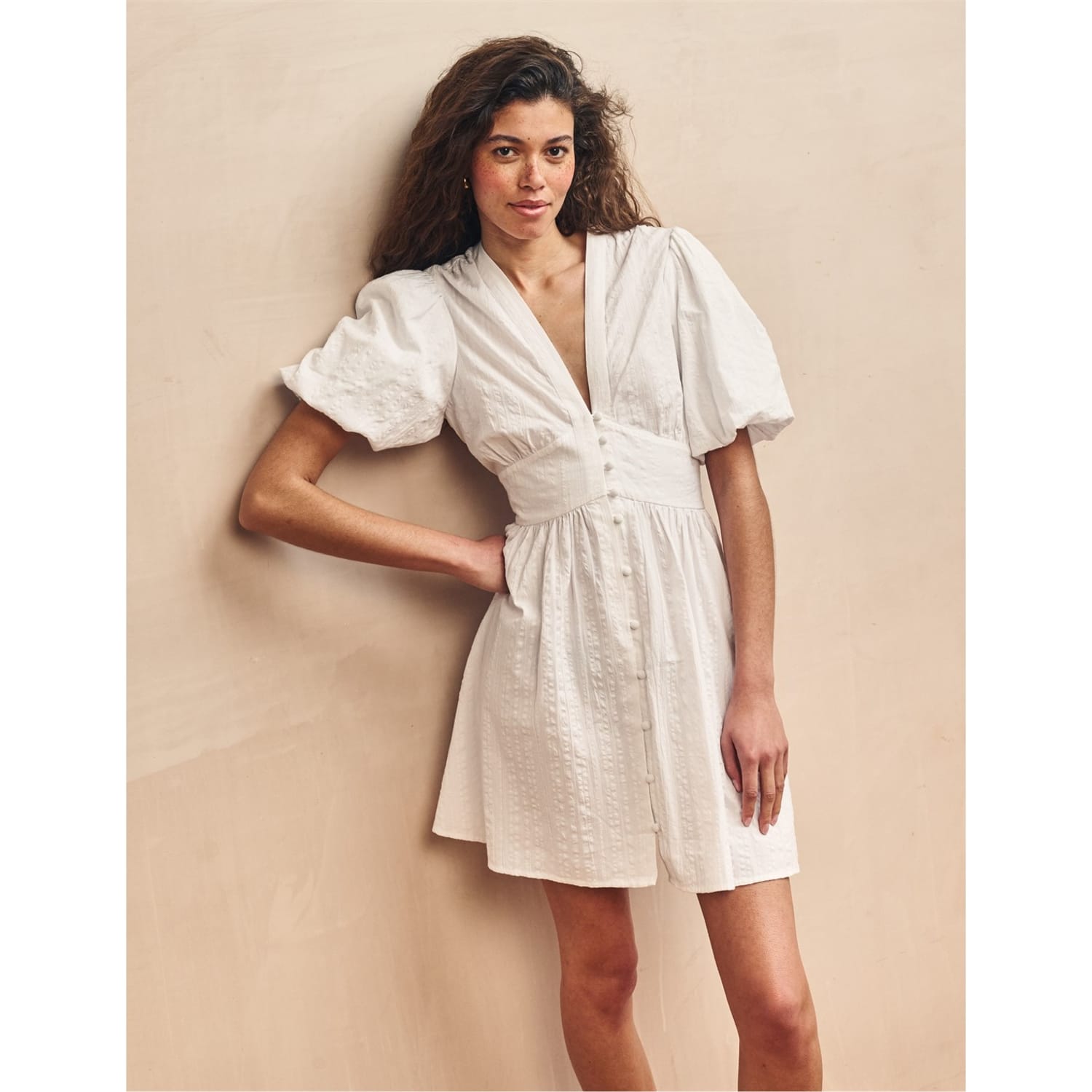 Discover the charming mini dress from Nobody Child, designed for children. This dress features a flattering V-neck with short puff sleeves and a straight hem. The solid pattern adds a timeless touch, while the button closure ensures a secure fit. Perfect for any occasion, this regular fit dress combines style and comfort effortlessly. -