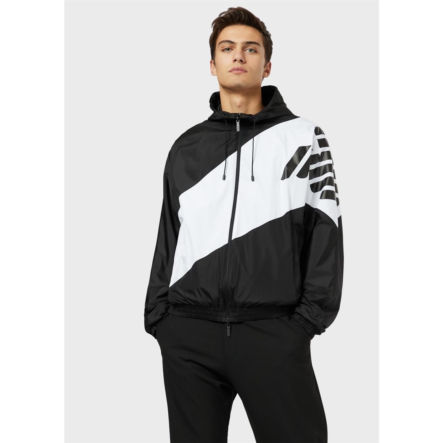 Stay stylish with this Emporio Armani EA7 sweatshirt. Featuring a hoodie design and long raglan sleeves, it offers a regular fit for ultimate comfort. The elasticated cuffs add a snug touch, while the full zipper closure ensures ease of wear. With a striking color block pattern and iconic logo embellishment, this sweatshirt is a standout piece. -
