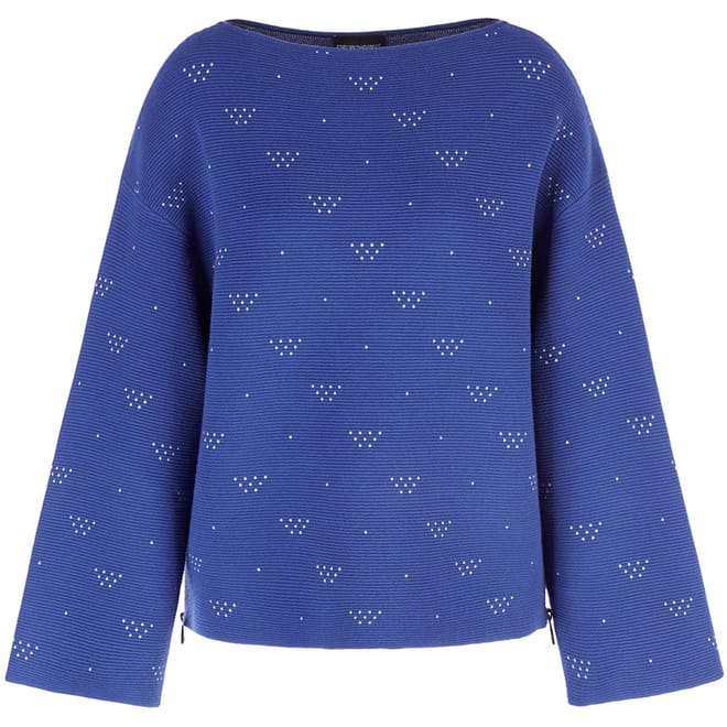 This Emporio Armani EA7 sweater features a relaxed fit with long sleeves and a boat neck. The drop shoulder design adds a modern touch, while the unique combination of heart and geometric patterns offers a stylish flair. Perfect for those seeking a blend of comfort and fashion. -
