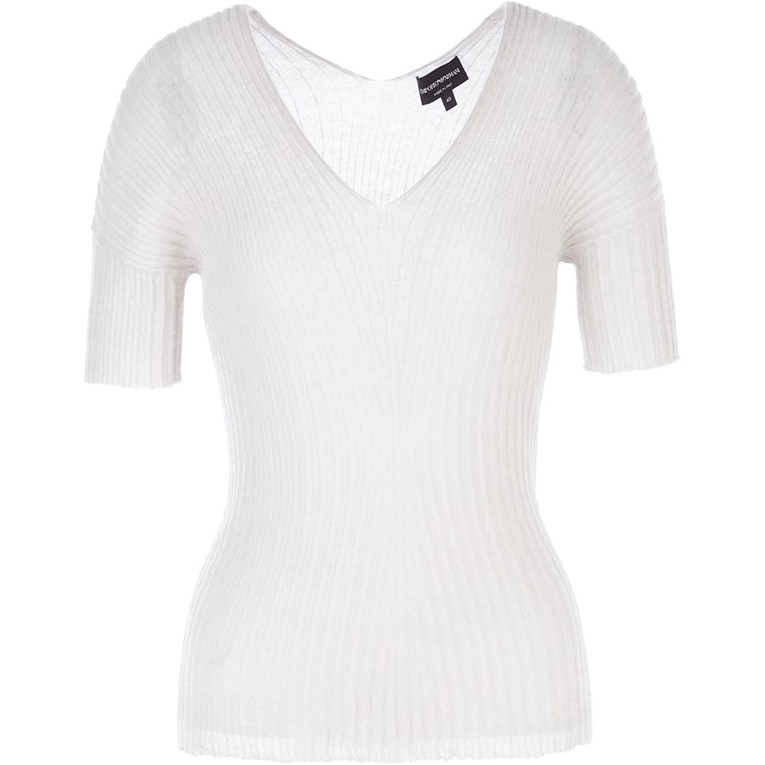 This Emporio Armani EA7 slim fit sweater features a stylish V-neck and short sleeves. Crafted with a ribbed pattern, it offers a modern look and comfortable wear. -