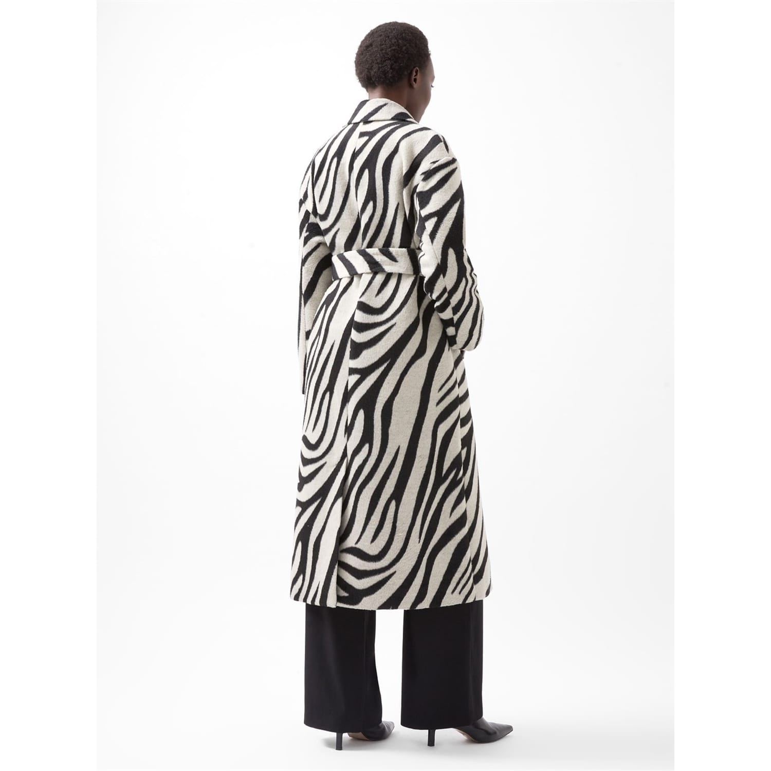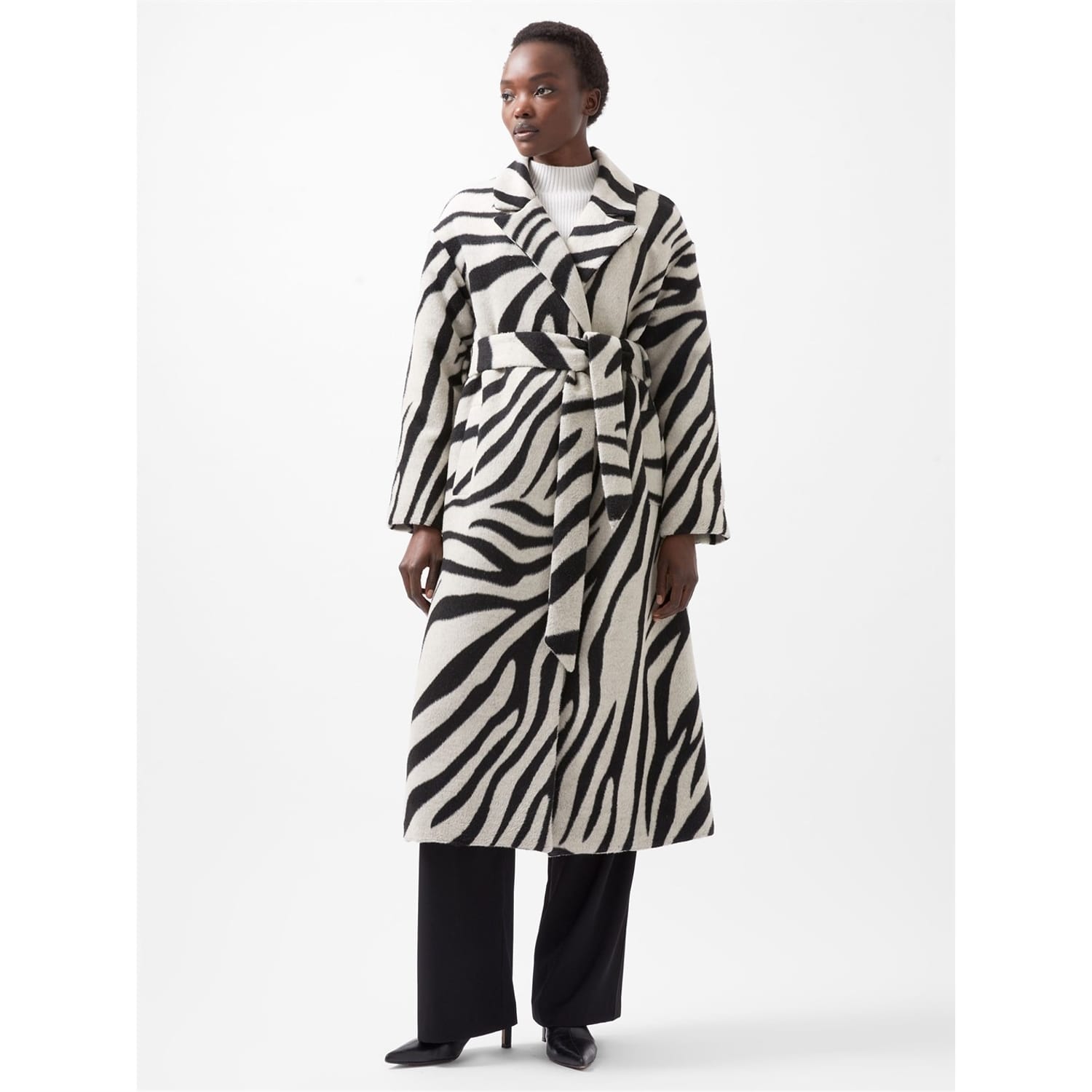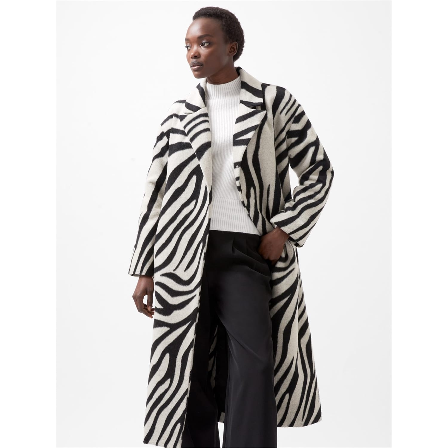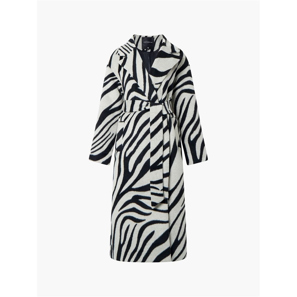 Elevate your wardrobe with this French Connection overcoat. This relaxed fit coat features a unique zebra pattern and a classic lapel collar, offering both style and comfort. The coat is designed with a belt closure, adding a touch of sophistication to your ensemble. Perfect for layering, this jacket combines functionality with a chic appearance. -