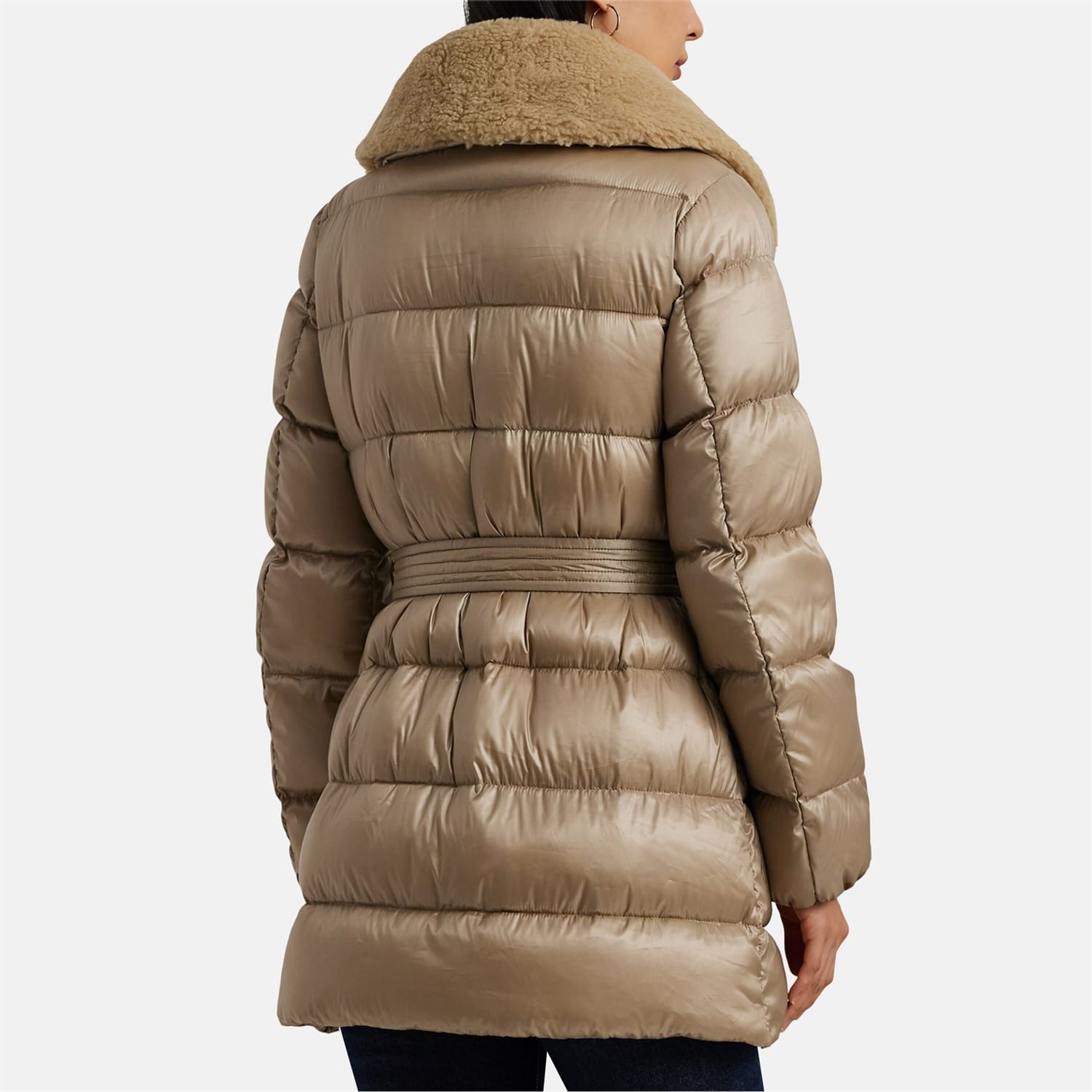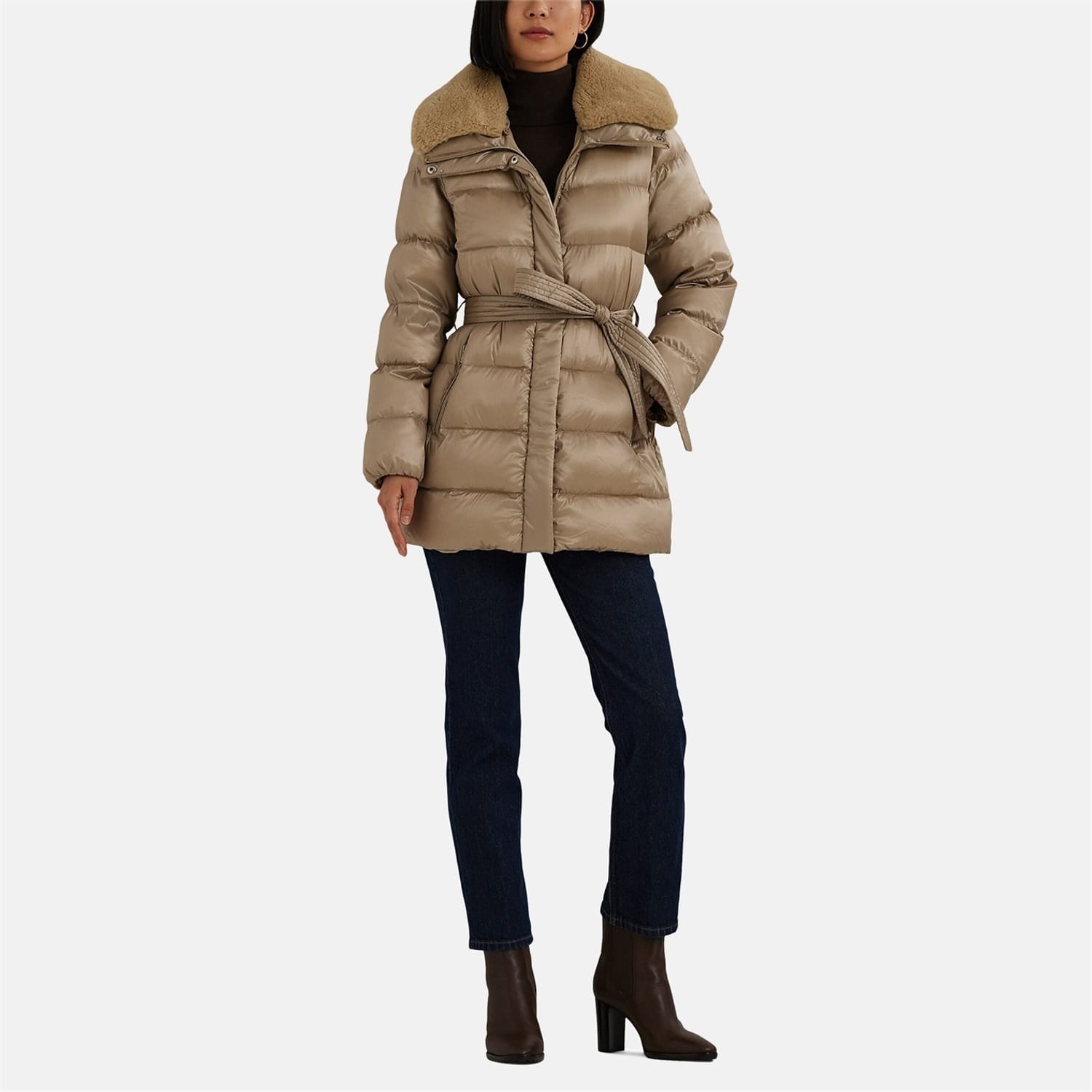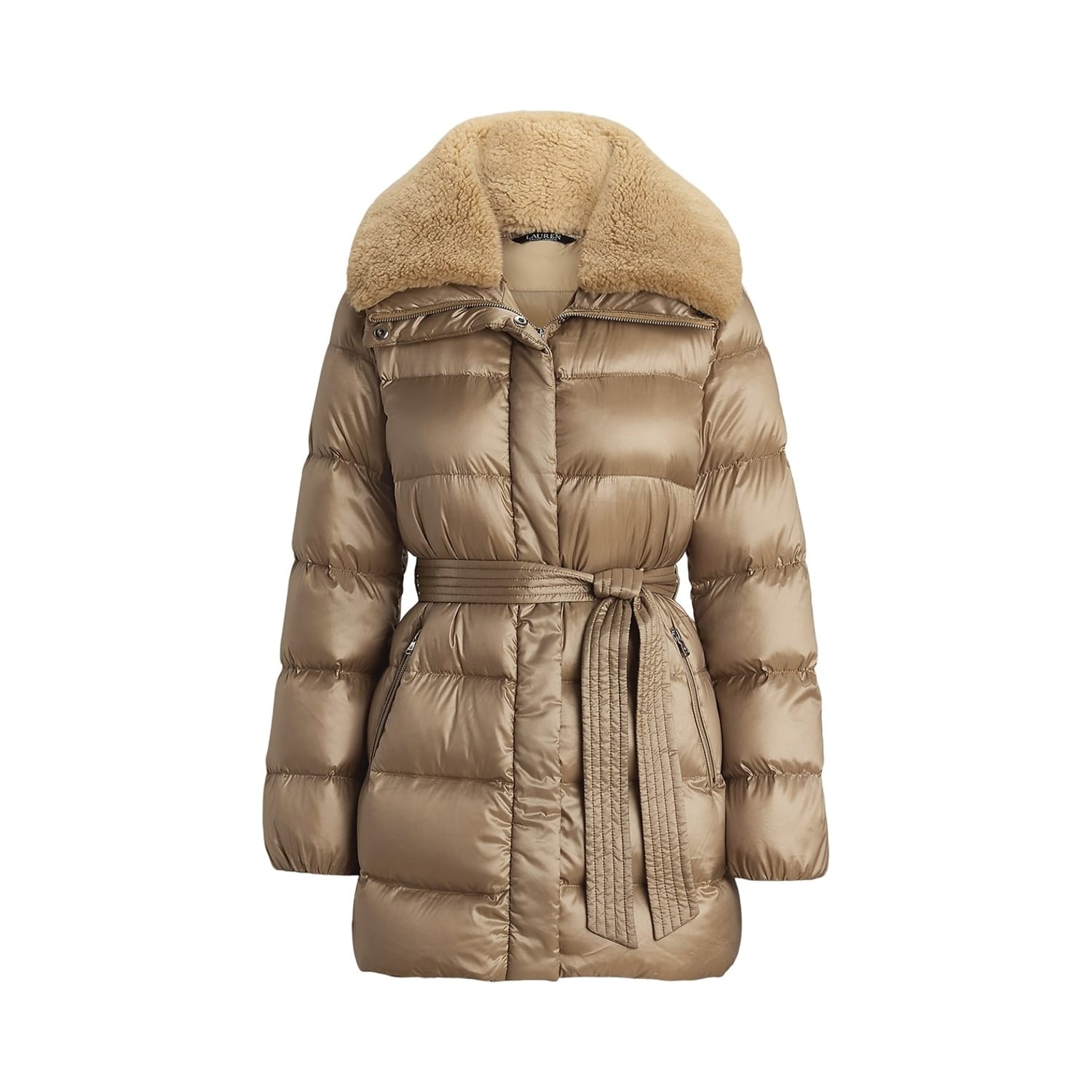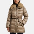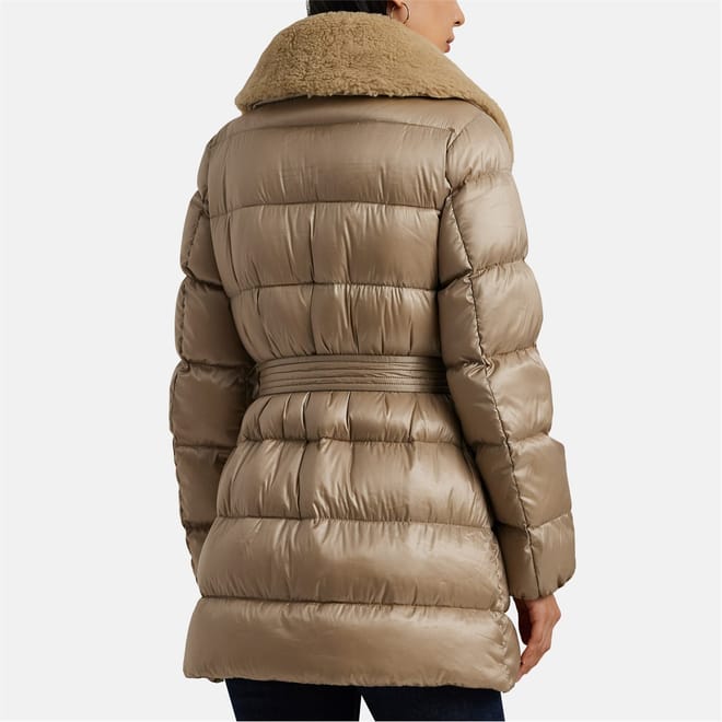 Elevate your winter wardrobe with the Ralph Lauren Faux-Shearling-Trim Belted Down Coat. Ideal for colder climates, this channel-quilted coat features a smooth, water-resistant shell with an iridescent finish, complete with removable faux-shearling trim on the collar for both warmth and style. With plush 650-fill-power-down insulation, it ensures optimal comfort and cosiness in chilly weather.