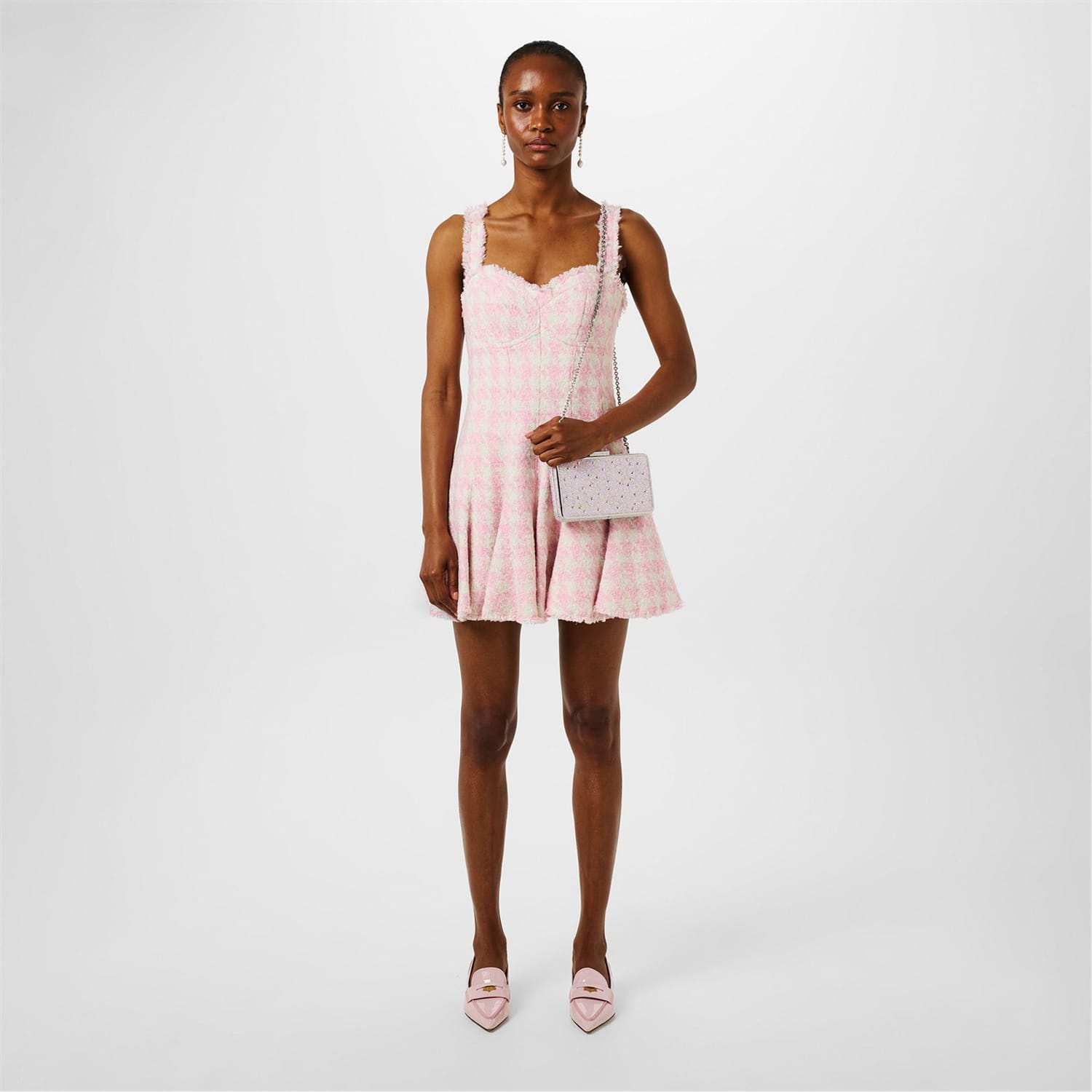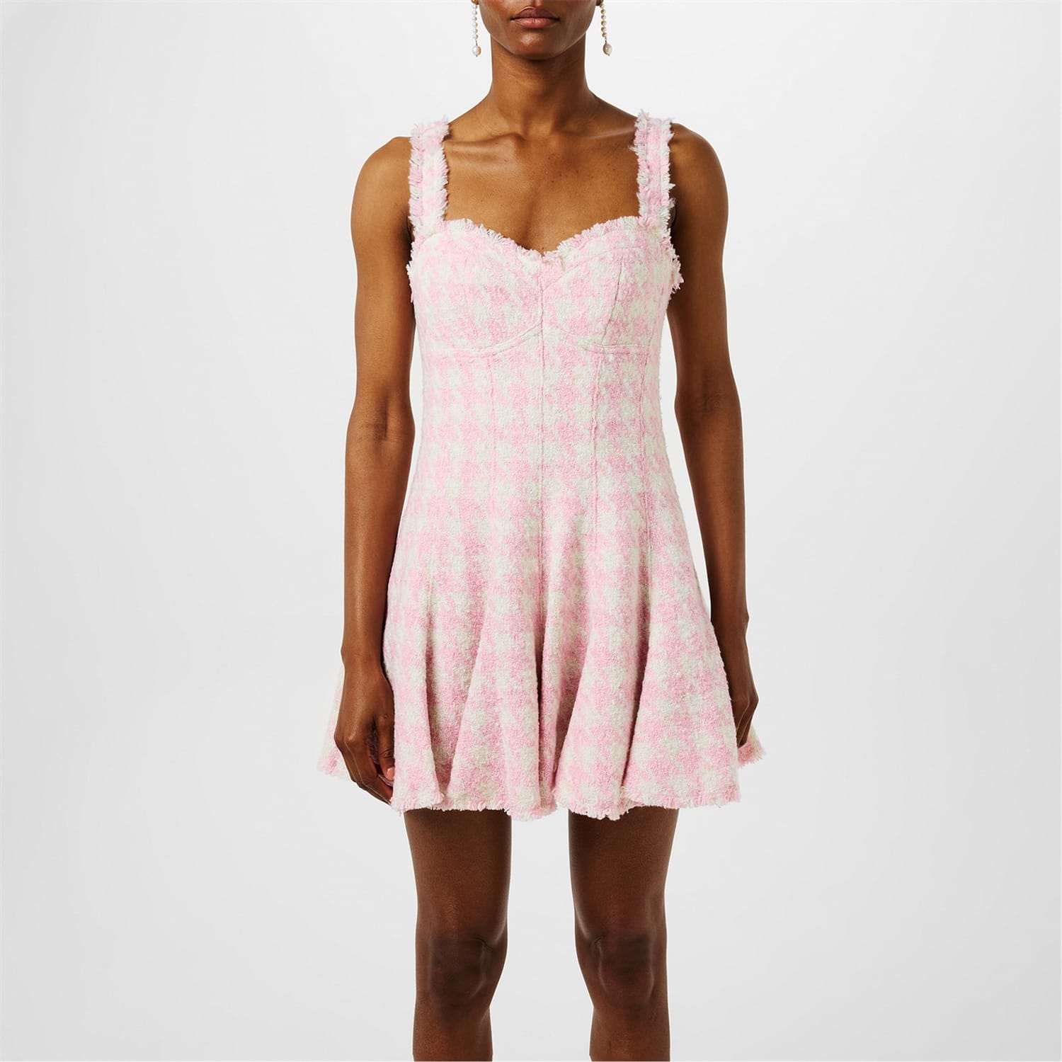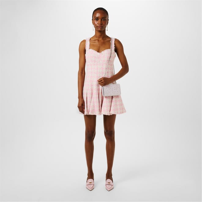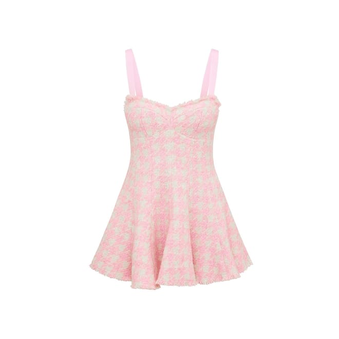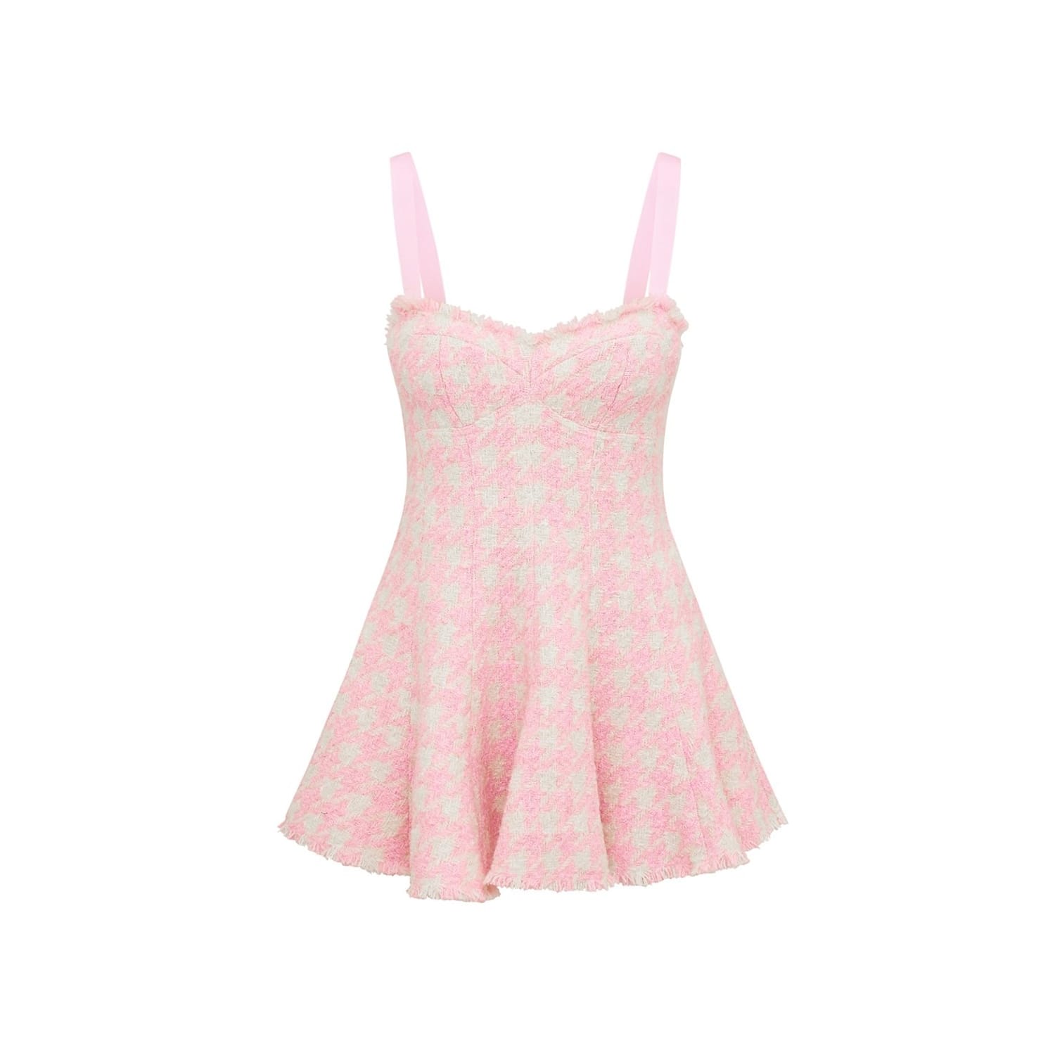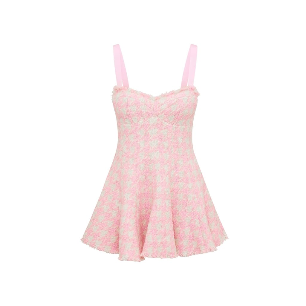 This Love Shack Fancy mini dress features a charming sweetheart neckline and a distinctive houndstooth pattern. The A-line style is enhanced with fringe embellishments, adding a playful touch. The frayed hemline completes the look, making it a unique addition to any wardrobe. -