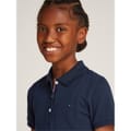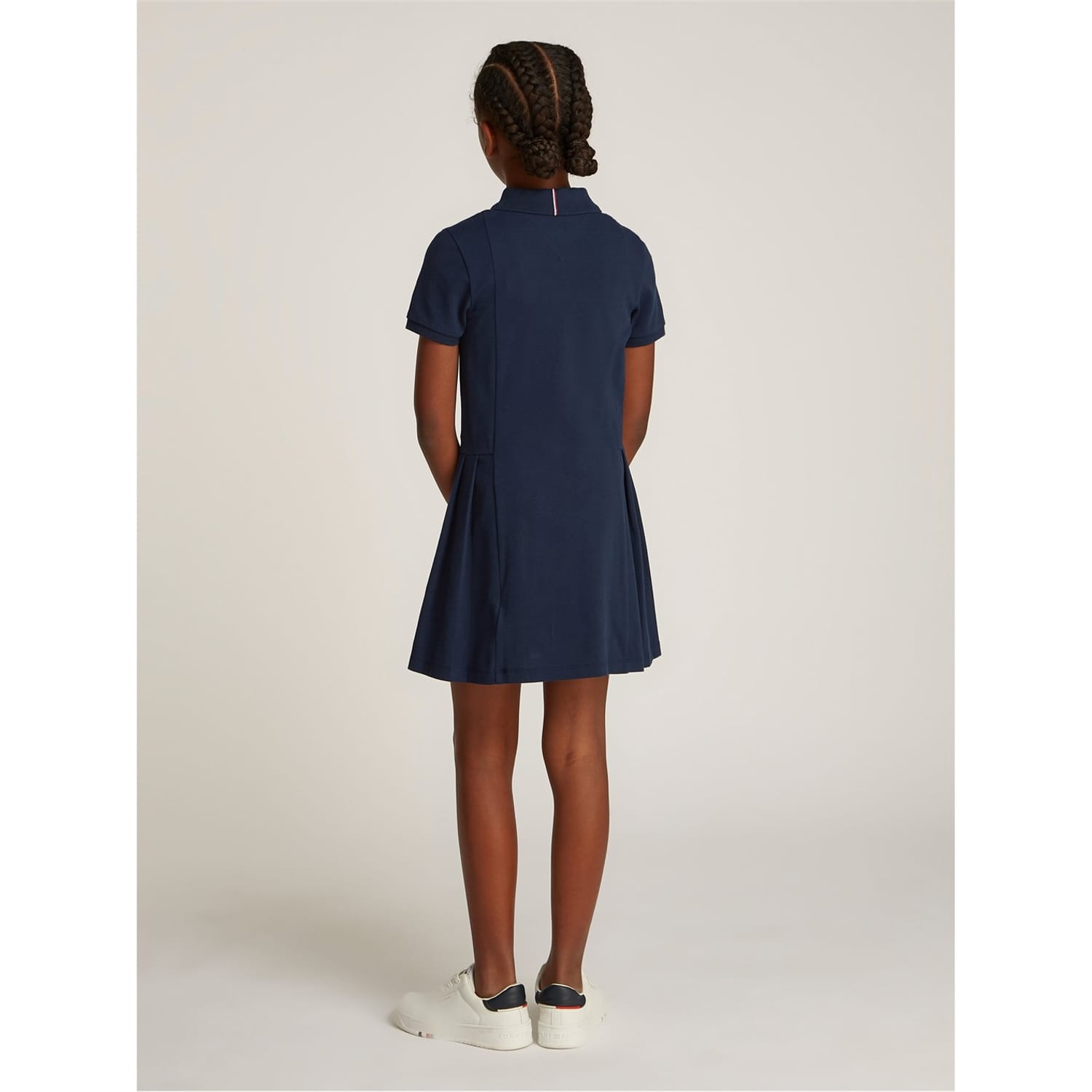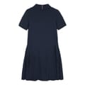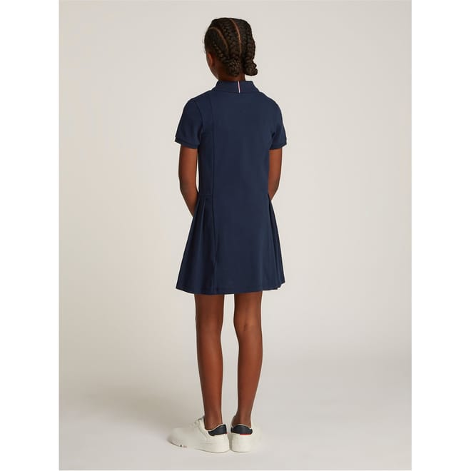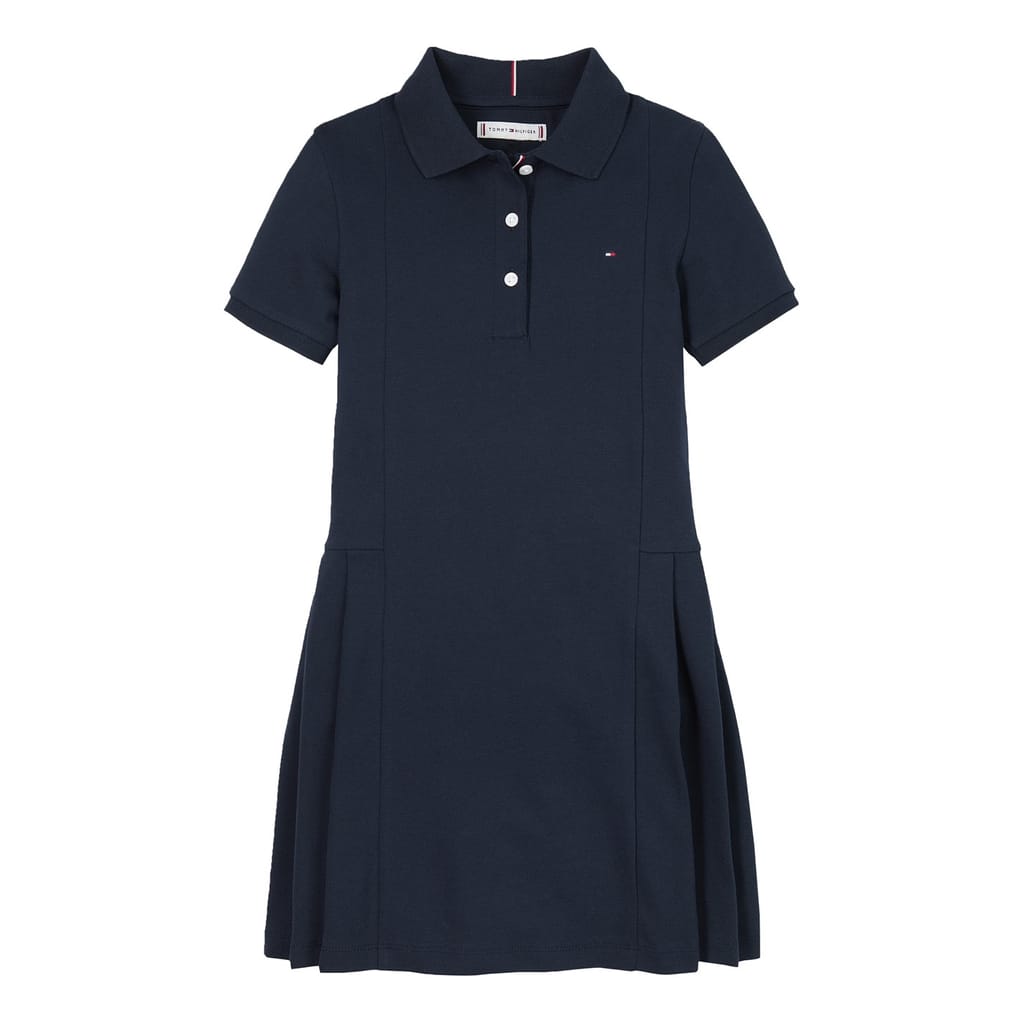 This Tommy Hilfiger knee-length dress features a polo collar and a collared neck, offering a classic t-shirt style. The short sleeves and regular fit ensure comfort, while the solid pattern and button closure add a touch of elegance. A subtle logo embellishment completes the look, making it a versatile addition to any wardrobe. -