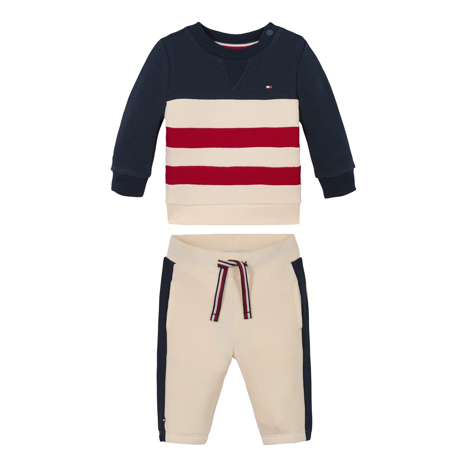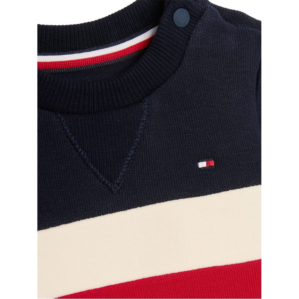Elevate your casual wardrobe with this Tommy Hilfiger top and jogger set. The striped sweatshirt features a crew neck and long plain sleeves, offering a classic look. The joggers provide comfort and style, perfect for relaxed days. A subtle logo embellishment adds a touch of brand identity, making this set a versatile addition to your collection. -