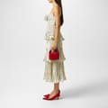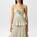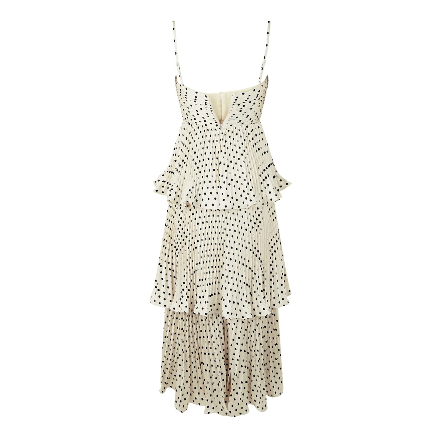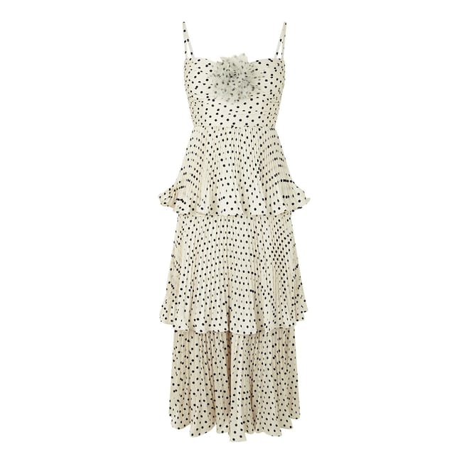 This Self-Portrait midi dress features a tiered design with a playful polka dot pattern. The regular fit is complemented by delicate spaghetti straps and ruffle embellishments, creating a charming and elegant look. -