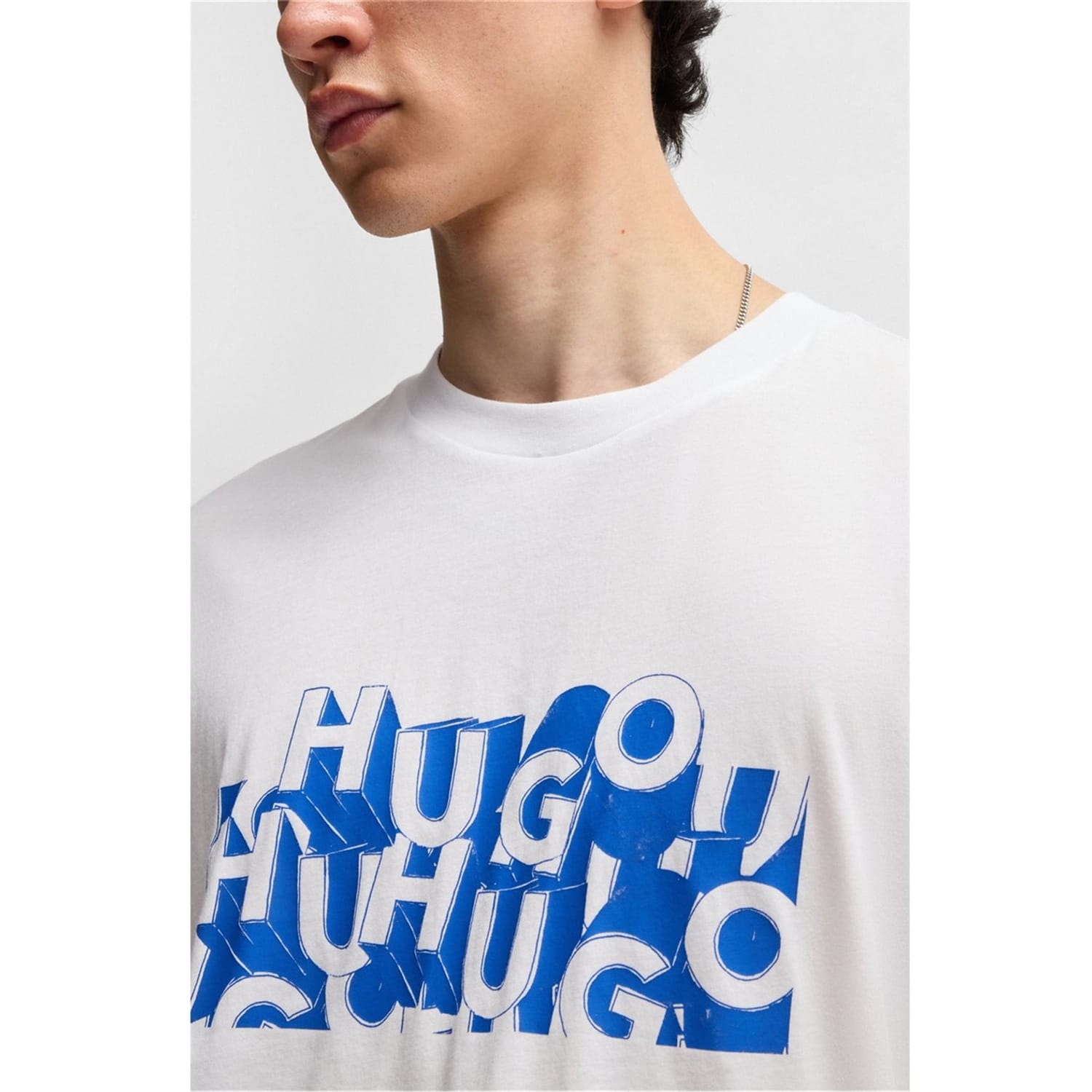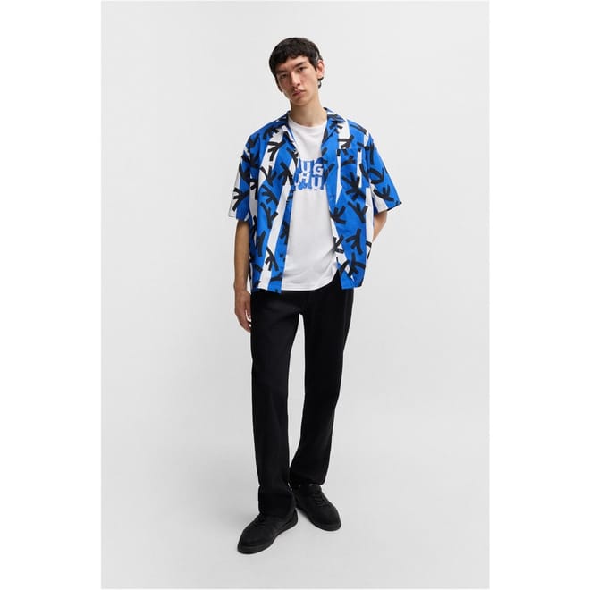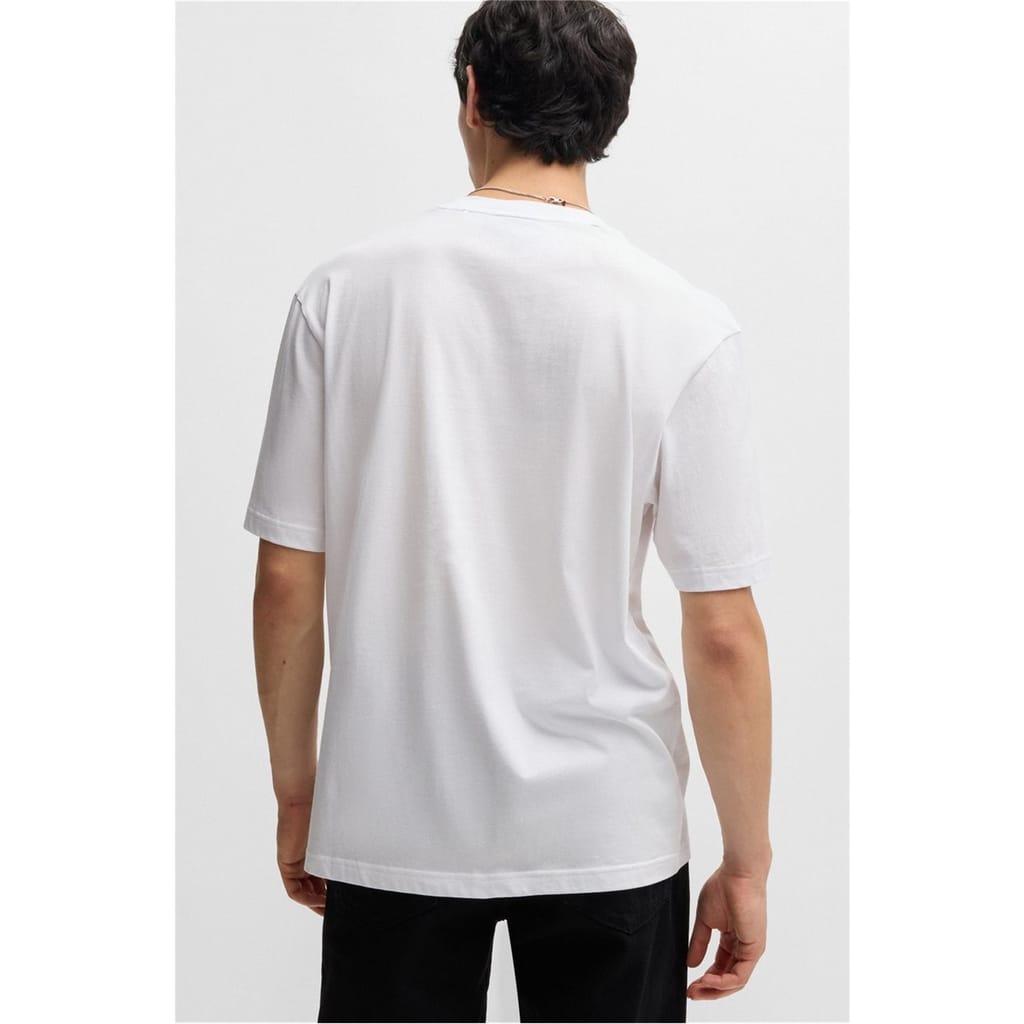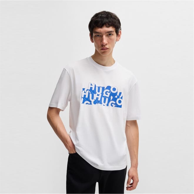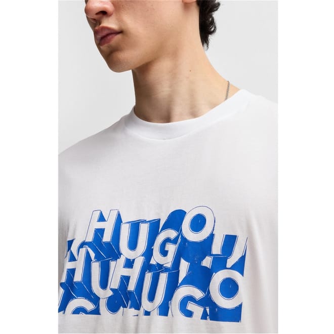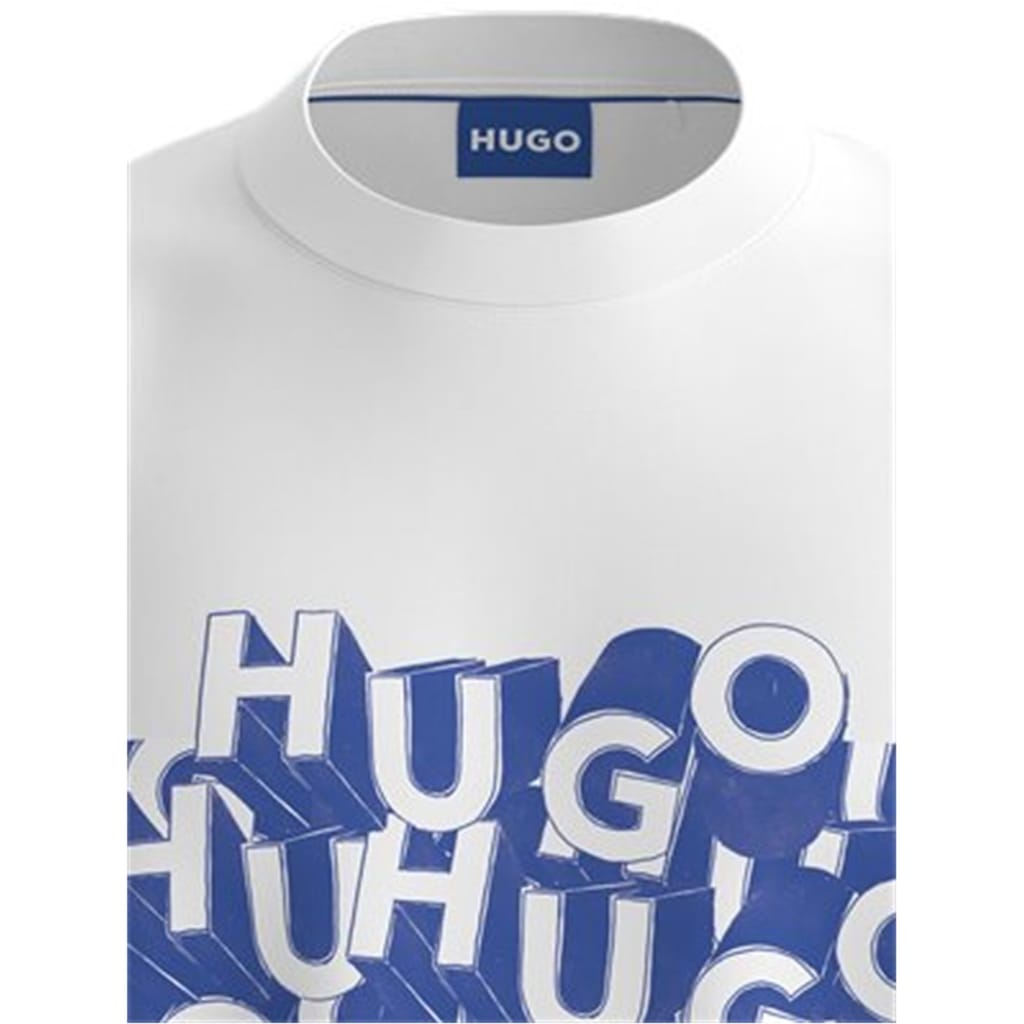 This Hugo top features a regular fit and a classic crew neck, offering a comfortable and stylish option for your wardrobe. The graphic print is enhanced with distinctive lettering and a subtle logo embellishment, adding a touch of brand identity to the design. -