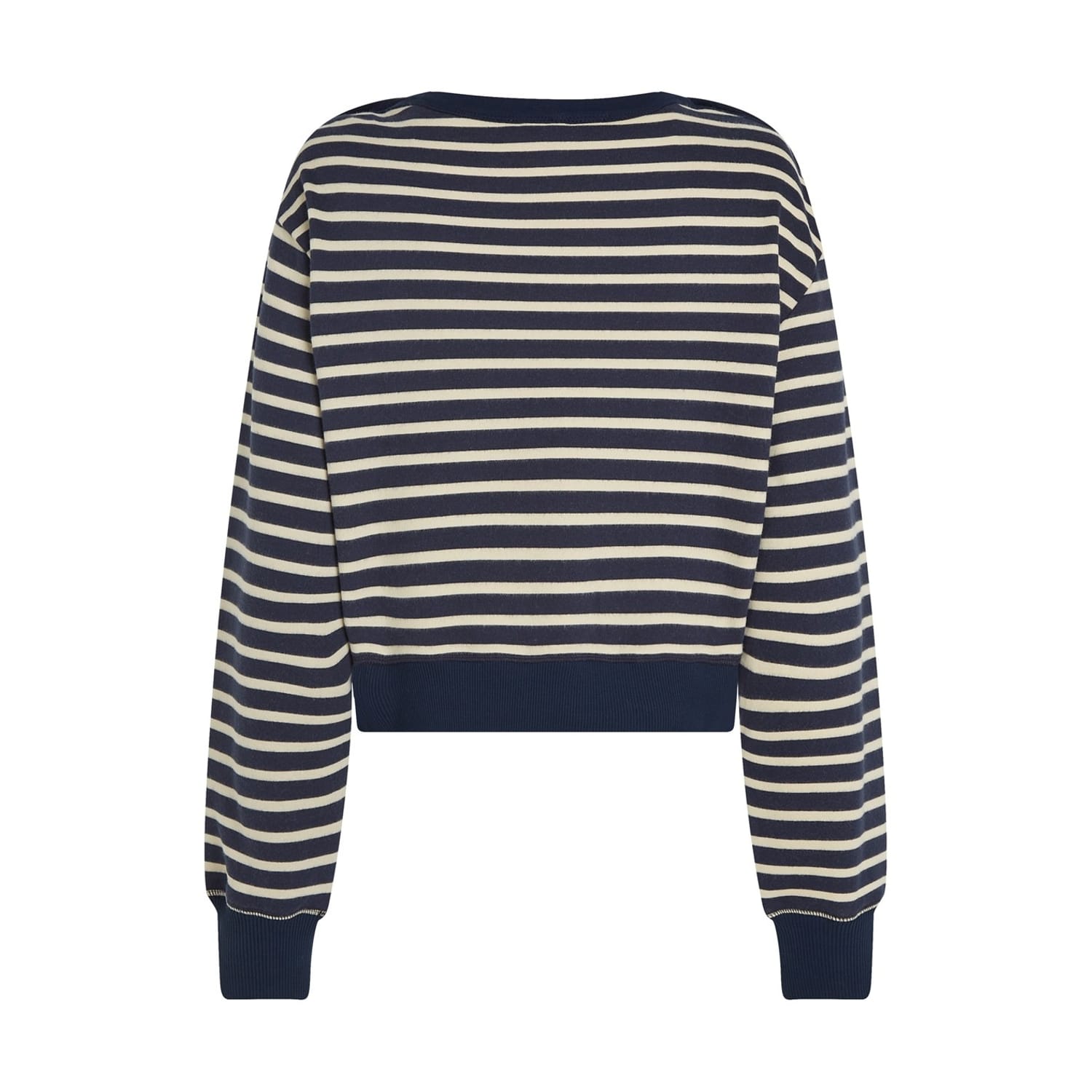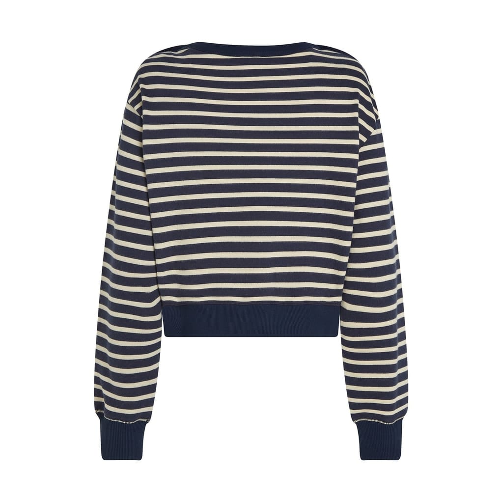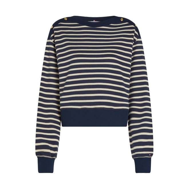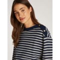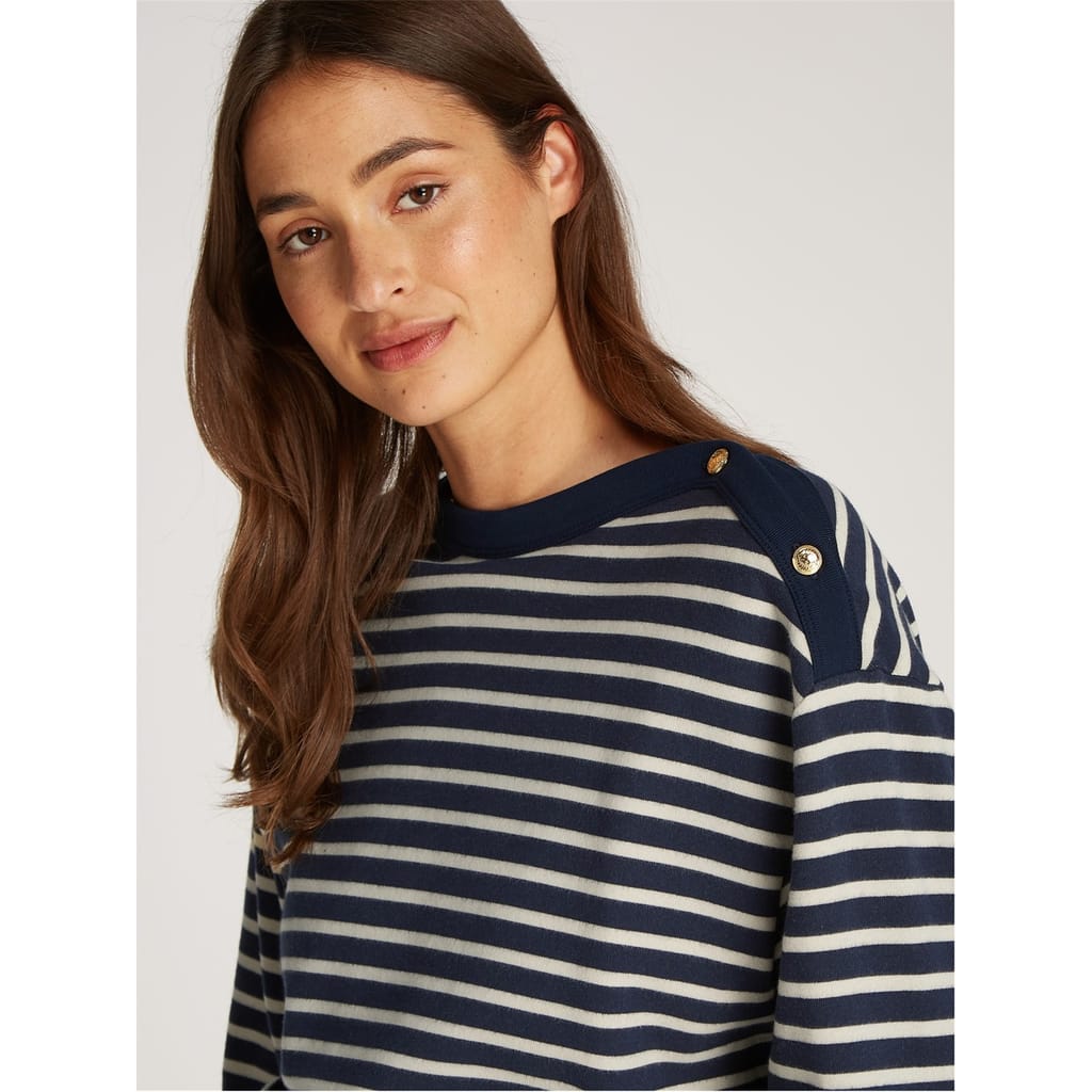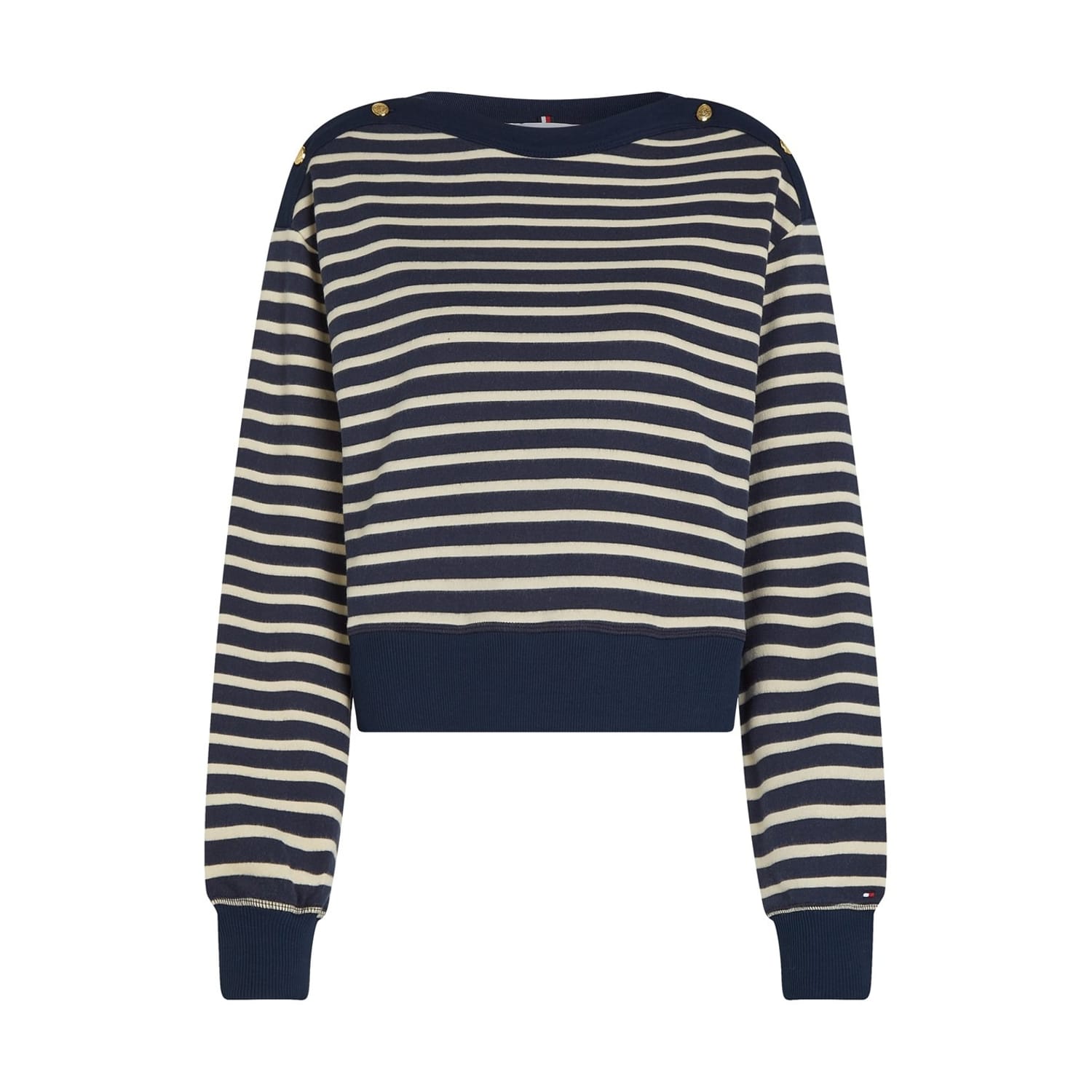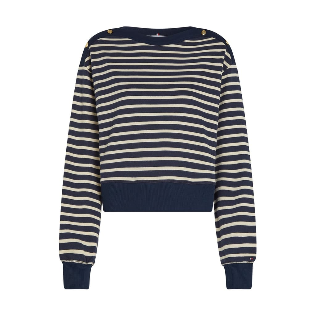 This Tommy Hilfiger sweatshirt features a classic boat neck and long sleeves, offering a regular fit for versatile wear. The horizontal stripe pattern adds a touch of style, while ribbed cuffs ensure comfort. Completed with a button closure, this top blends functionality with timeless design. -