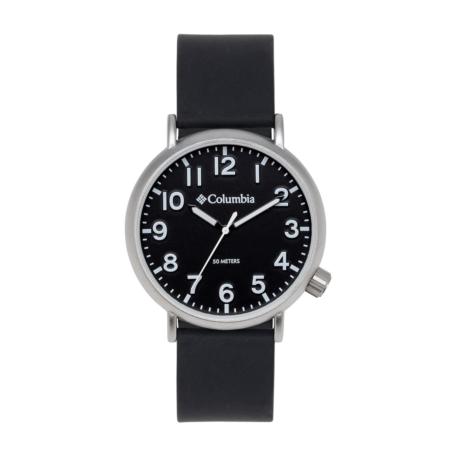 This timepiece is included in the Trailbanks assortment. Its metal casing holds a sleek black, green or blue dial with light Arabic numeral hour markers and matching baton minute markers. The center of the dial is adorned with black and white or silver and white hour, minute, and second hands. The watch is secured to the wrist with soft silicone or striped nato straps each with a pin buckle. -