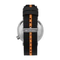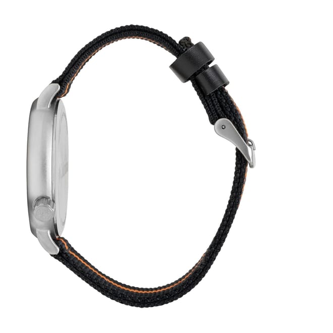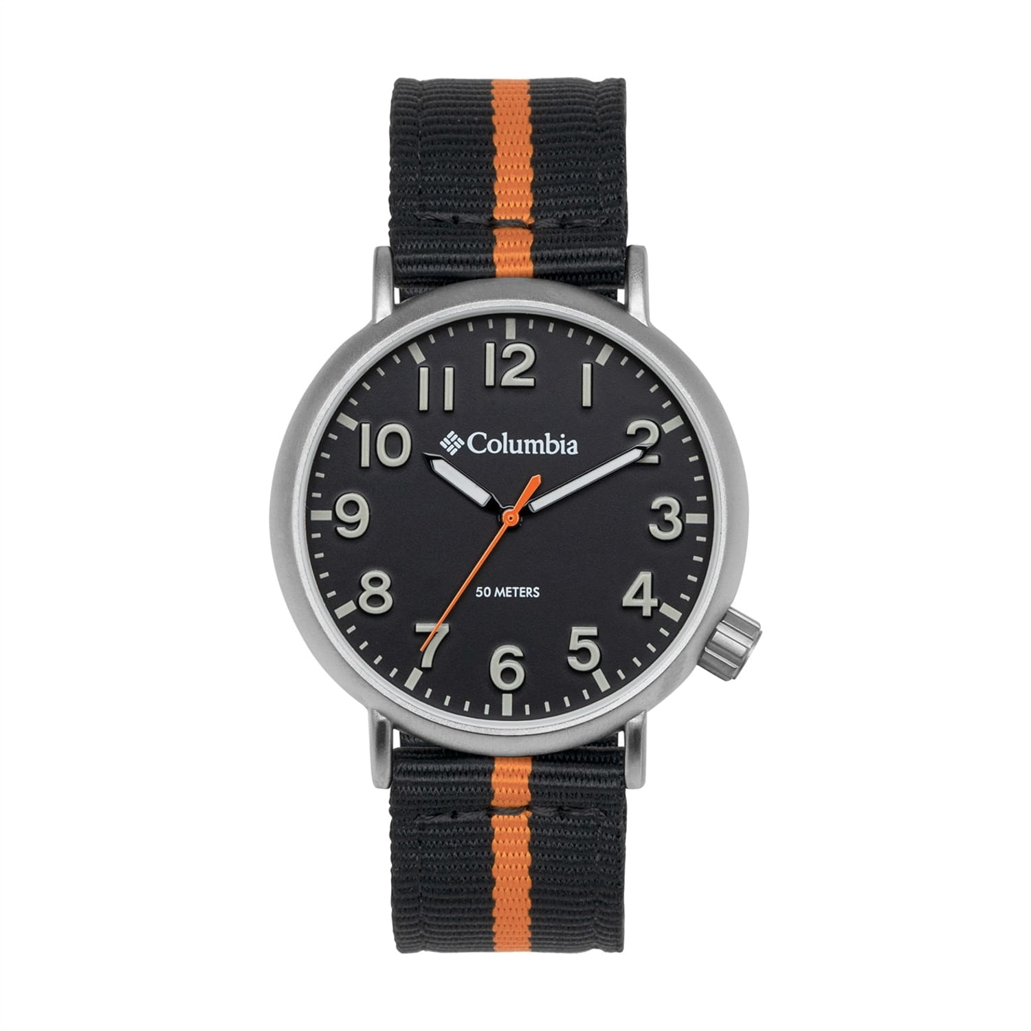 This timepiece is included in the Trailbanks assortment. Its metal casing holds a sleek black, green or blue dial with light Arabic numeral hour markers and matching baton minute markers. The center of the dial is adorned with black and white or silver and white hour, minute, and second hands. The watch is secured to the wrist with soft silicone or striped nato straps each with a pin buckle. -