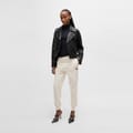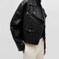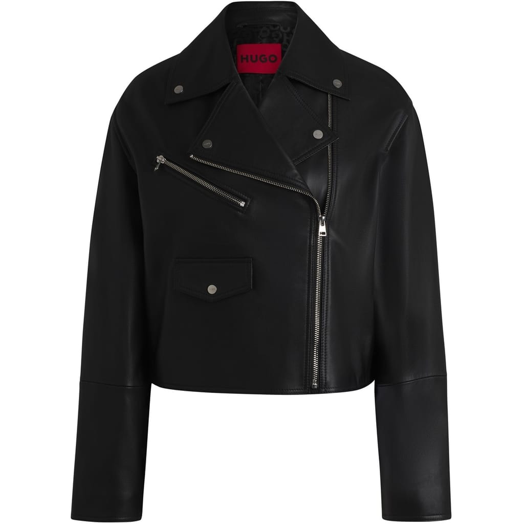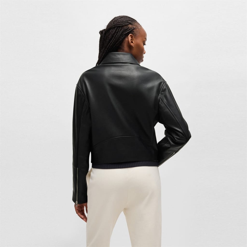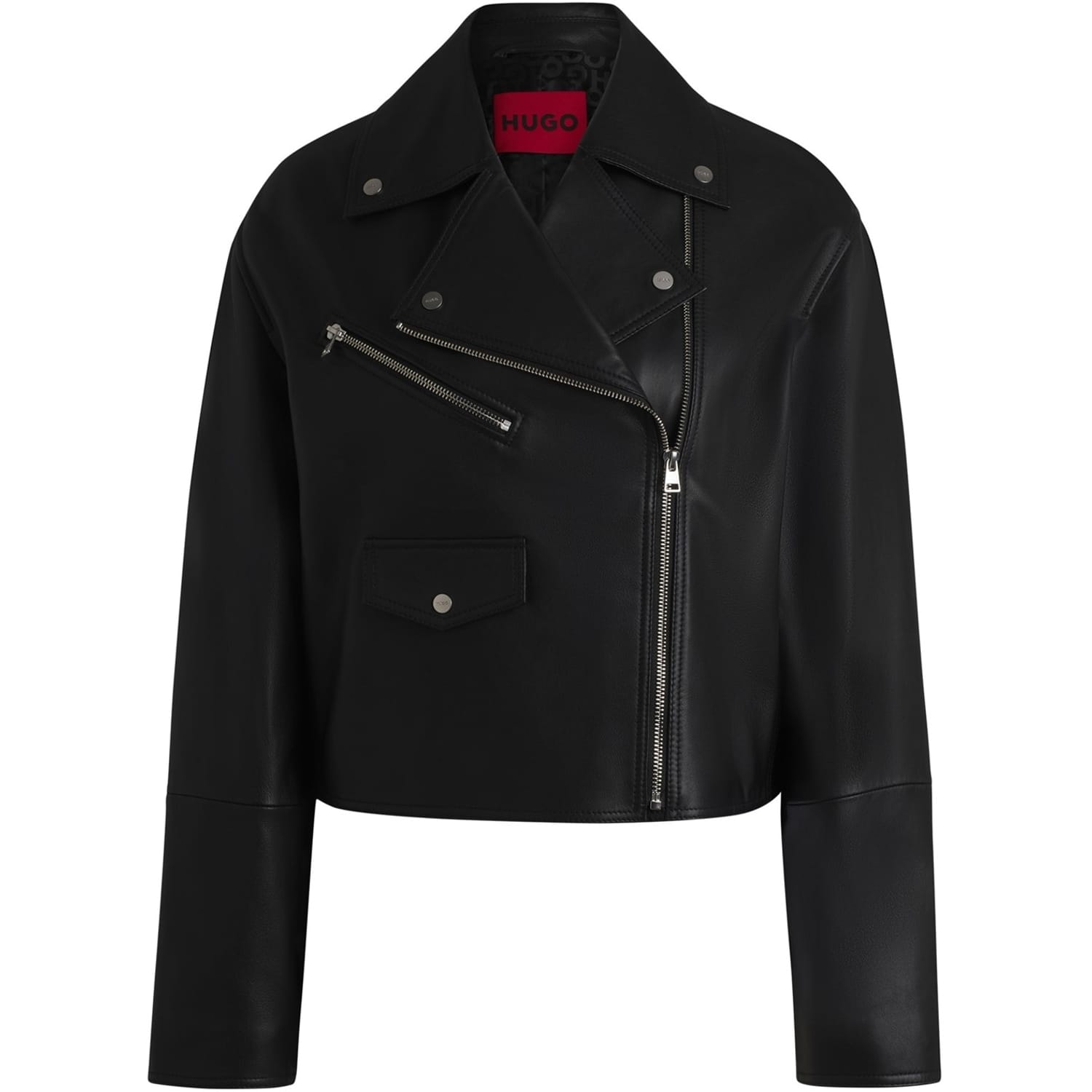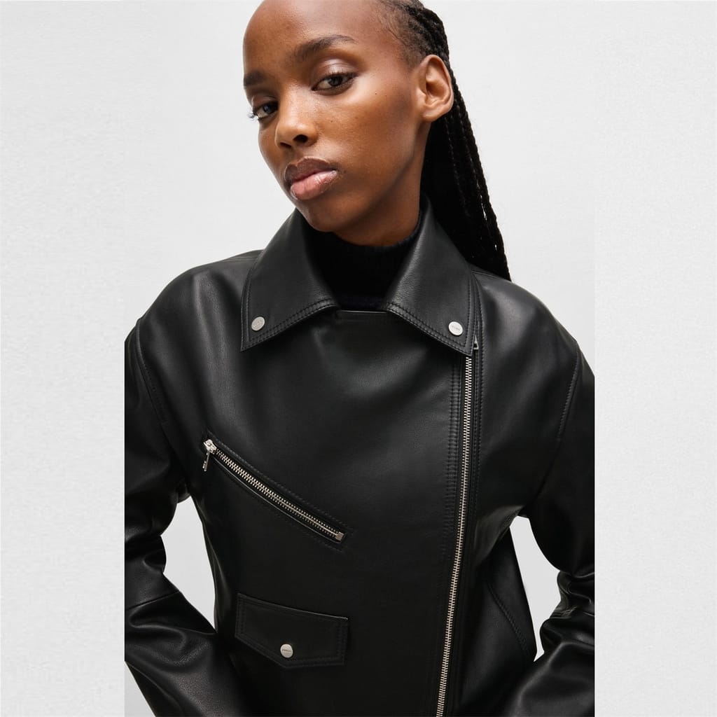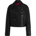 This Hugo moto jacket features a relaxed fit with a lapel collar and a straight hem. The short length and solid pattern offer a classic look. It includes a zipper and snap button closure, along with practical embellishments such as pockets, zipped pockets, and front zipper pockets for added functionality. -