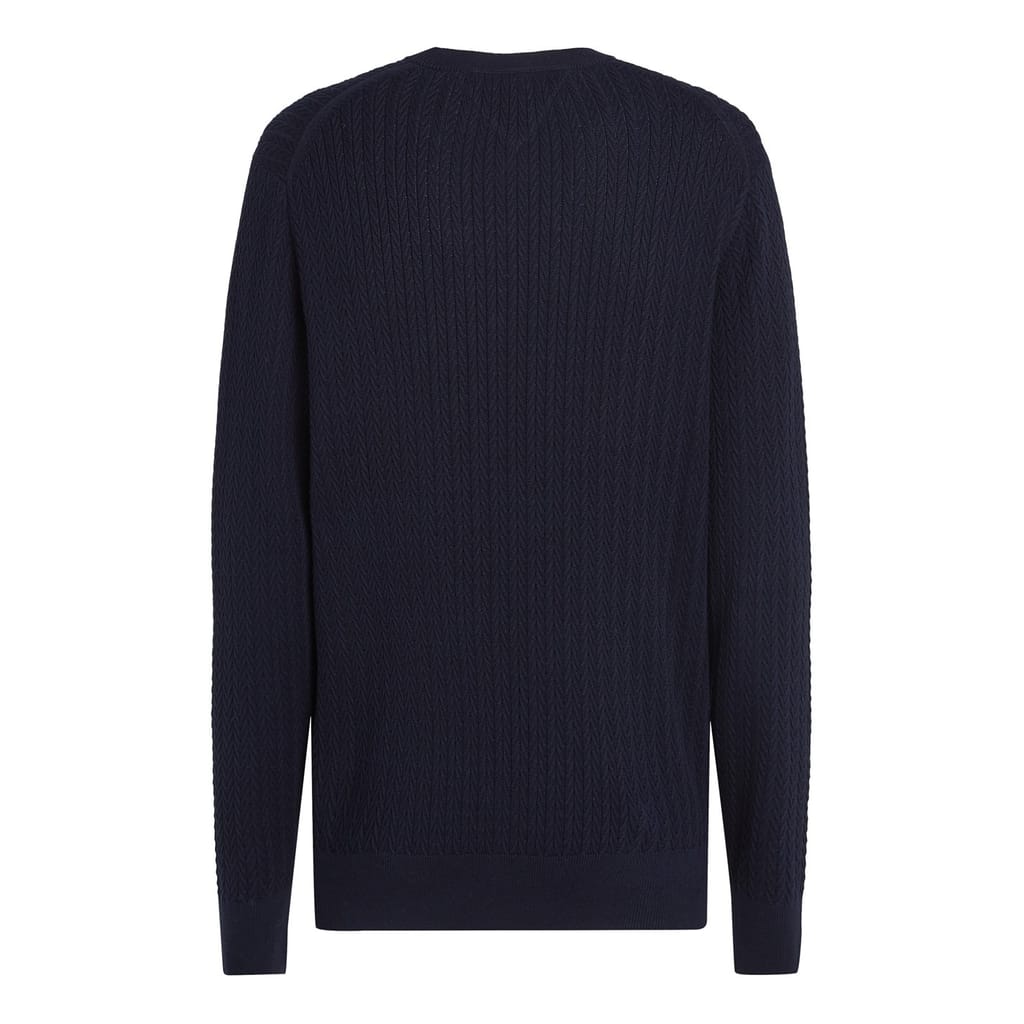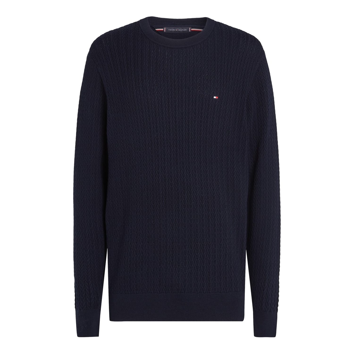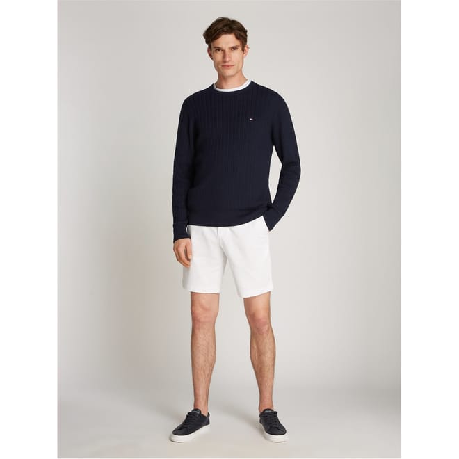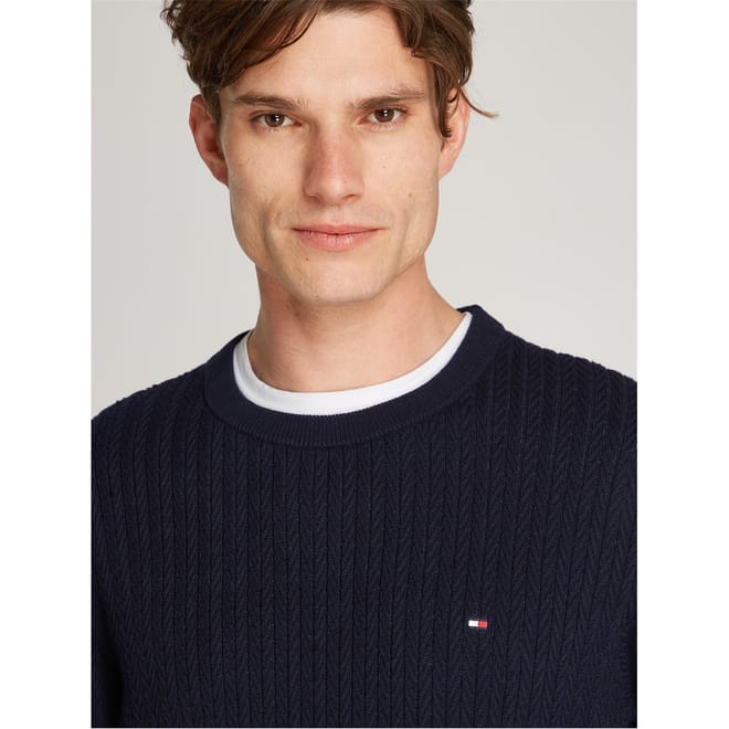 This Tommy Hilfiger top features a classic cable knit pattern, offering a timeless appeal. Designed with a crew neck and long sleeves, it ensures comfort and style. The regular fit provides a relaxed silhouette, while the ribbed collar and cuffs add a touch of detail. A subtle logo embellishment completes the look, making it a versatile addition to any wardrobe. -