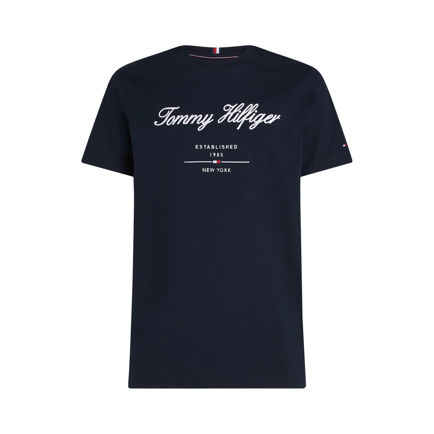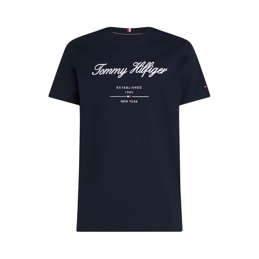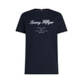 Discover the Tommy Hilfiger t-shirt, a staple for your casual collection. Featuring a crew neck and short sleeves, this regular fit top is adorned with an embroidered logo print. Perfect for those who appreciate understated style with a touch of iconic branding. -