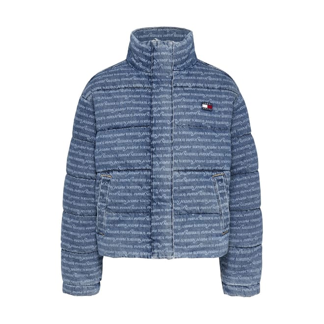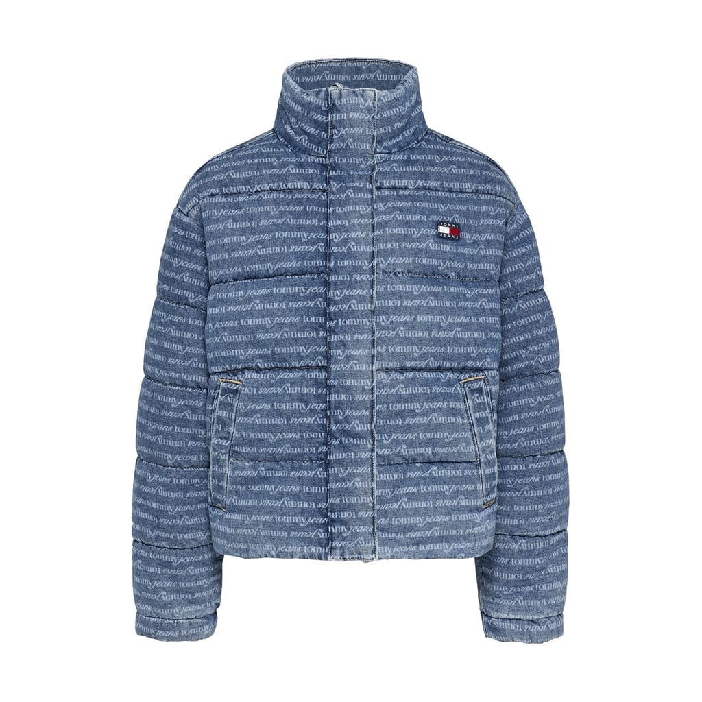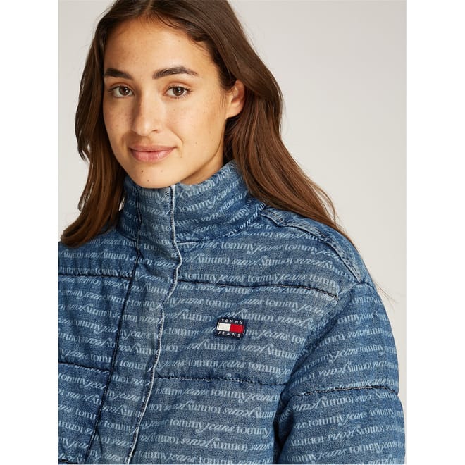 Stay warm this winter with the Tommy Jeans puffer jacket. This short, relaxed fit jacket features a high collar and a zipper closure for added comfort. The all-over logo pattern and lettering graphic add a stylish touch, while the front pocket provides practicality. The straight hem completes the look, making it a versatile addition to your winter wardrobe. -