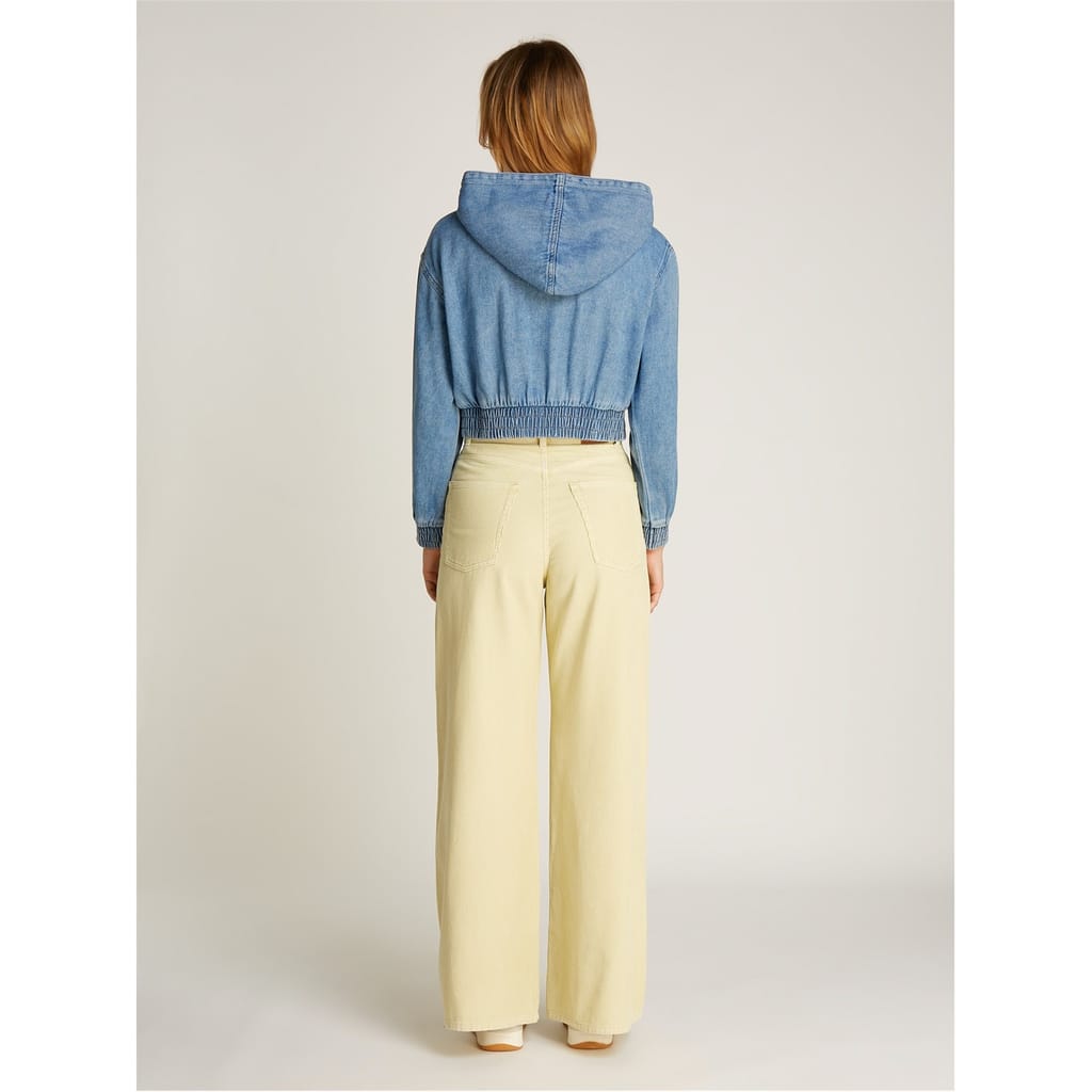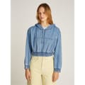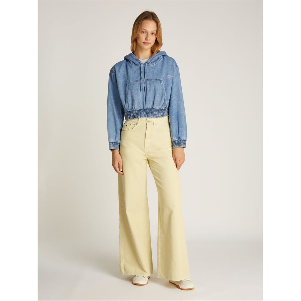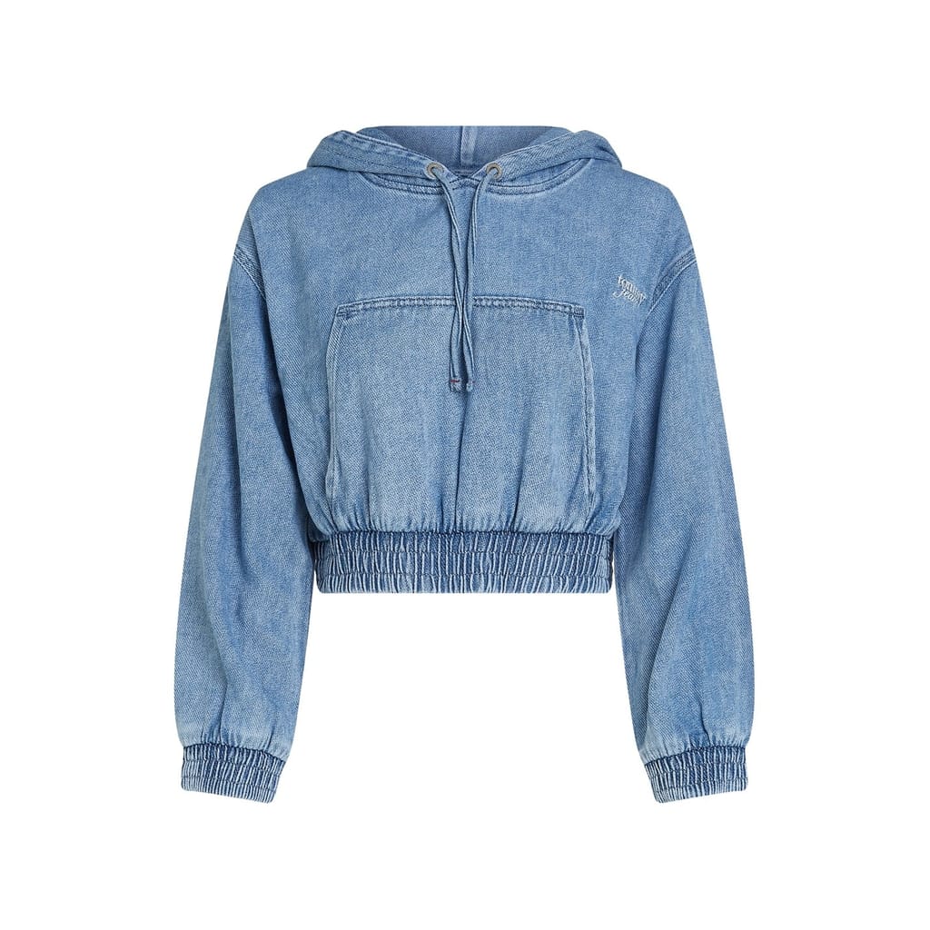 Discover the Tommy Jeans cropped sweatshirt, featuring a hooded neckline and drawstring closure. This hoodie style offers a regular fit with long sleeves and drop shoulders, complete with elasticated cuffs. It includes a kangaroo pocket and an embroidered logo, making it both functional and stylish. Ideal for those looking for a casual yet trendy top. -