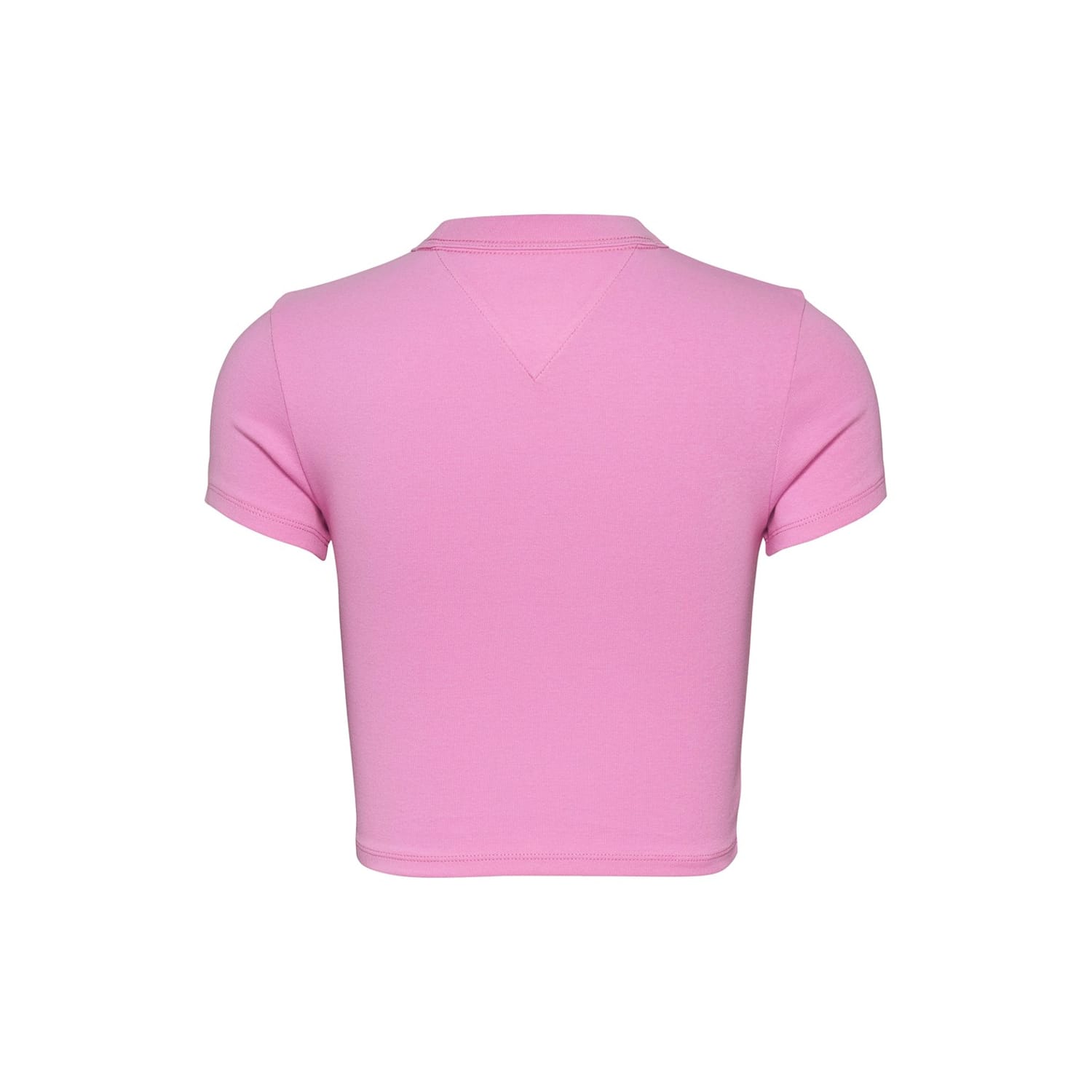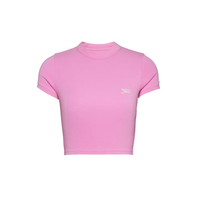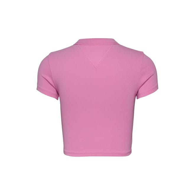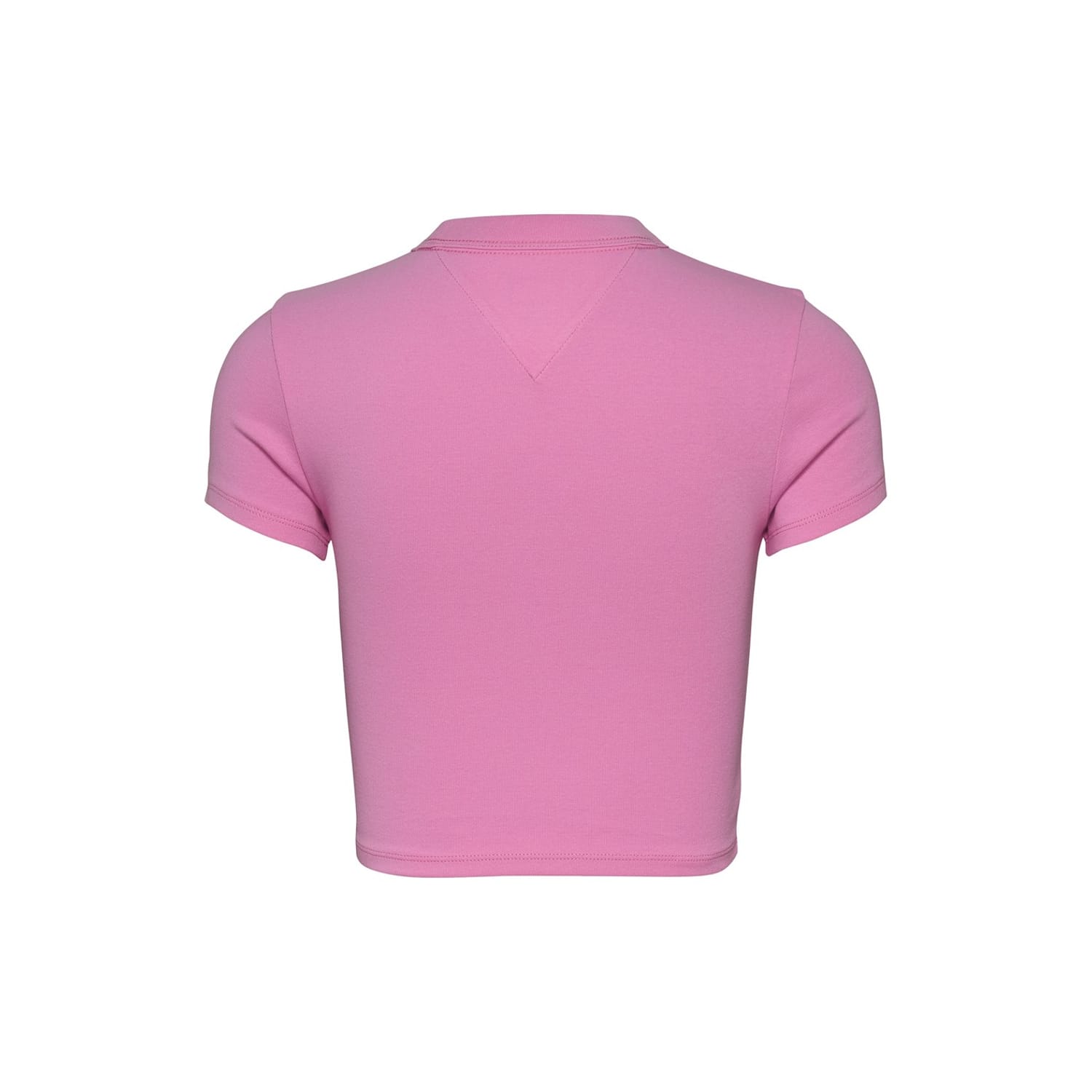 This Tommy Jeans cropped top is a casual essential, featuring a slim fit and a crew neck. The solid pattern and short sleeves offer a classic look, while the logo embellishment adds a touch of brand identity. -