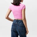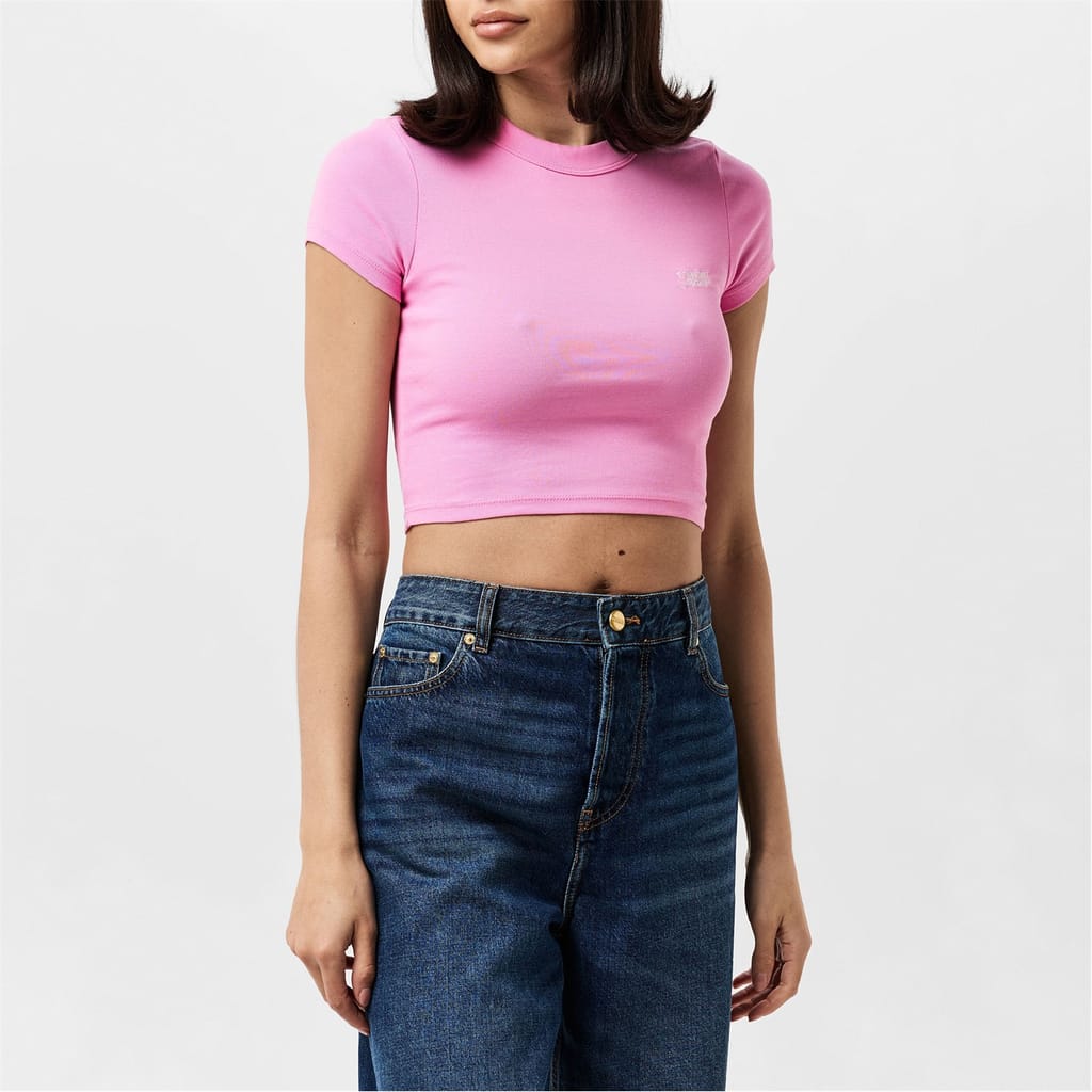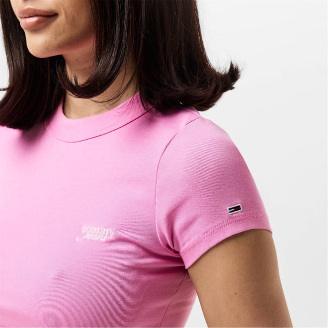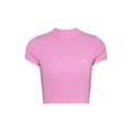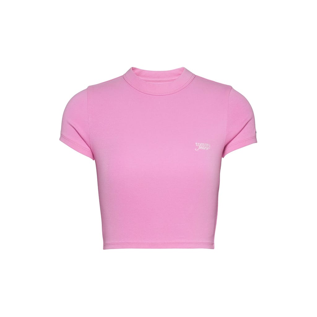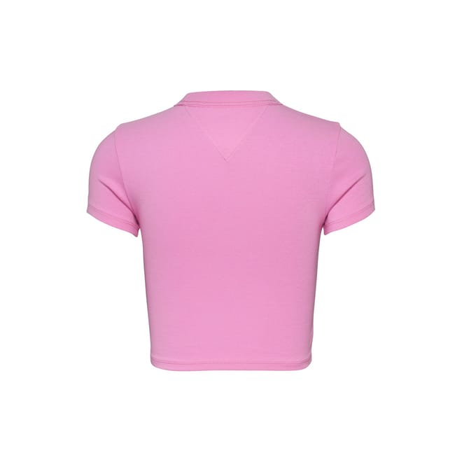 This Tommy Jeans cropped top is a casual essential, featuring a slim fit and a crew neck. The solid pattern and short sleeves offer a classic look, while the logo embellishment adds a touch of brand identity. -
