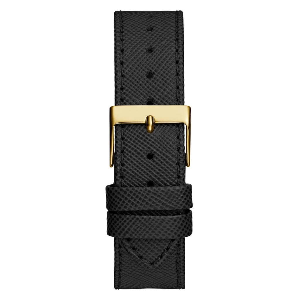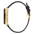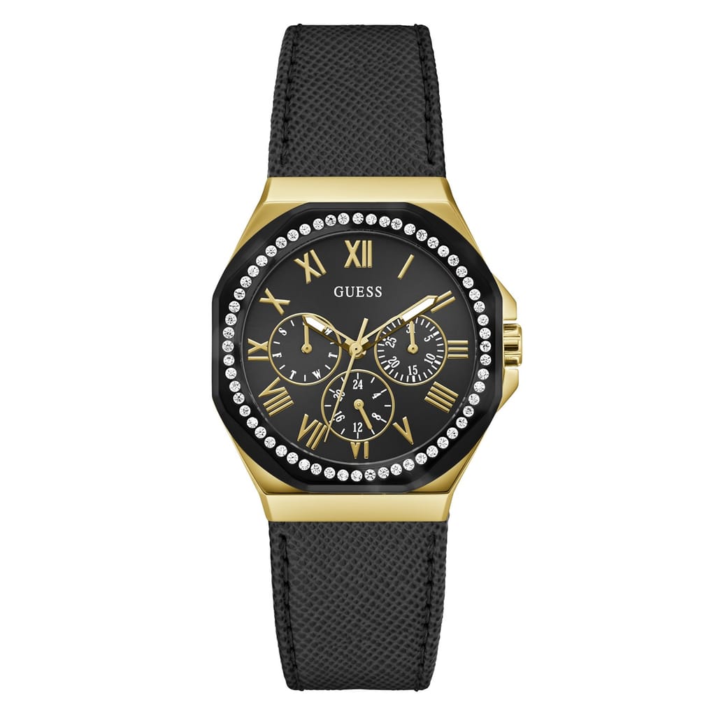 This new elevated look features a textured leather strap and a black stoned out top ring with a multi-function movement.