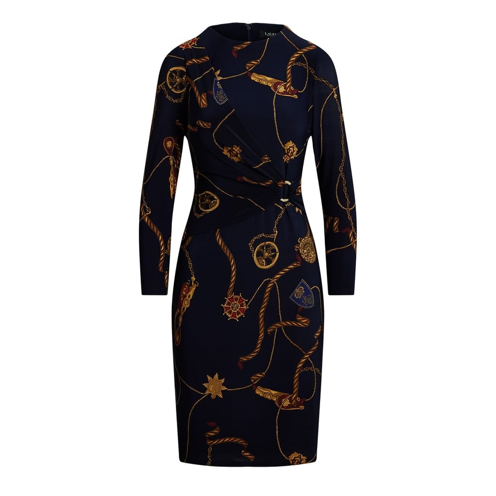 - Accented by an “LRL Lauren Ralph Lauren” engraved metal O-ring at the waist.