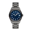 Armani Exchange's 42mm watch features a blue sandblast dial, three-hand date movement and gunmetal stainless steel bracelet.