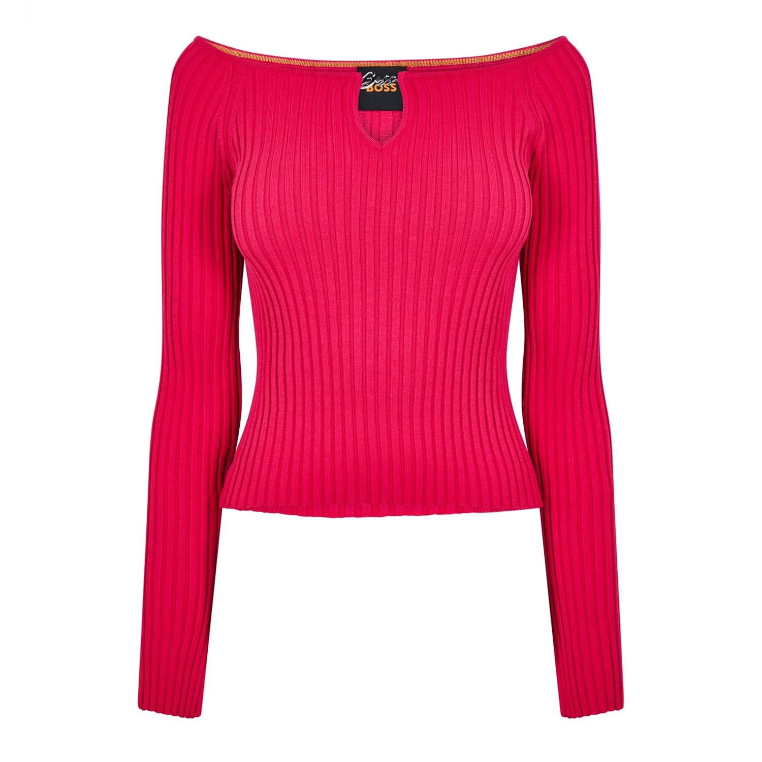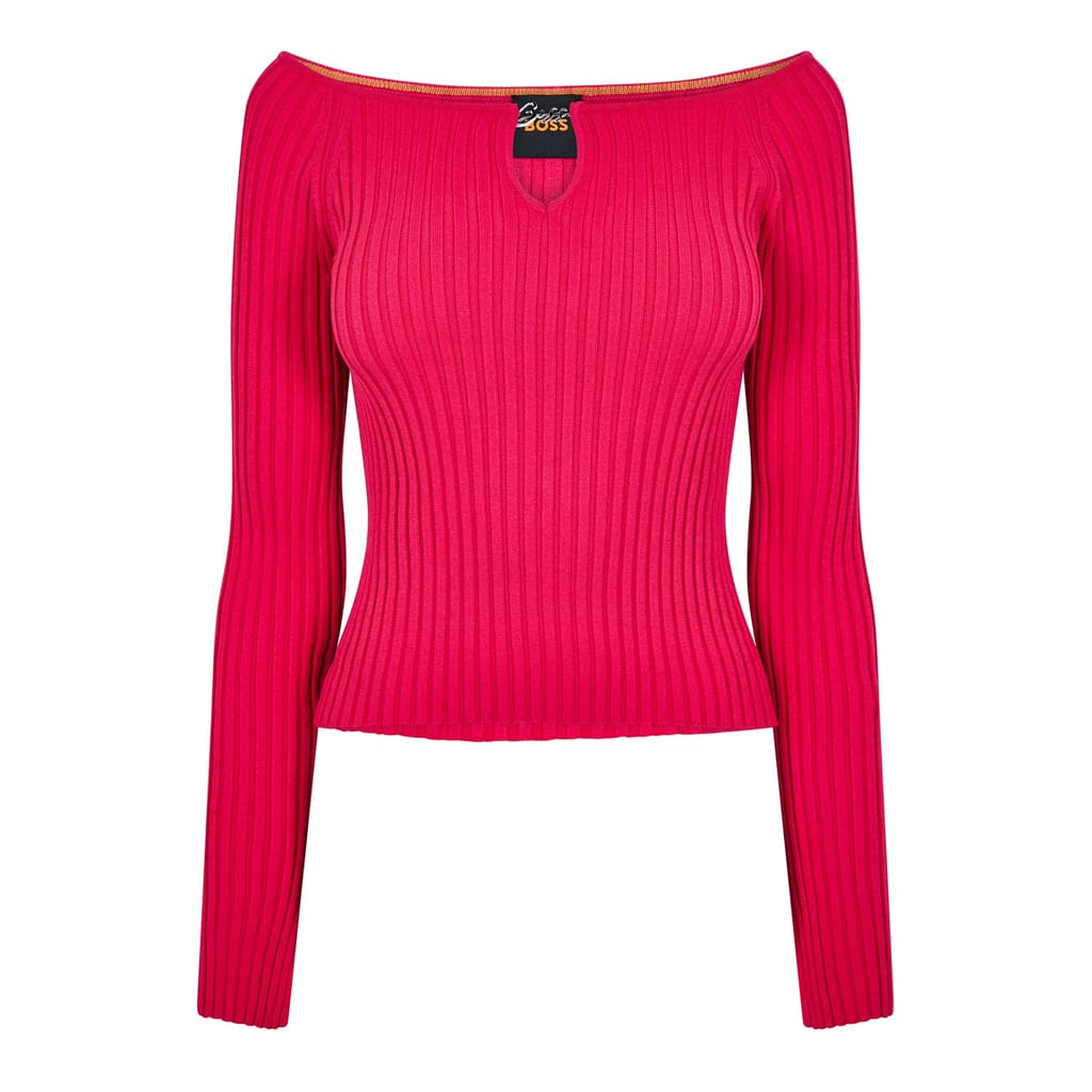 This Boss top features a boat neck and a slim fit, offering a sleek silhouette. Crafted with a ribbed pattern, it showcases a knit texture that adds depth to its design. The top is embellished with a subtle logo, adding a touch of brand identity. -
