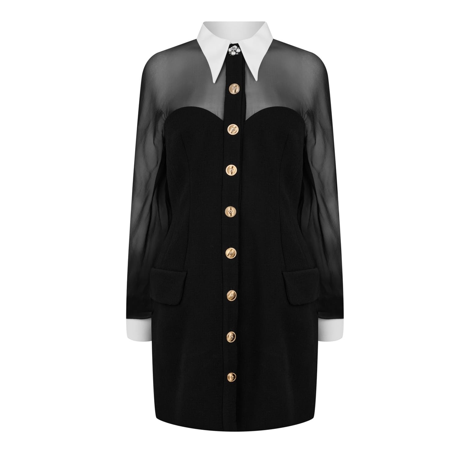 Versace exudes enchanting elegance, making captivating designs and eye-catching ensembles, expertly expressed in this Contrast-Collar Bustier Mini Dress. Made for moments of exquisite elegance this open back and pointed collar dress becomes the spotlight at sophisticated soirees, lavish parties and refined dinners.