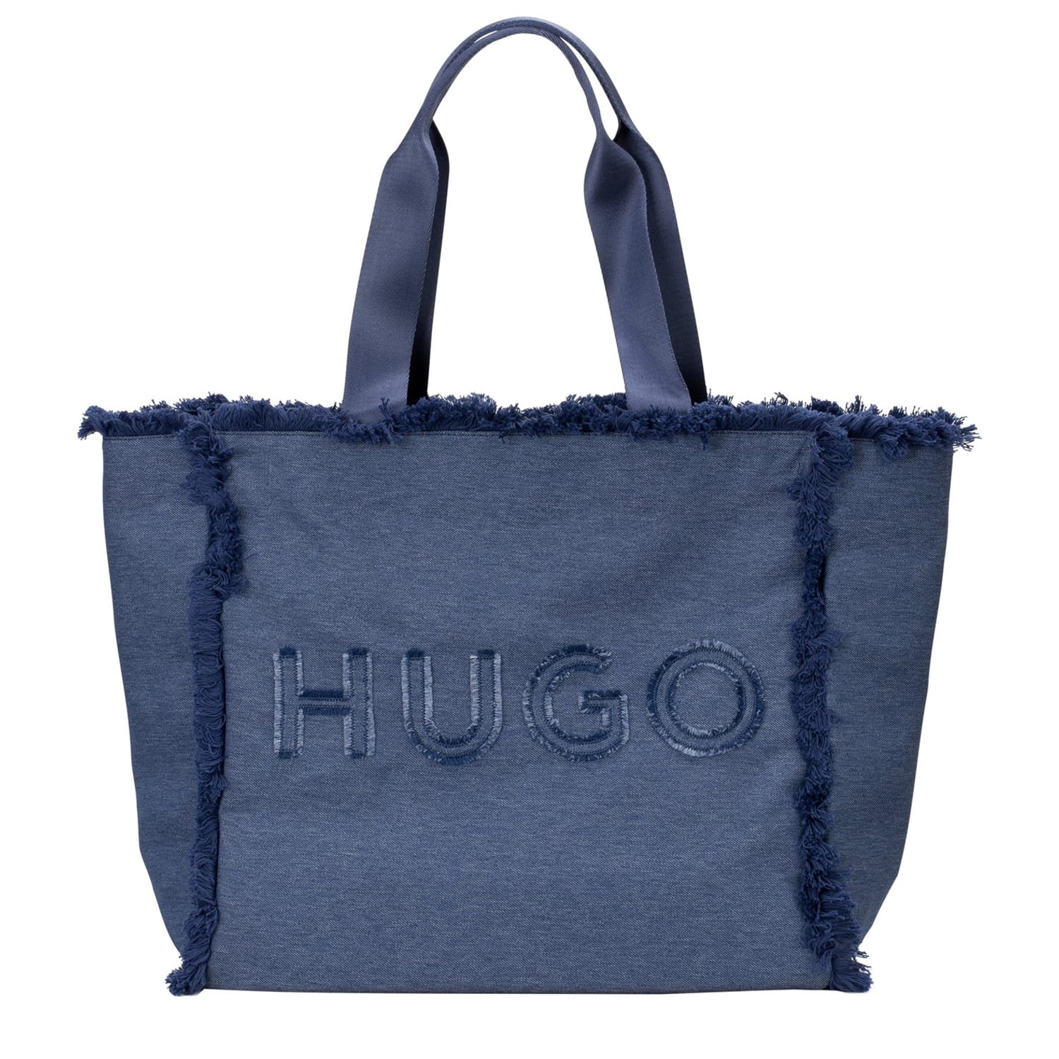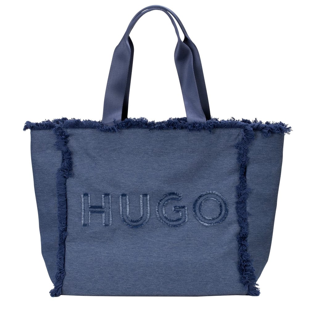 Discover the Hugo tote bag, a stylish accessory featuring a top handle for easy carrying. This elegant piece is adorned with a distinctive logo and fringe embellishments, adding a touch of sophistication to your ensemble. Perfect for those who appreciate both functionality and fashion in their everyday essentials. -