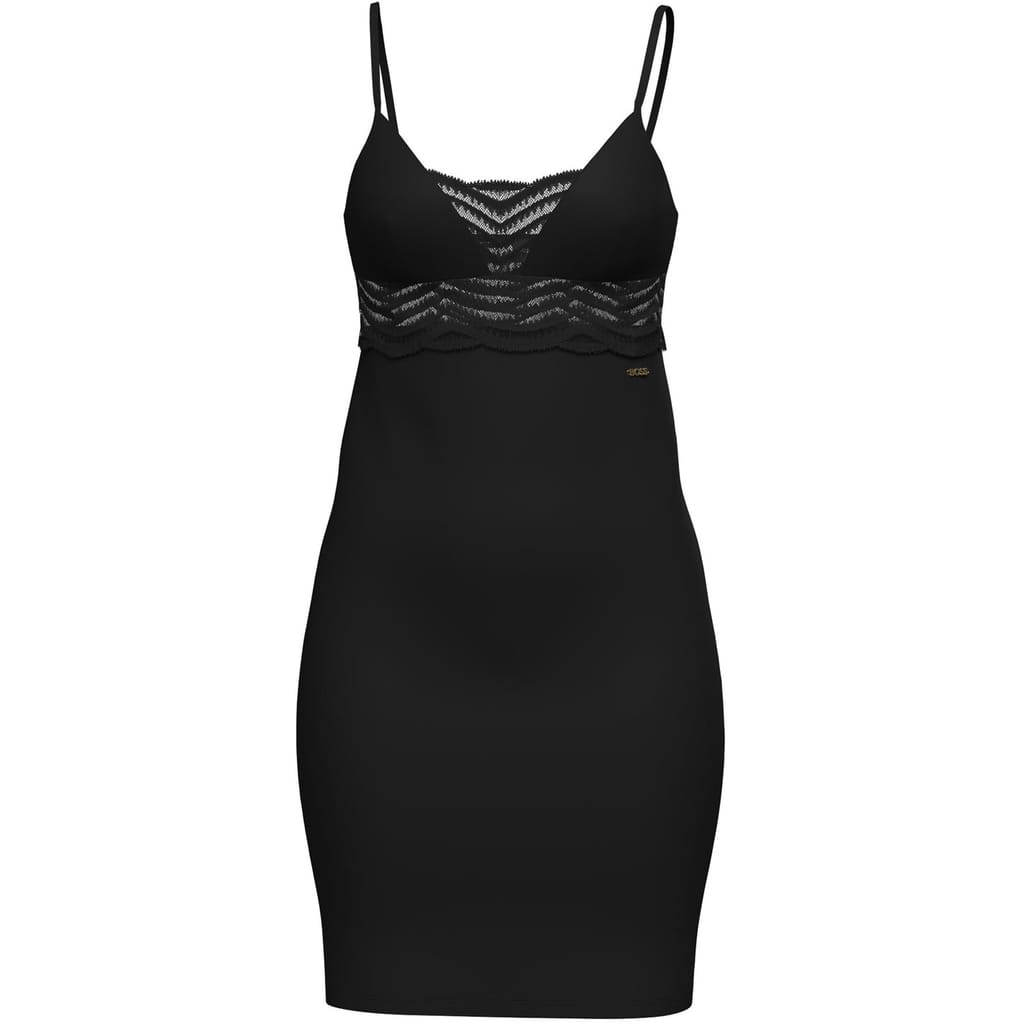 This Boss mini slip dress is a perfect blend of elegance and comfort. Featuring a V-neck and spaghetti straps, it offers a slim fit that accentuates your silhouette. The solid pattern is complemented by a delicate lace trim, adding a touch of sophistication. Ideal for loungewear, this dress is a stylish choice for any relaxed occasion. -