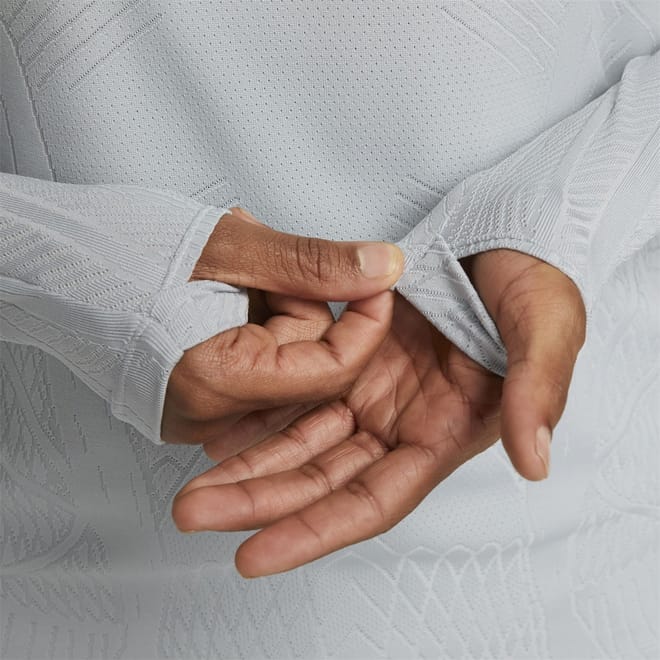 Elevate your training sessions with this Nike long sleeve t-shirt. Featuring a mock neck and a zipper closure, it offers a slim fit with raglan sleeves for enhanced mobility. The geometric pattern adds a modern touch, while the ribbed cuffs ensure a secure fit. Finished with a logo embellishment, this top is perfect for athletic pursuits. -