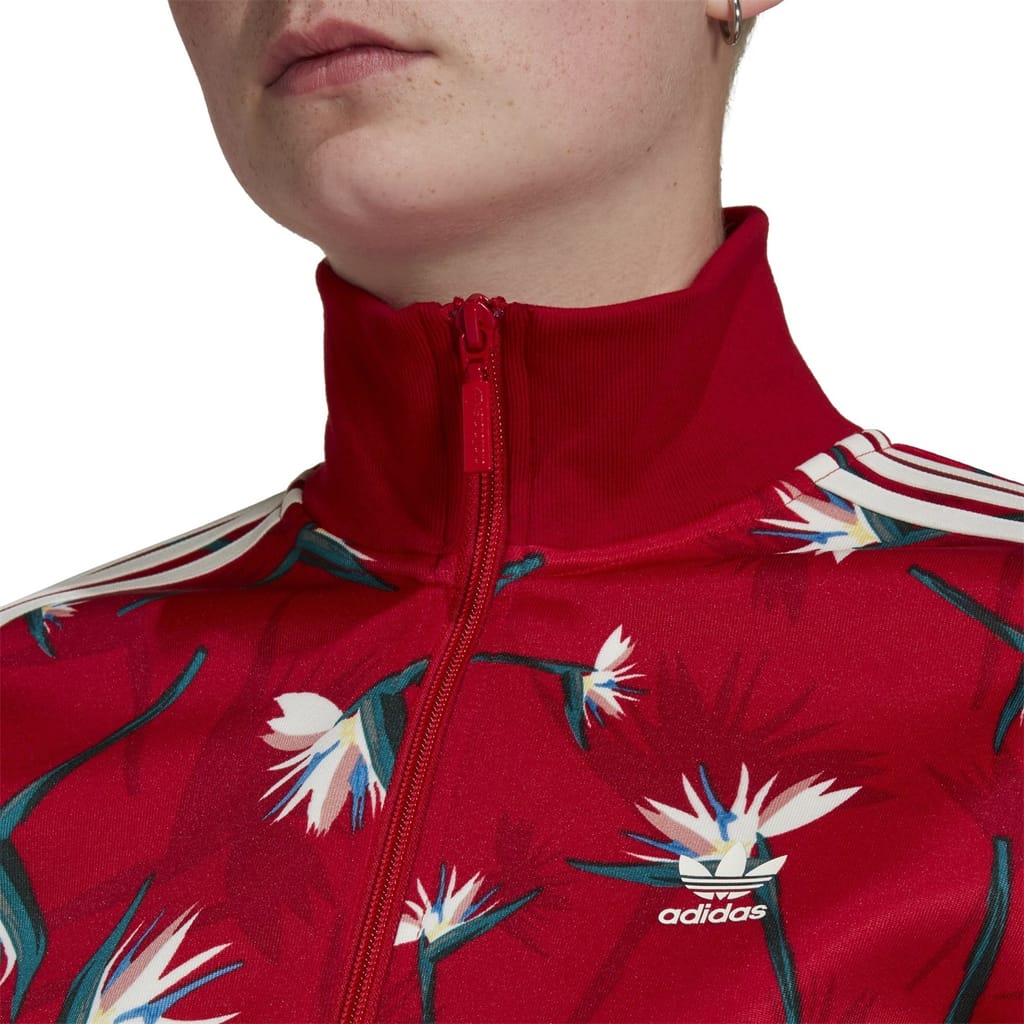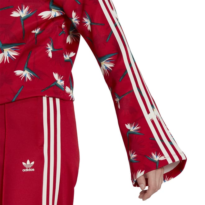 Elevate your activewear with this adidas Originals athletic top. Featuring a high neck and long bell sleeves, this cropped track top combines style and functionality. The floral pattern and logo embellishments add a touch of flair, while the zipper closure ensures a secure fit. Perfect for plus sizes. -