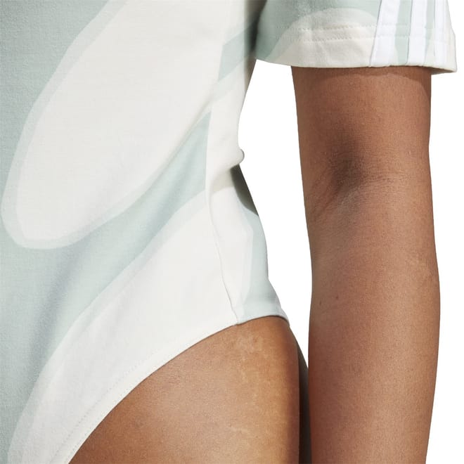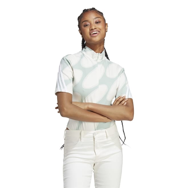 This adidas bodysuit is a standout piece in your wardrobe. Featuring a mock neck and a zipper closure, it offers a sleek and modern look. The short sleeves and slim fit ensure a flattering silhouette, while the abstract pattern adds a touch of unique style. Complete with the iconic logo embellishment, this bodysuit is both fashionable and functional. -