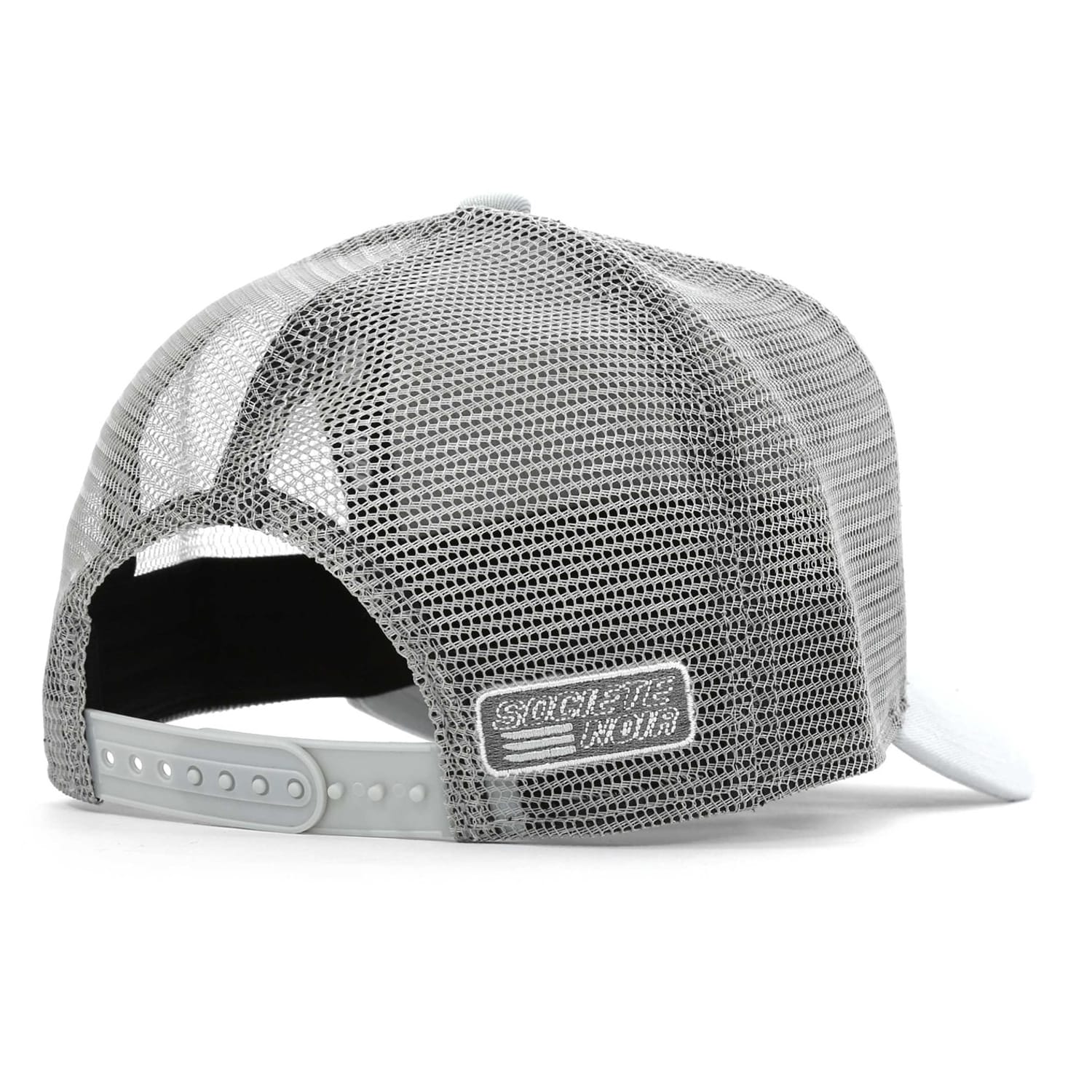 Discover the Societe Noir trucker cap, featuring mesh details for breathability and a snap-back closure for a comfortable fit. This cap is adorned with a patch and distinctive lettering, adding a unique touch to your style. Perfect for those who appreciate a blend of functionality and design. -